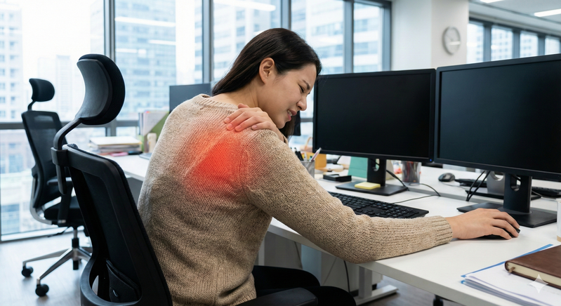 長期滑手機的烏龜頸、壓力過大造成的聳肩僵硬。