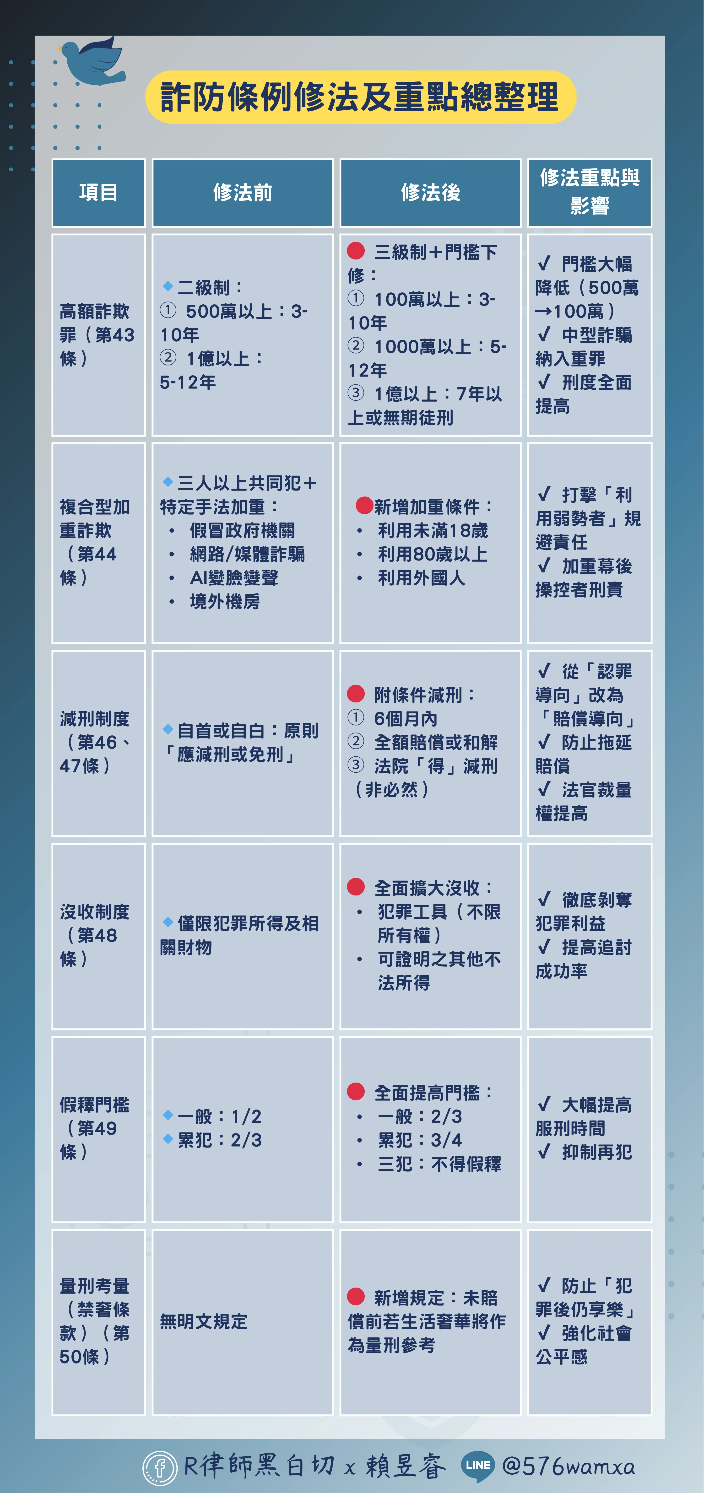 本次修法已從「單純處罰詐欺」轉變為「重刑化+財產剝奪+被害人優先+預防再犯」的全面打擊模式,不僅讓詐騙集團面臨更高刑責,也讓車手、人頭帳戶提供者、協助金流者,都難以再以「只是幫忙」為由規避責任。