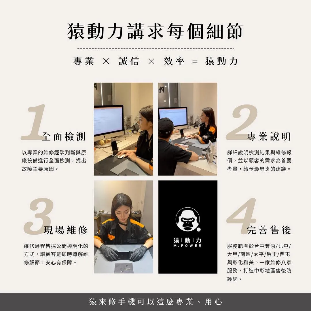 不論您前往哪一間猿動力門市皆可享有相同的維修品質、流程與售後保障。從檢測、維修到後續諮詢,遵循統一標準成為每一位顧客都能安心託付的維修夥伴。