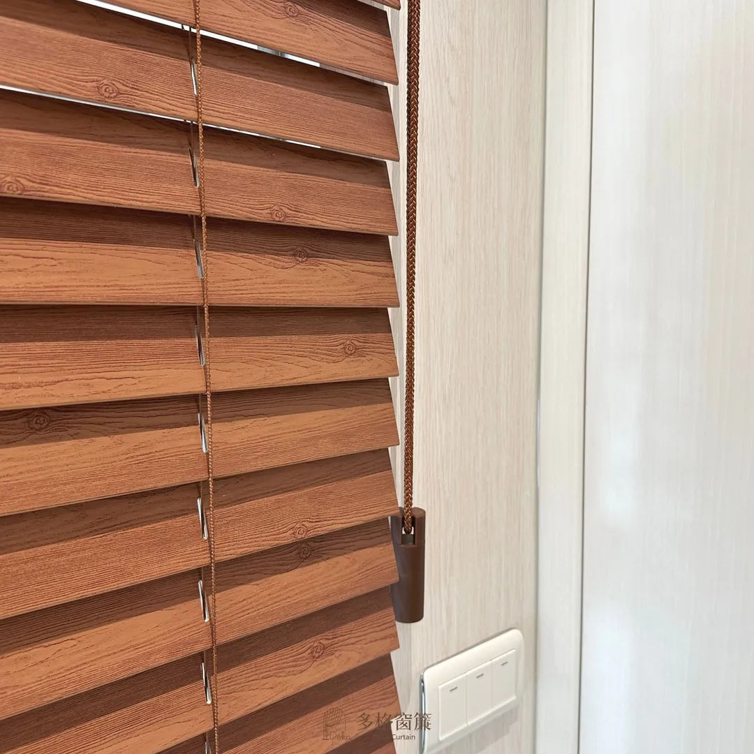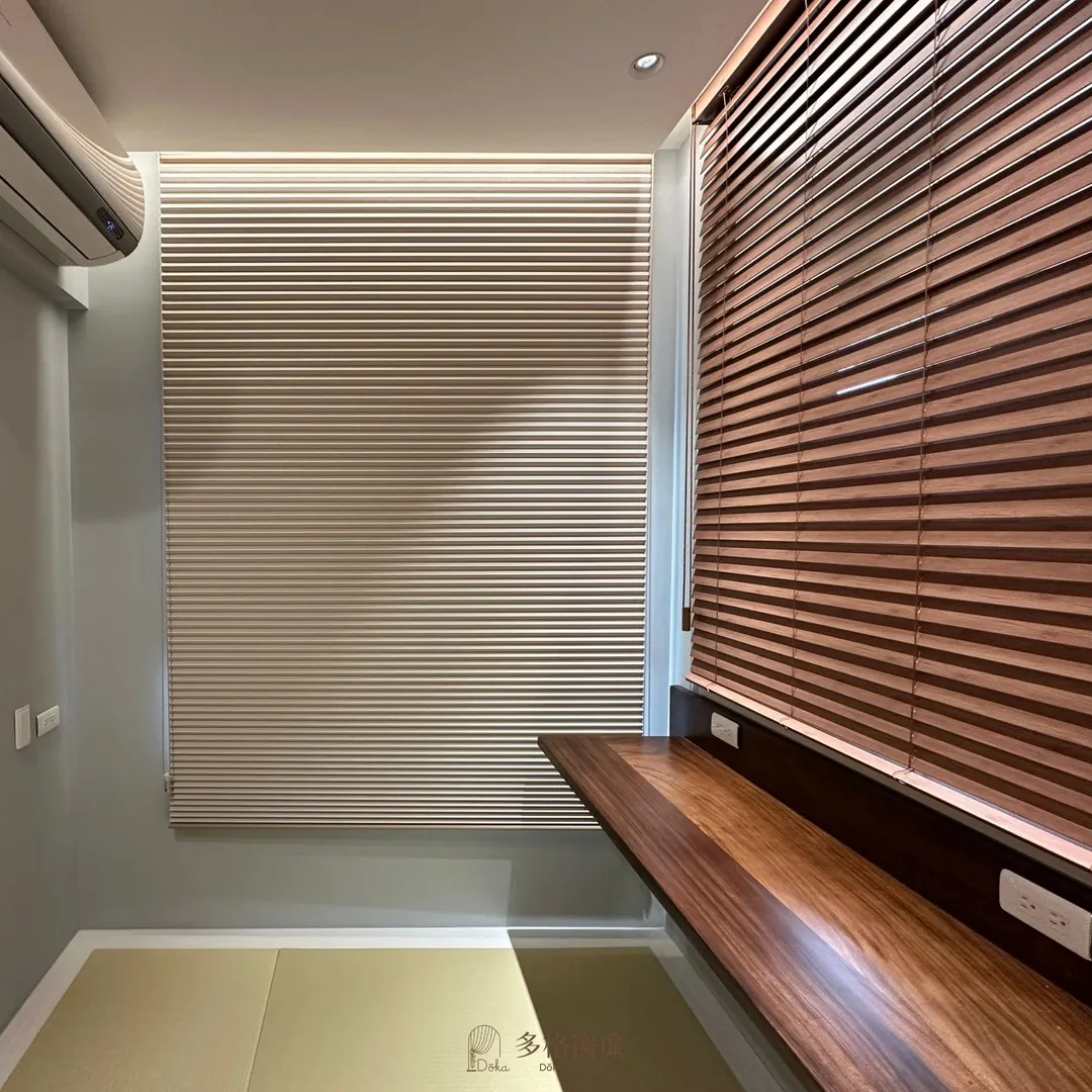 在這面玻璃上選擇搭配與書桌同色系的木百葉簾