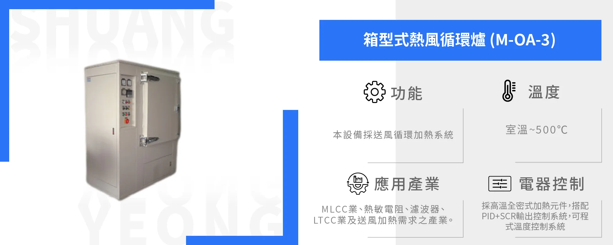 箱型式熱風循環爐廣泛應用於各種產業中,特別是對於需要高溫處理的產品。舉例來說,MLCC業(多層陶瓷電容器業)、熱敏電阻製造業、濾波器生產業、LTCC業(低溫共燒陶瓷業)等都是箱型式熱風循環爐的典型應用場景。此外,任何需要對產品進行高溫處理或熱處理的行業都可能使用到這種技術,例如金屬加熱處理、玻璃熔融等。