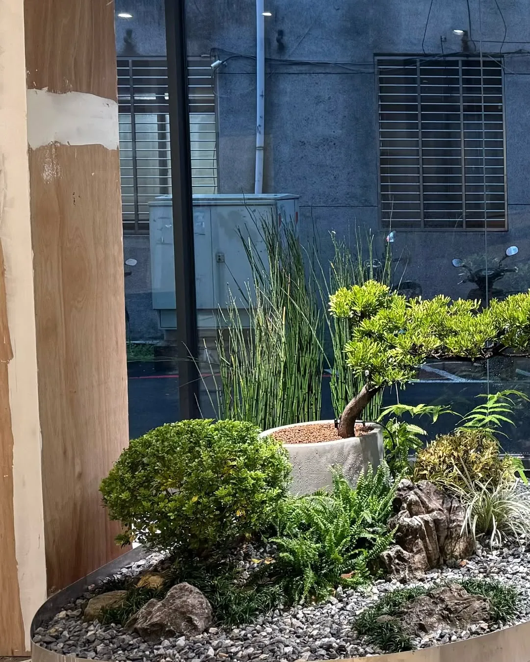 此次設計需滿足業主有大氣及圓滿豐富之需求,挑選相對耐陰可接受濕氣植栽,景石水缽與植栽前後相依附,配合上主副景樹木高低層次,特意在中央內縮的不鏽鋼板,可以走「近」被景觀包圍,使用植物燈營造氣氛與補足日照。