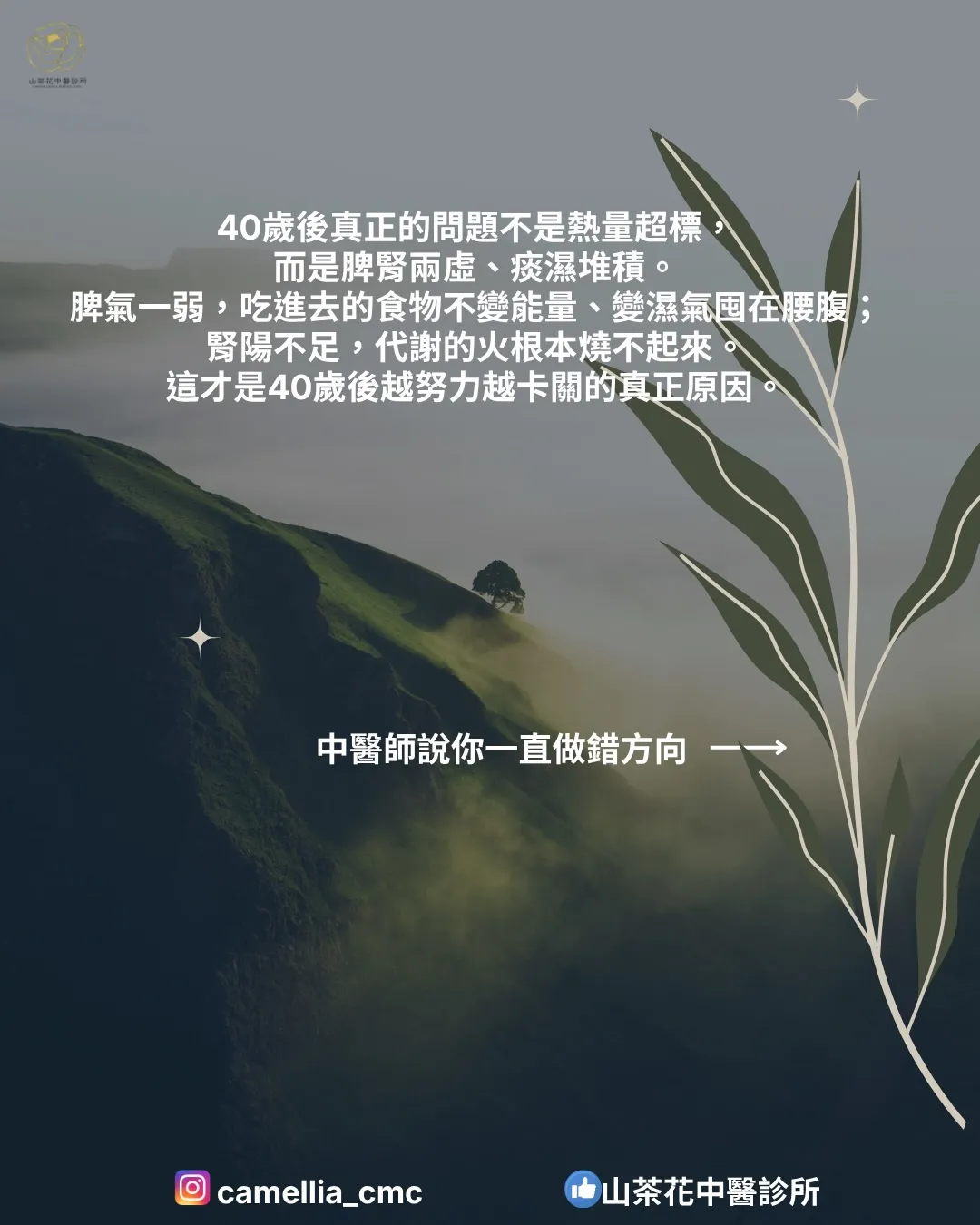40歲後真正的問題不是熱量超標,而是脾腎兩虛、痰濕堆積。脾氣一弱,吃進去的食物不變能量、變濕氣囤在腰腹;