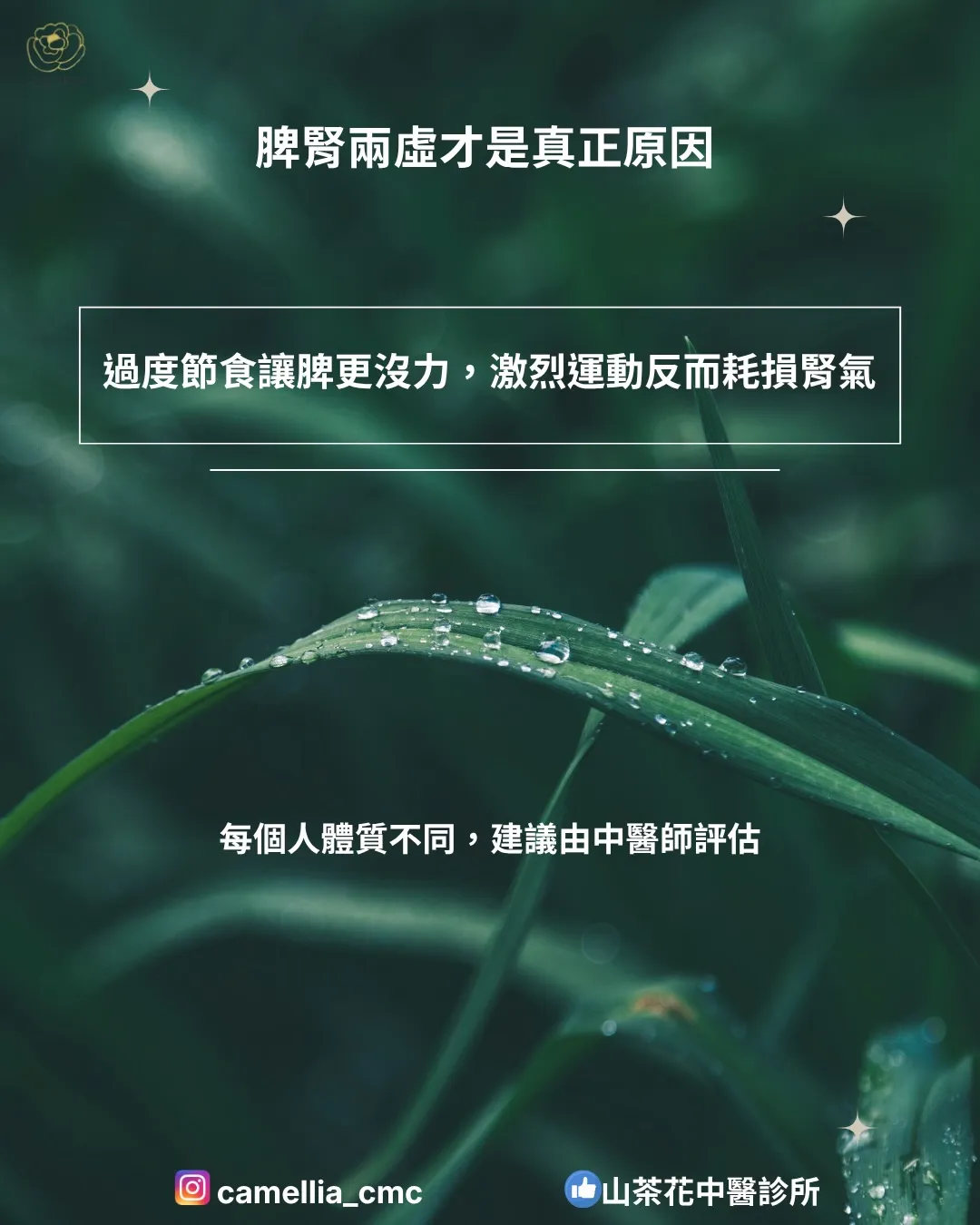 脾腎兩虛才是真正原因,過度節食讓脾更沒力,激烈運動反而耗損腎氣,但每個人體質不同,建議由中醫師評估。