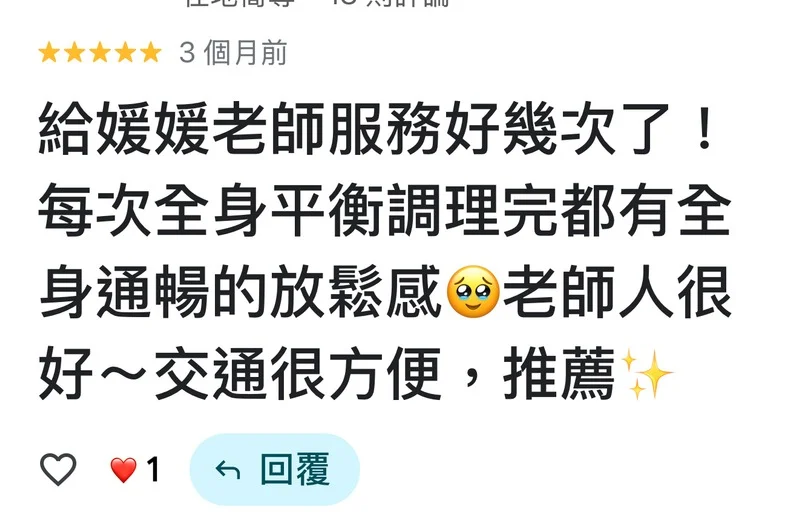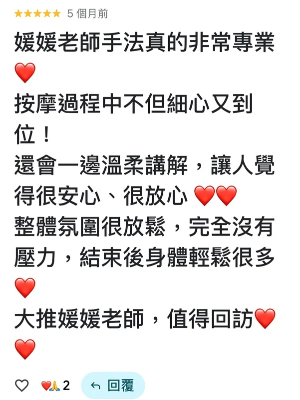 對於媛媛老師而言,按摩不只是肌肉的放鬆,更是一場溫暖的「身心充電」。