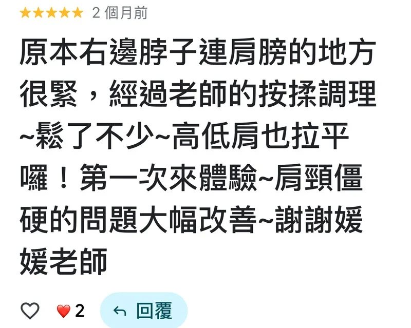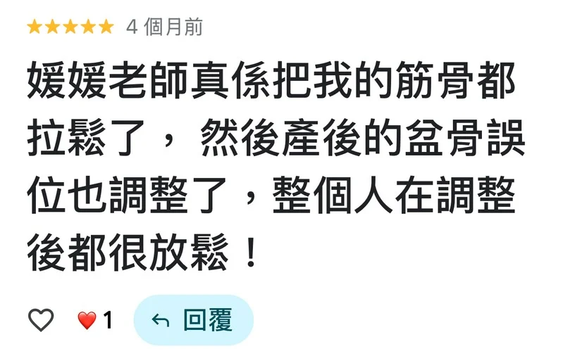 精準力道拿捏: 無論是需要扎實的深層按壓,還是極致的輕柔放鬆,她都能精準調整,深受回頭客好評。