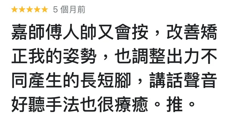 阿嘉老師在放鬆與矯正之間,為顧客找到最溫柔的平衡: