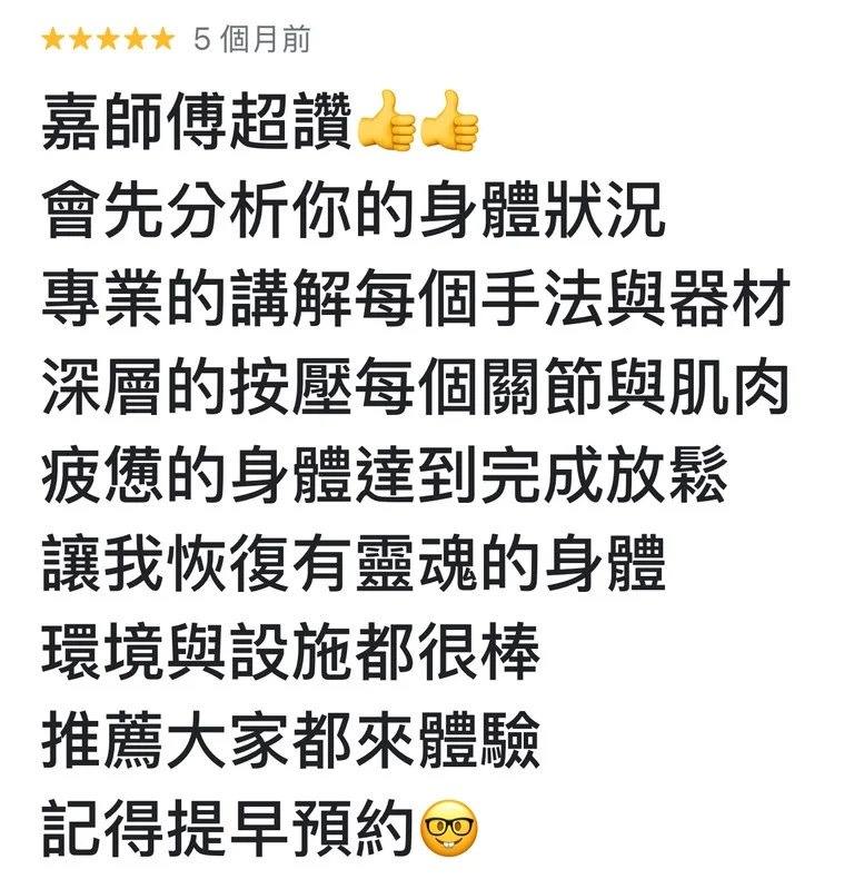 能精準找到你的痠痛點,用專業手法幫你把累積的疲勞「推開、排掉」。