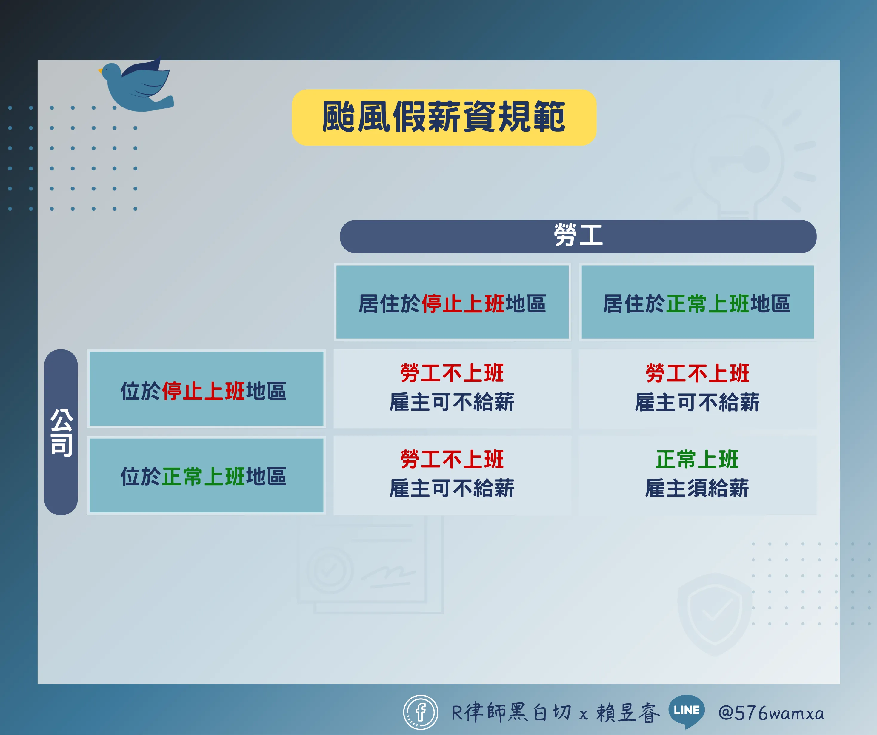 💡雇主針對「颱風假」可不給薪,如勞工依然正常出勤則給予正常上班薪水。