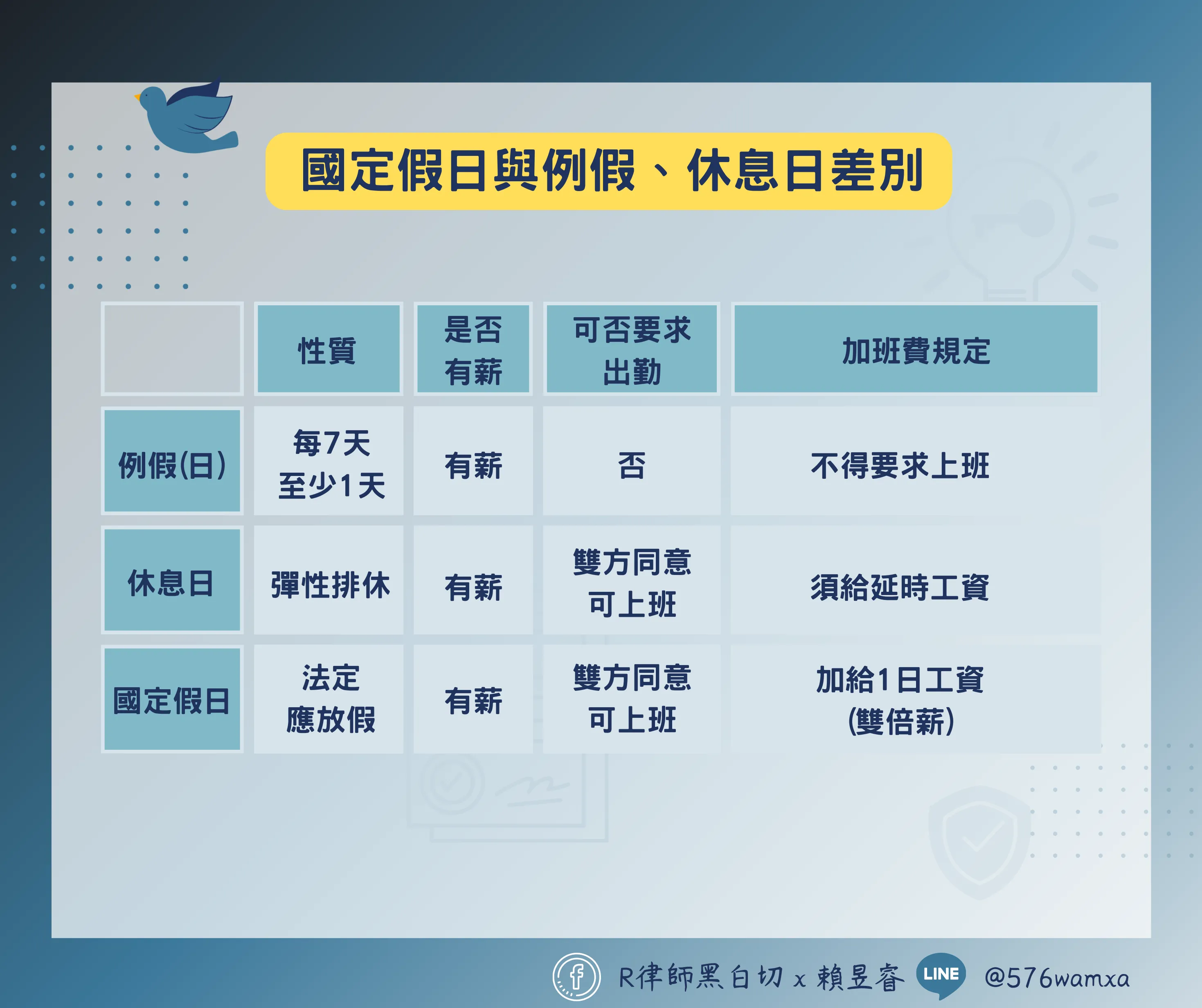 ——這些看似簡單的問題,其實牽涉到《勞動基準法》中例假、休息日、國定假日等不同性質的休假規範喔!