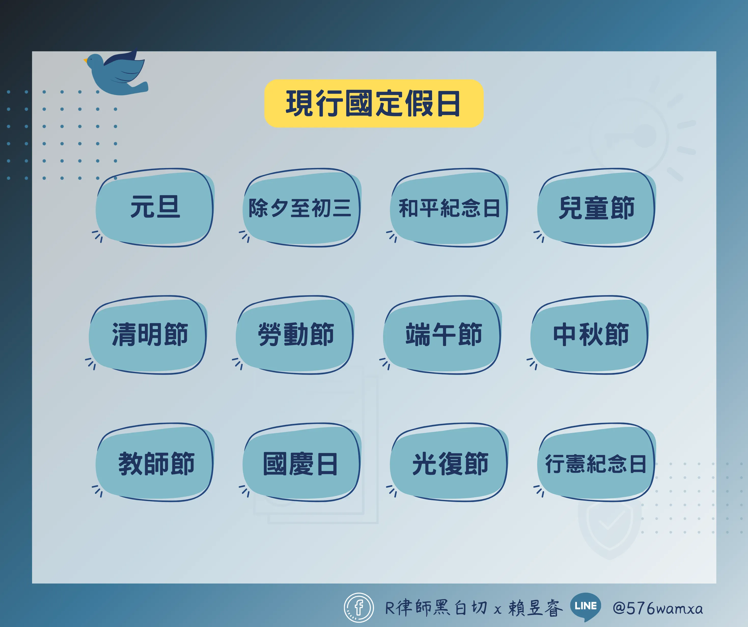 依《勞動基準法》第37條規定,政府公告的「應放假日」,即為國定假日。114年5月9日經立法院三讀通過,以及同年5月28日經總統公布,勞工每年將會有16日國定假日