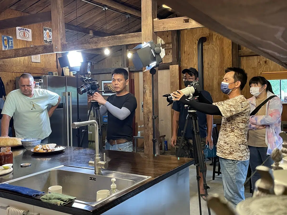 拍攝外景小組真的很是辛苦,我還記得拍攝當天2022年8月16日剛好是赤科山的花季,遊客特別多,為了閃過遊客可以拍到美麗畫面,花了很多時間等待,所以距離跟我們約好的拍攝時間己經差很久了,典型的德國人對於約好的時間是很準時的,到點還沒有出現的情況,安先生情緒己經開始浮動了,還好團隊助理即時出現緩和了一下他的情緒。