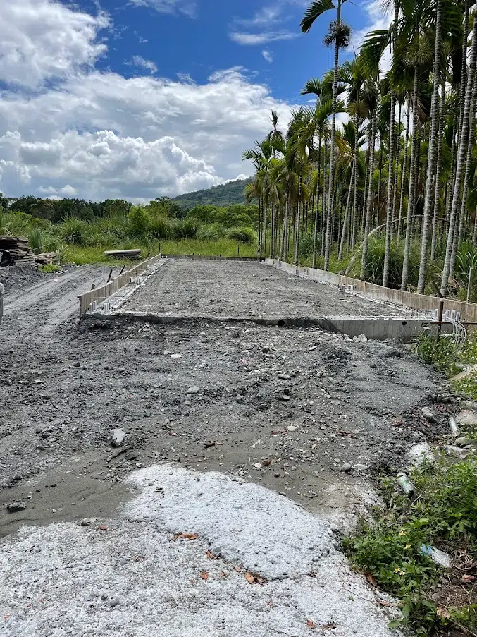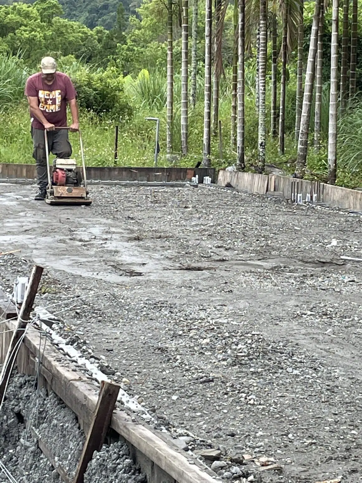 後來因為地震後,大部份的工程隊工程車及大型機具都去支援了,進度變的很慢雖然9月20日順利的叫到水泥車灌地樑漿(因為地震需的是拆除,不是建設),但卻一直等到10月2日才有工程車來幫我們填土,有怪手夯實地面。昨天安先生還是不死心的帶著自己的震動壓實機去壓地面(其實這台小機器是根本幫不忙,但安先生就是作心安的,多少盡點心力)