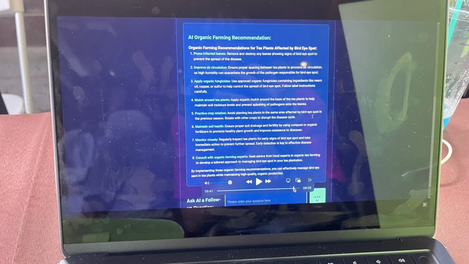 目前這個系統已能辨識8種常見茶葉病蟲害,並能根據茶園環境數據提供管理建議。未來,他們也希望持續優化AI模型,並擴大資料庫,將這個系統推廣到更多茶園,幫助他們更有效地管理茶園,提升茶葉的產量和品質,讓茶園管理現代化。
