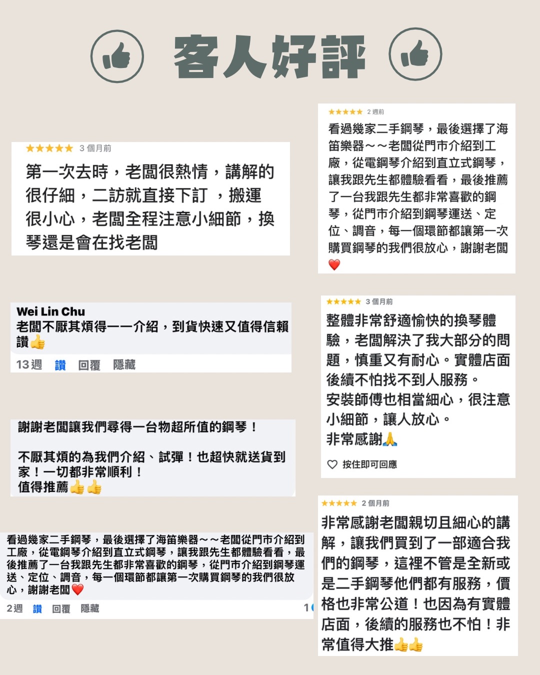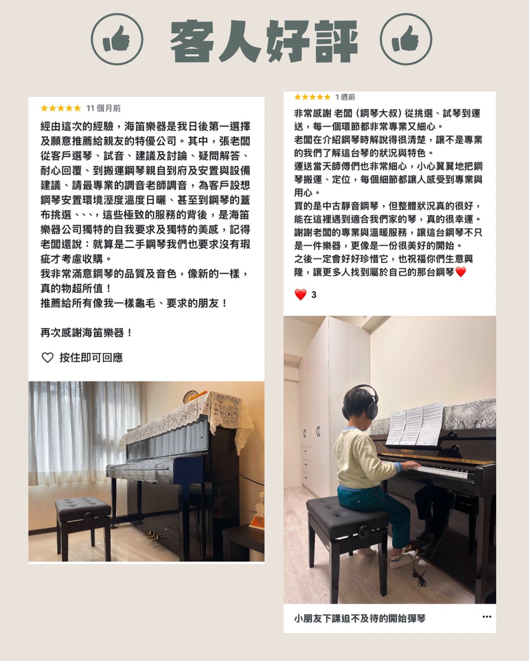 • 「鋼琴大叔」所經手的每一台中古鋼琴,都由海笛樂器的專業經理人/張老闆親自負責。從貨源篩選,到自有工廠的整修流程、品質控管,每個環節親力親為。誠懇親切的接待每一個客人,依照每個客戶的需求幫助客戶找到真正適合的那一台鋼琴。