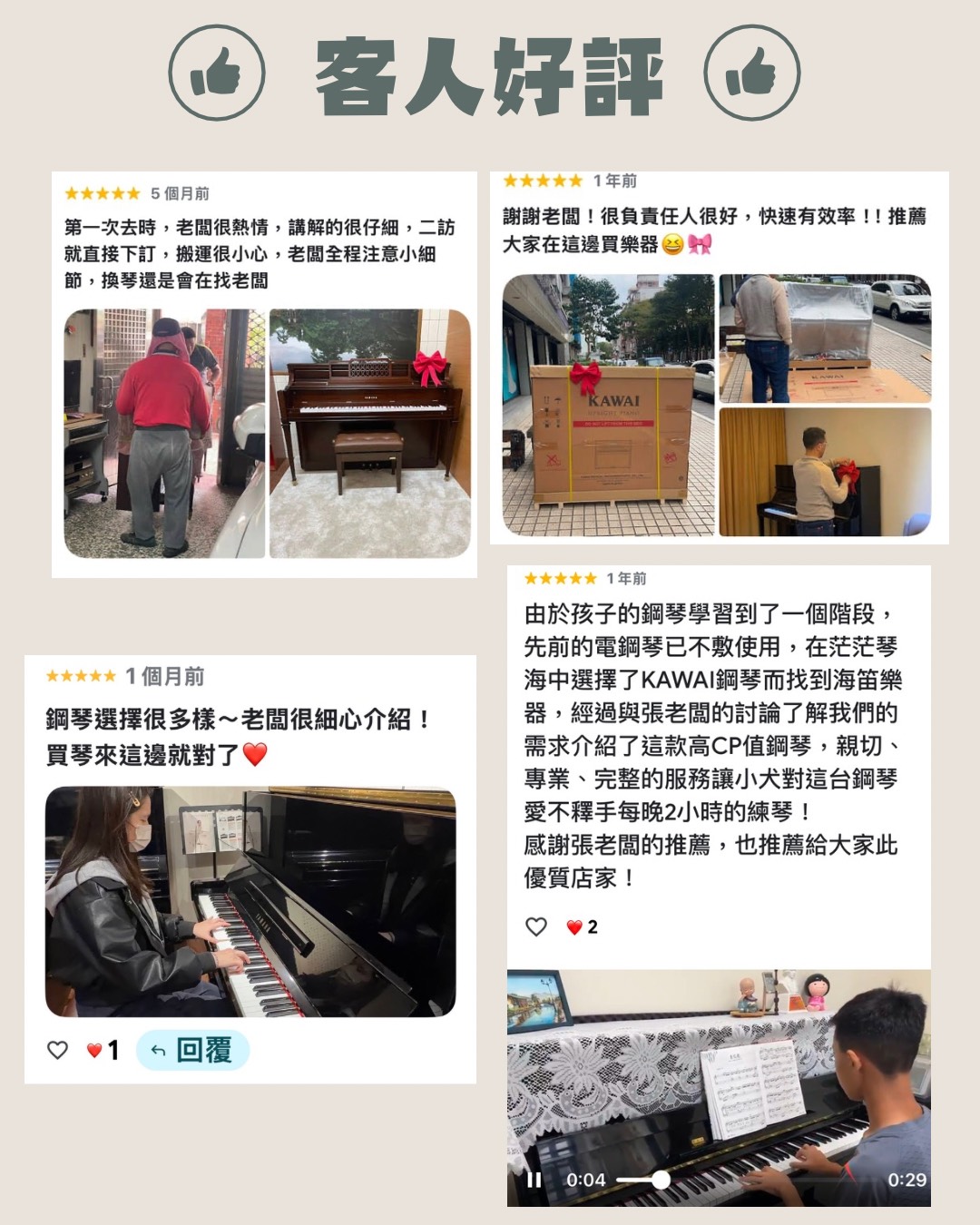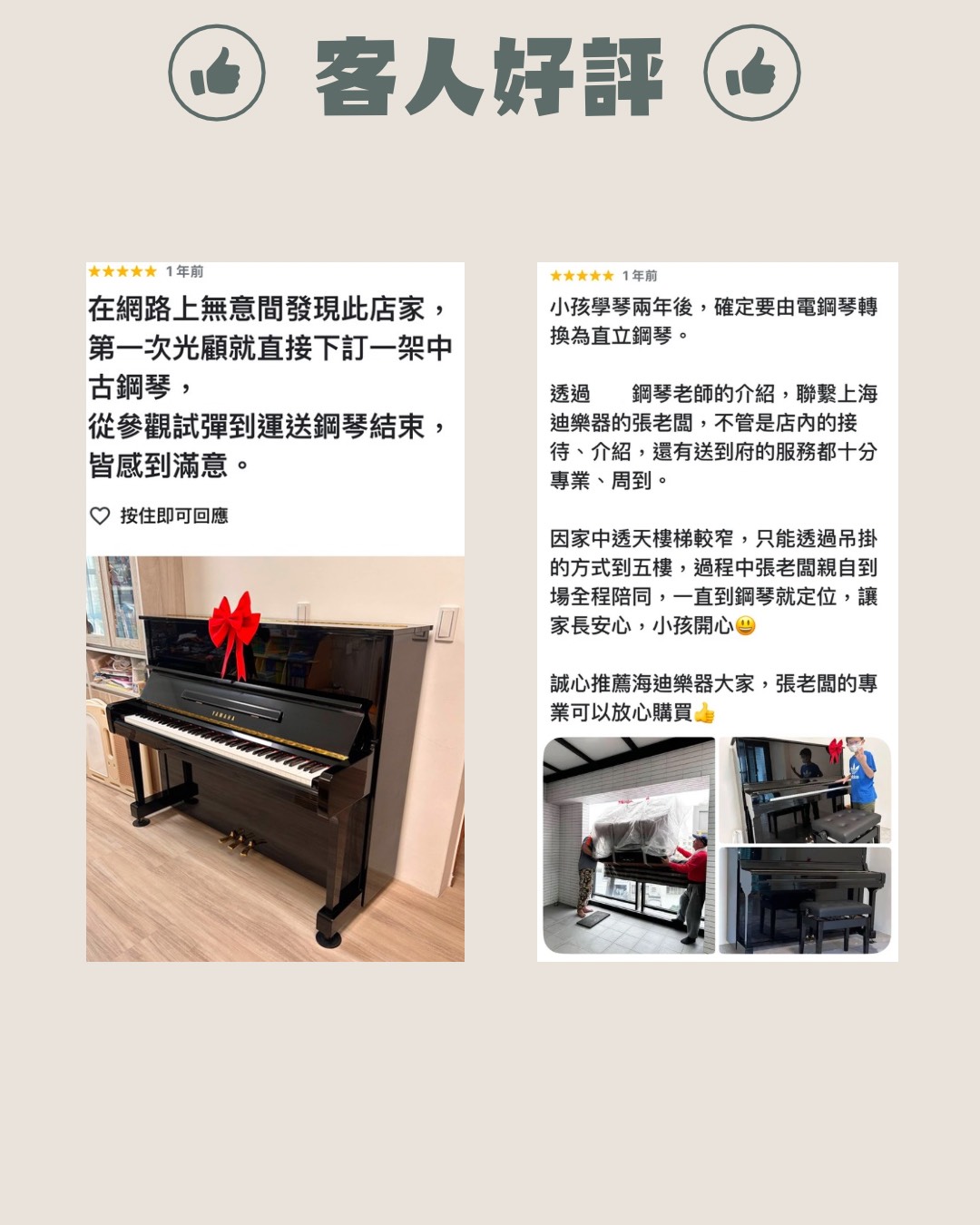 • 因著這份堅持,不管每台鋼琴售價高低、距離遠近,每一台鋼琴,張老闆都會親自送到府,監督搬琴師傅就定位、確認擺位後,親手為鋼琴綁上紅色蝴蝶結。