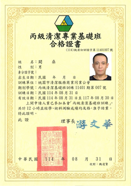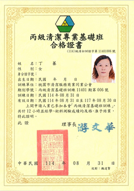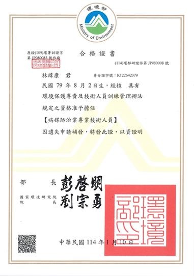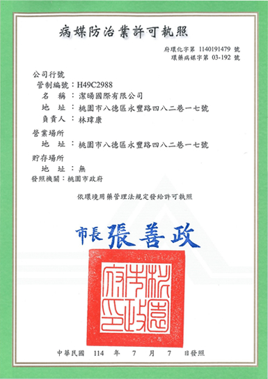 我們具備營業許可執照、清潔訓練以及施藥人員等相關合格證書,並持續對團隊進行教育訓練,確保作業安全與清潔品質。