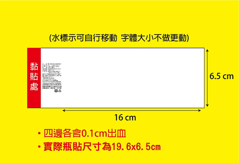 - 我們280ML的標籤高6.5公分,繞瓶身一圈滿版,版面非常大,廣告效果超好,使用防水紙張,而且印刷的解析度、亮度都完勝塑膠的膠膜。