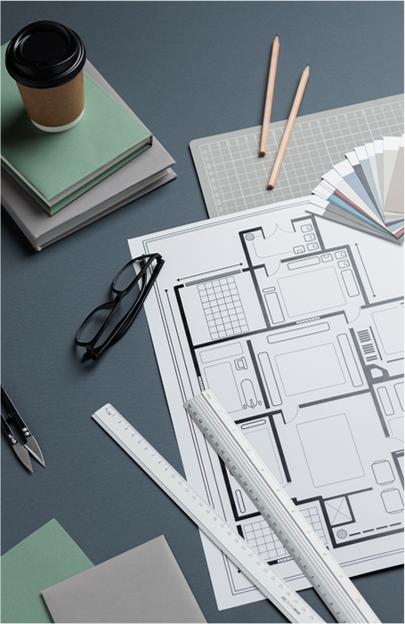 確認平面圖規劃後,進入設計圖面繪製階段(含尺寸、材質、配色風格等細節),同時與業主討論調整內容。