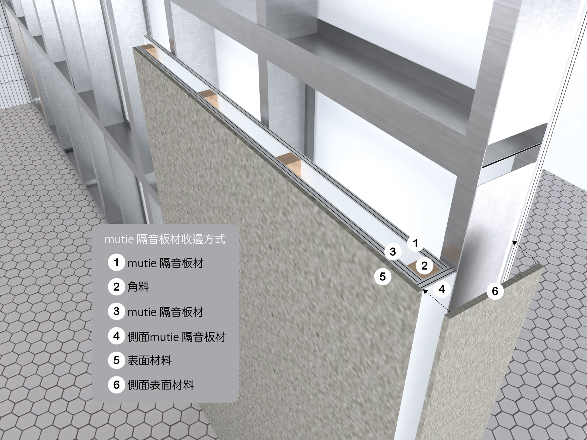 結構採用輕鋼架與莫聽隔音板材,能有效阻絕空氣聲傳遞,並可依美觀與功能需求搭配各式表面材料。