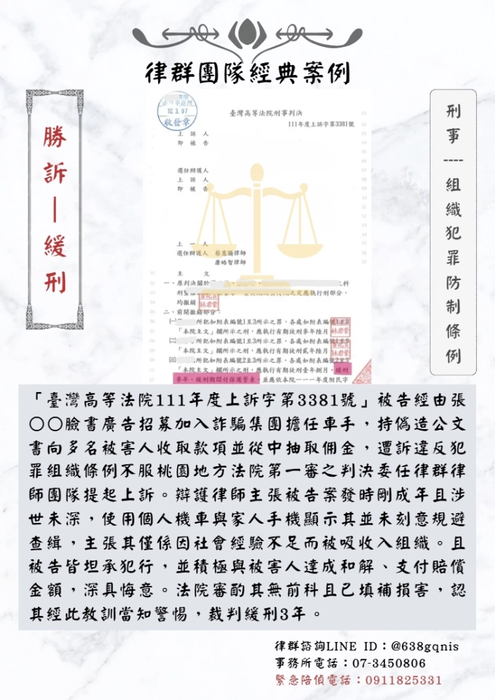 「臺灣高等法院111年度上訴字第3381號」被告經由張○○臉書廣告招募加入詐騙集團擔任車手,持偽造公文書向多名被害人收取款項並從中抽取佣金,遭訴違反犯罪組織條例不服桃園地方法院第一審之判決委任律群律師團隊提起上訴。辯護律師主張被告案發時剛成年且涉世未深,使用個人機車與家人手機顯示其並未刻意規避查緝,主張其僅係因社會經驗不足而被吸收入組織。且被告皆坦承犯行,並積極與被害人達成和解、支付賠償金額,深具悔意。法院審酌其無前科且已填補損害,認其經此教訓當知警惕,裁判緩刑3年。