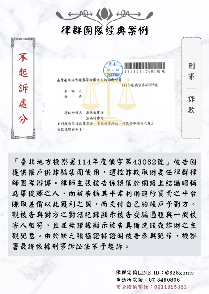 「臺北地方檢察署114年度偵字第43062號」被告因提供帳戶供詐騙集團使用,遭控詐欺取財委任律群律師團隊辯護。律師主張被告係誤信於網路上結識暱稱為羅俊輝之人,向被告稱其平常利用進行買賣之平台賺取差價以此獲利之詞,而交付自己的帳戶予對方。觀被告與對方之對話紀錄顯示被告受騙過程與一般被害人相符,且並無證據顯示被告具備洗錢或詐財之主觀犯意。由於缺乏積極證據證明被告參與犯罪,檢察署最終依據刑事訴訟法不予起訴。