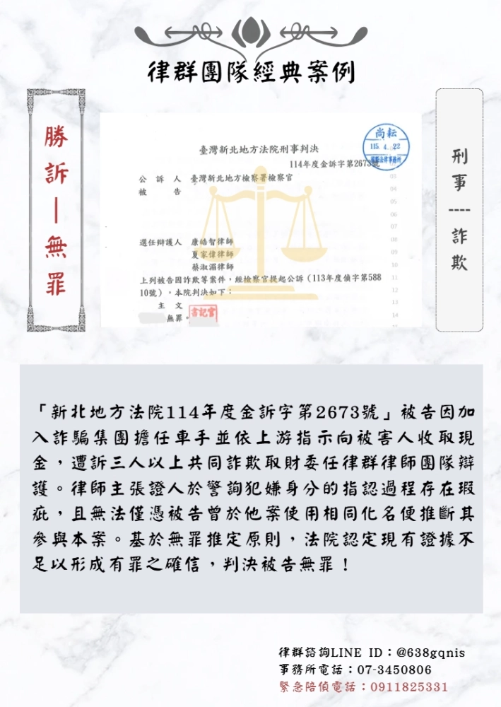 「新北地方法院114年度金訴字第2673號」被告因加入詐騙集團擔任車手並依上游指示向被害人收取現金,遭訴三人以上共同詐欺取財委任律群律師團隊辯護。律師主張證人於警詢犯嫌身分的指認過程存在瑕疵,且無法僅憑被告曾於他案使用相同化名便推斷其參與本案。基於無罪推定原則,法院認定現有證據不足以形成有罪之確信,判決被告無罪!