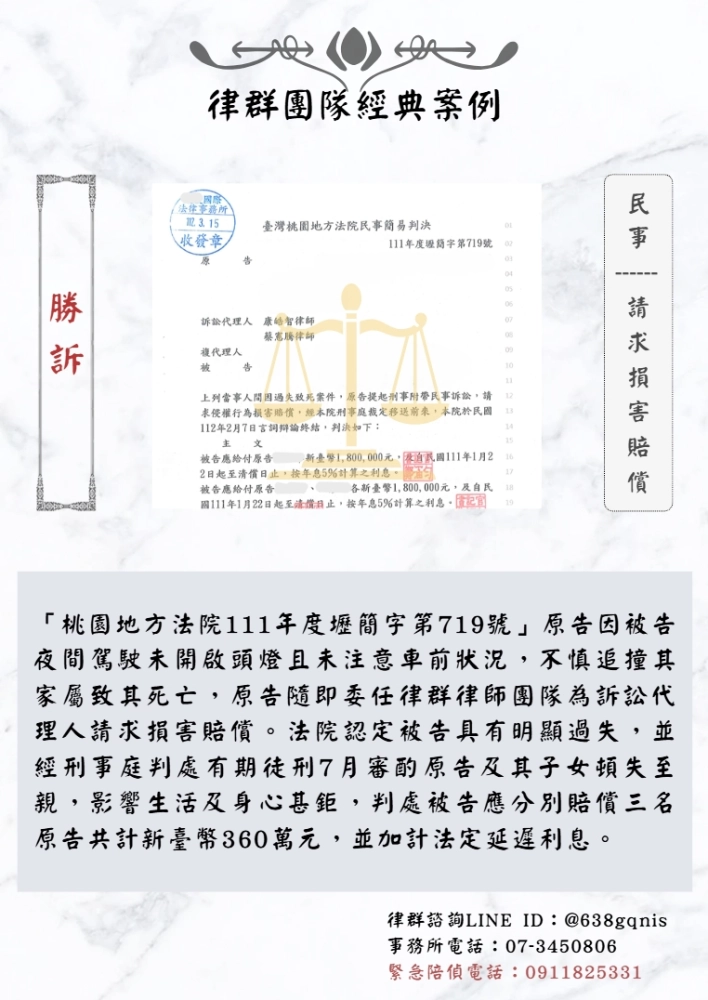 「桃園地方法院111年度壢簡字第719號」原告因被告夜間駕駛未開啟頭燈且未注意車前狀況,不慎追撞其家屬致其死亡,原告隨即委任律群律師團隊為訴訟代理人請求損害賠償。法院認定被告具有明顯過失,並經刑事庭判處有期徒刑7月審酌原告及其子女頓失至親,影響生活及身心甚鉅,判處被告應分別賠償三名原告共計新臺幣360萬元,並加計法定延遲利息。