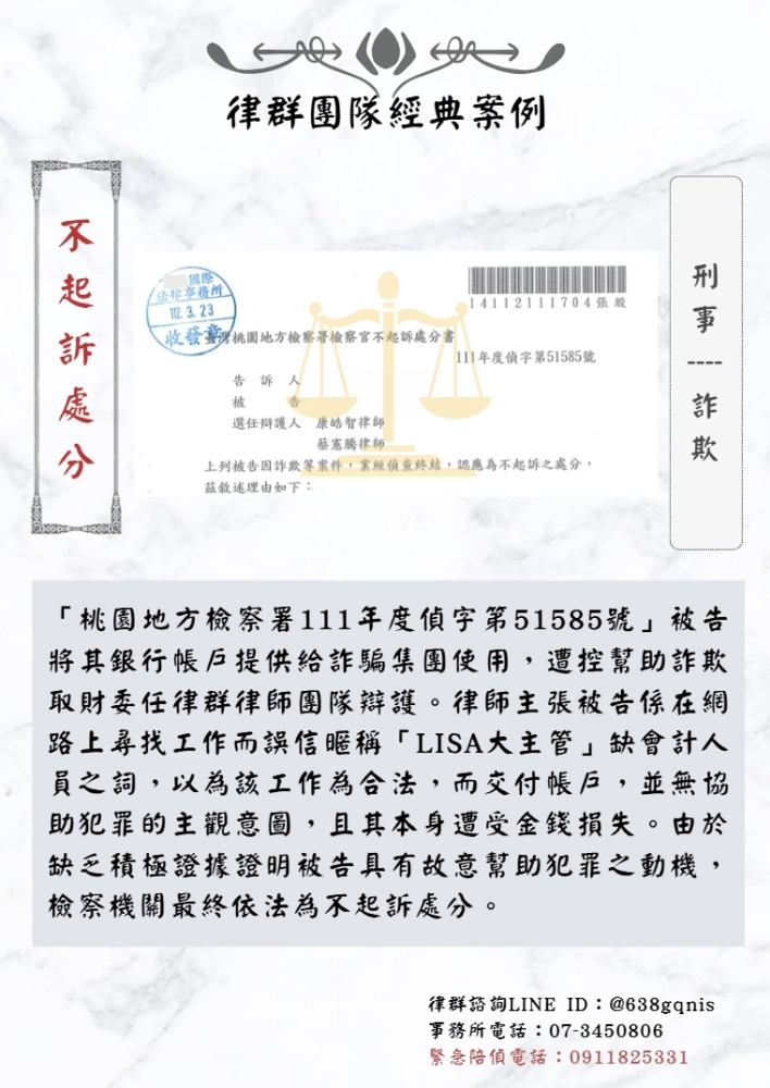 「桃園地方檢察署111年度偵字第51585號」被告將其銀行帳戶提供給詐騙集團使用,遭控幫助詐欺取財委任律群律師團隊辯護。律師主張被告係在網路上尋找工作而誤信暱稱「LISA大主管」缺會計人員之詞,以為該工作為合法,而交付帳戶,並無協助犯罪的主觀意圖,且其本身遭受金錢損失。由於缺乏積極證據證明被告具有故意幫助犯罪之動機,檢察機關最終依法為不起訴處分。