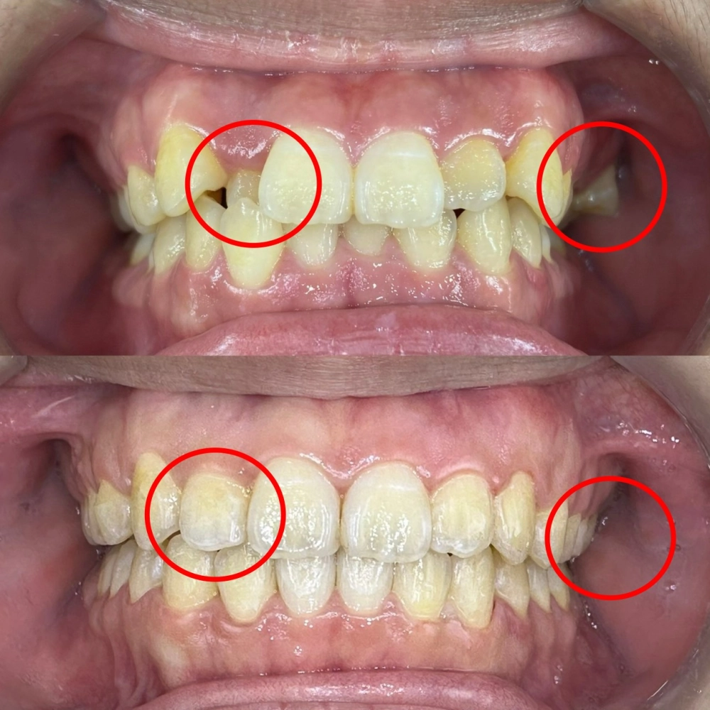 本診所於評估時,發現該病患有一顆前牙與一顆後牙錯咬的問題,影響咬合穩定與牙齒受力,同時門牙中線明顯偏移,造成笑容不對稱。經醫師完整檢查與矯正分析後,規劃合適的治療方式,並於療程中搭配橡皮筋輔助,引導牙齒與咬合關係逐步調整。隨著療程推進,前後牙錯咬獲得改善,門牙中線也成功對齊,不僅提升咀嚼功能,整體笑容更顯自然協調,達成兼顧功能與美觀的理想矯正成果。