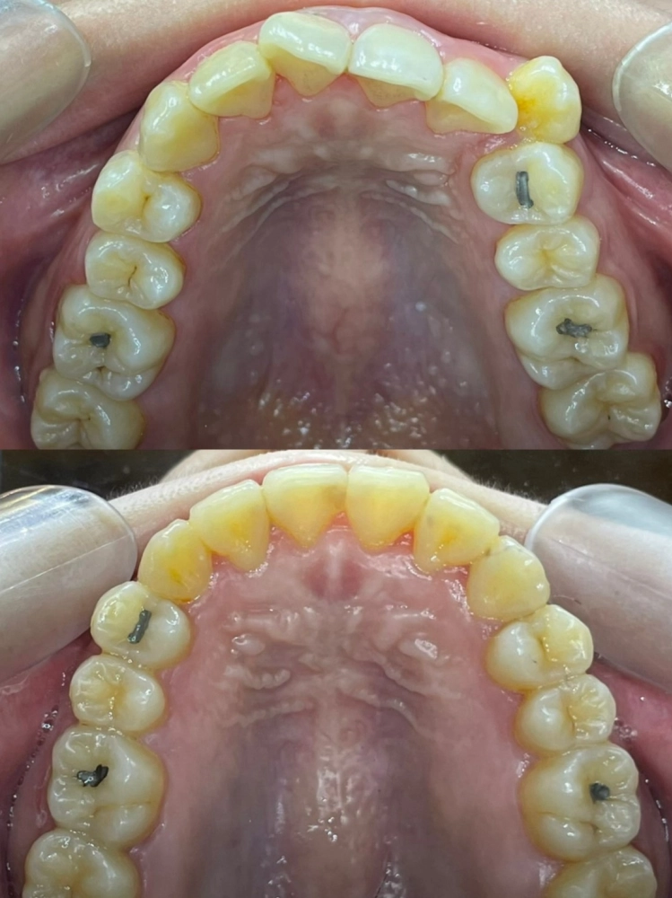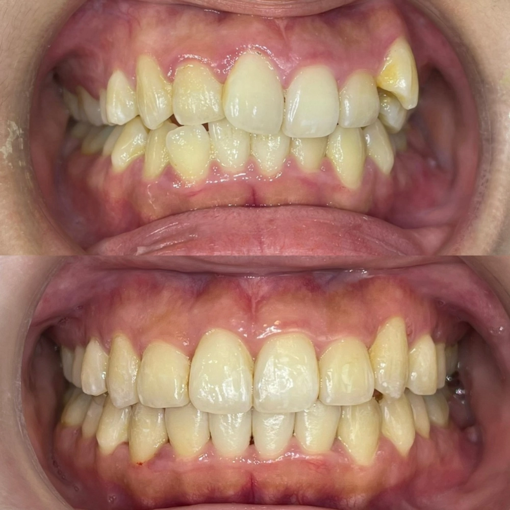 這位患者因虎牙高位造成牙齒擁擠,雖常被稱讚「小虎牙很可愛」,但她始終對笑容缺乏自信。直到參加華視演員面試時,被老師指出虎牙可能影響鏡頭表現,才決定諮詢矯正。經檢查發現,問題源於牙弓空間不足及上顎智齒向前推擠。我們先拔除上排兩顆智齒,利用原有空間讓牙齒後退,搭配擴弓、少量修牙縫調整中線,並使用橡皮筋輔助咬合。歷經一年七個月療程,牙齒排列整齊,患者也重拾面對鏡頭的自信笑容。