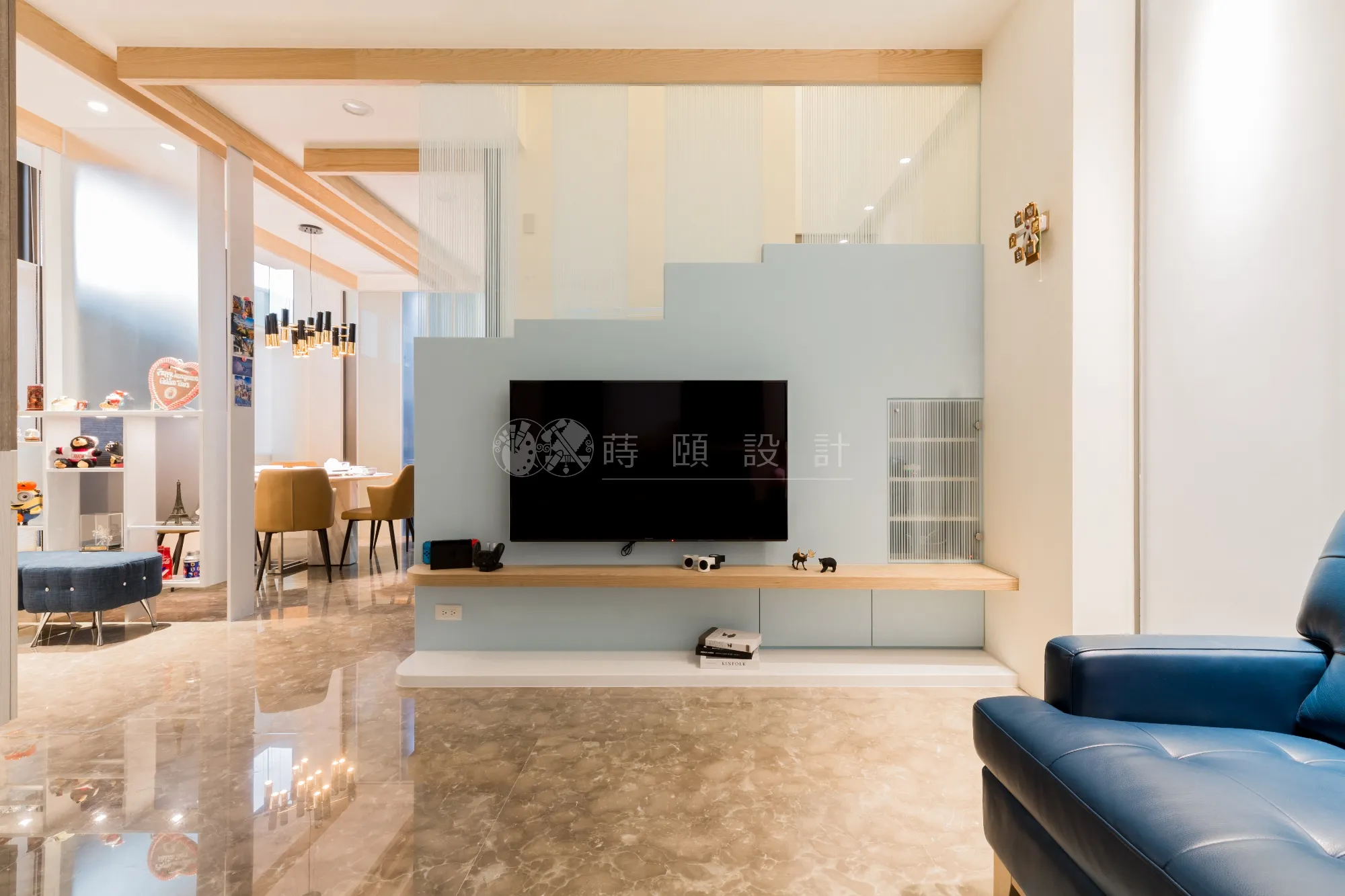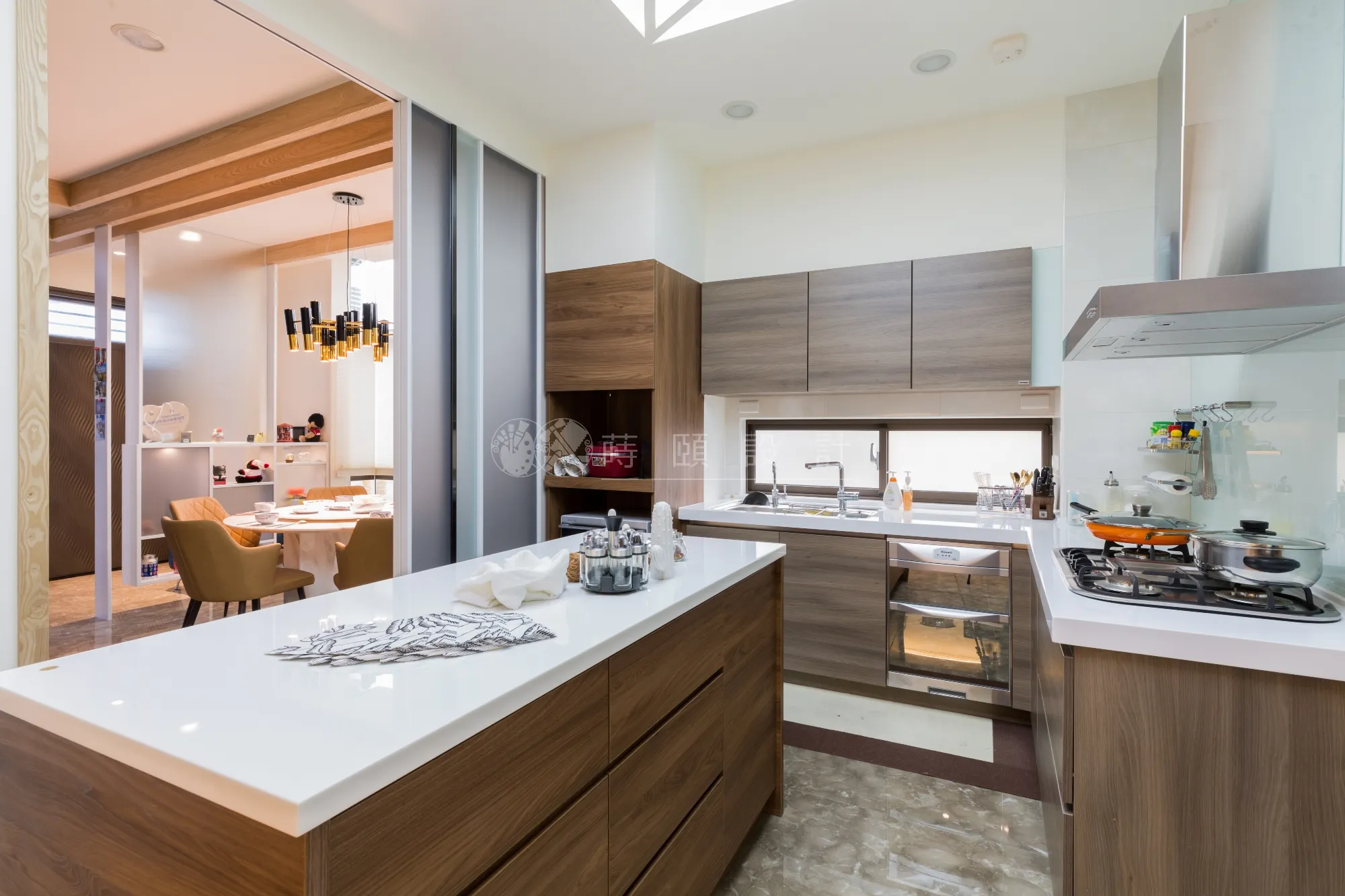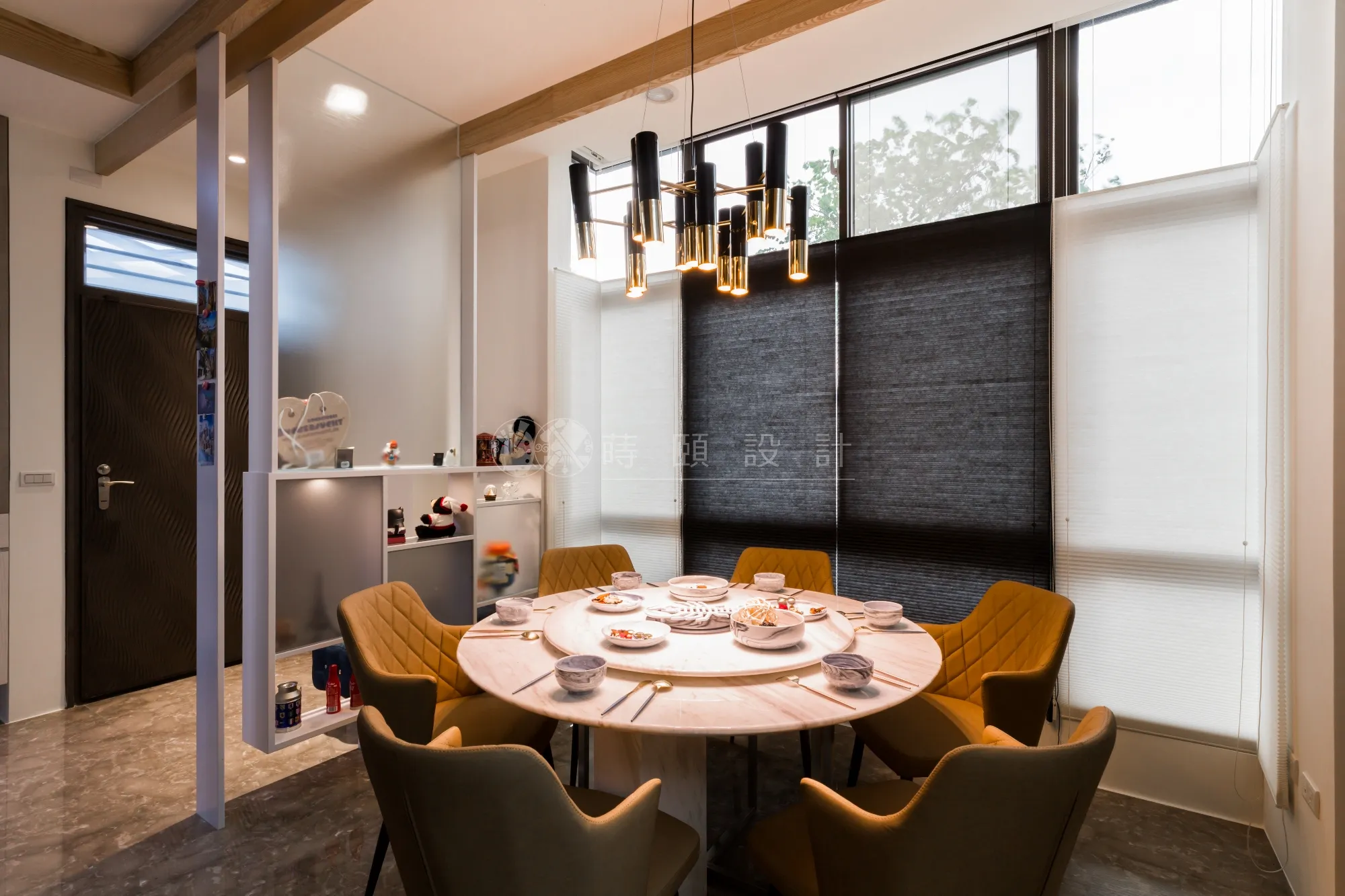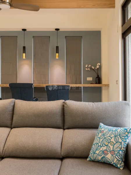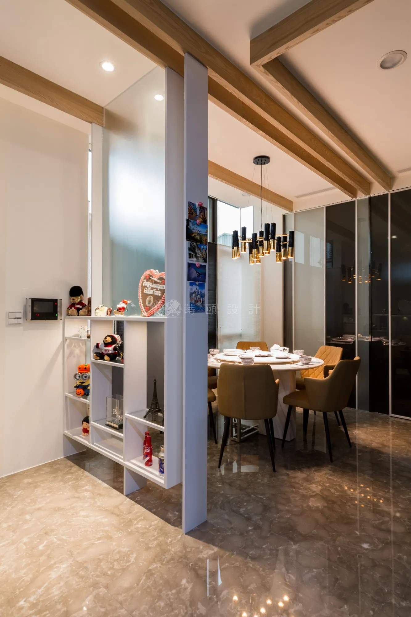 透過玄關屏風設計解決風水問題,並保留採光與空間通透感;天花板線條從玄關屏風延伸公共空間動線,對應廚房拉門流動設計語彙。各個空間保有特色與功能完整性,並透過線條色調與木質材質增添協調性與柔和感受。