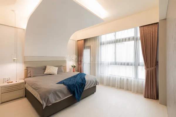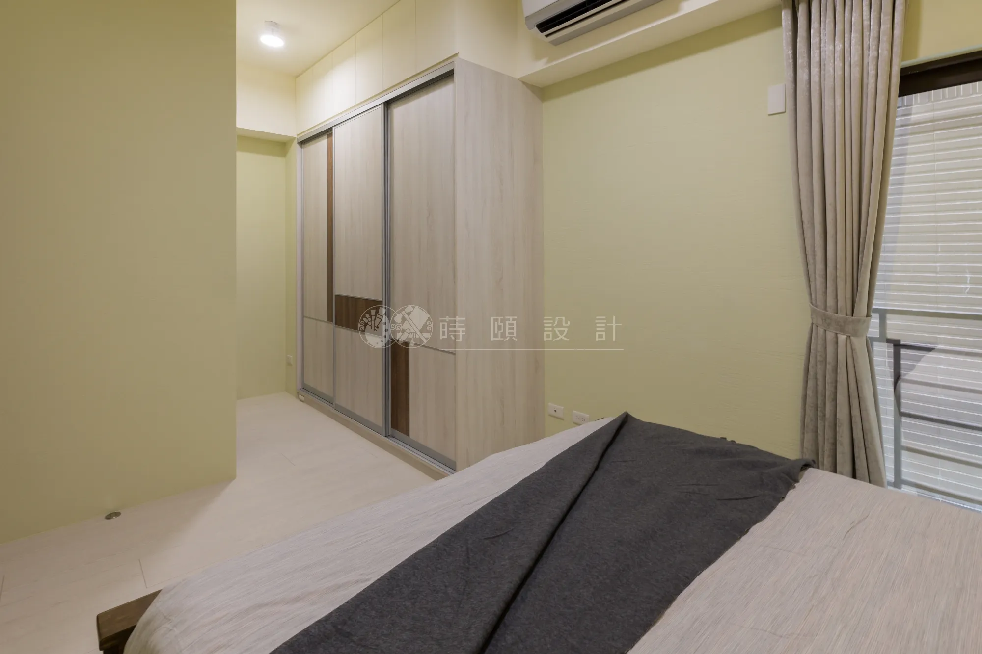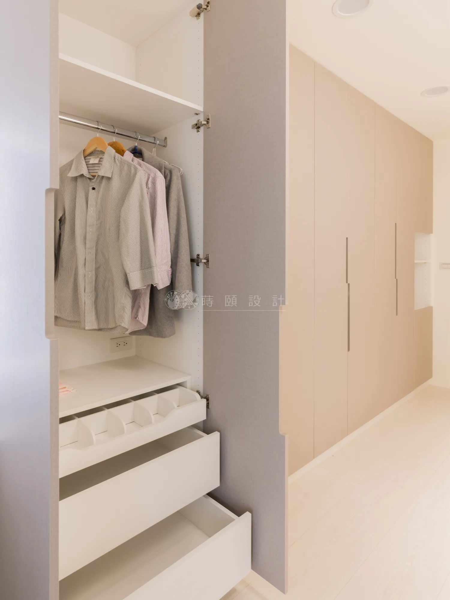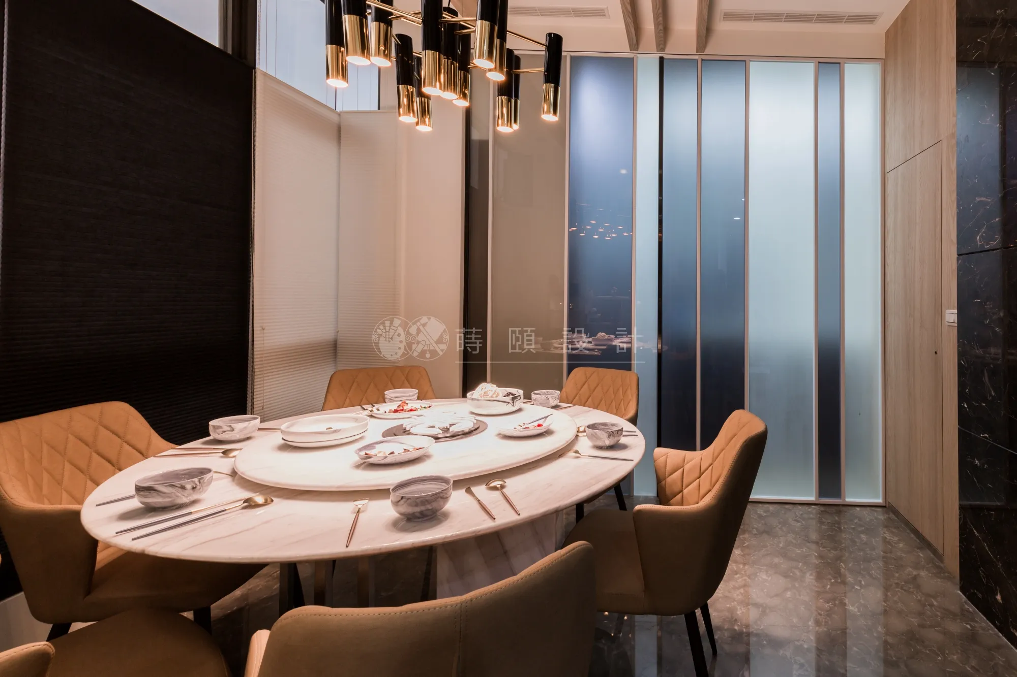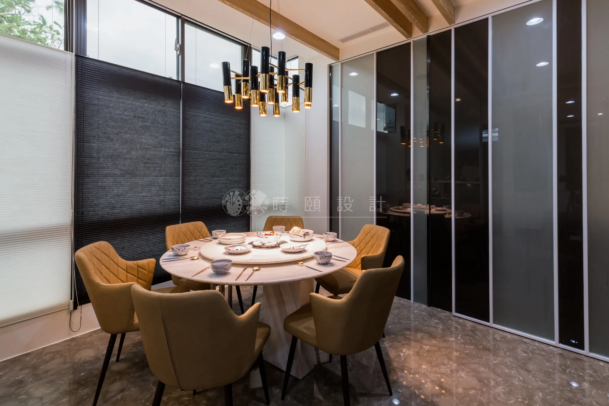 透過玄關屏風設計解決風水問題,並保留採光與空間通透感;天花板線條從玄關屏風延伸公共空間動線,對應廚房拉門流動設計語彙。各個空間保有特色與功能完整性,並透過線條色調與木質材質增添協調性與柔和感受。