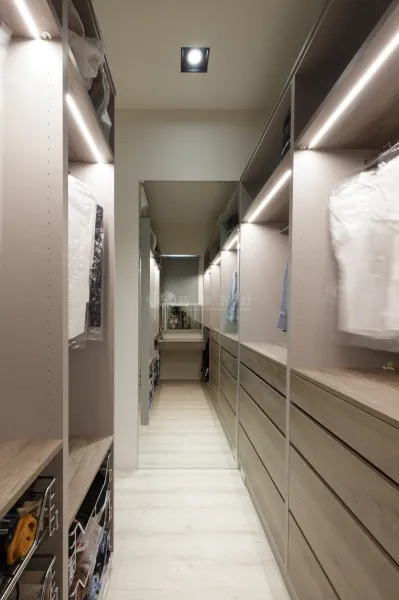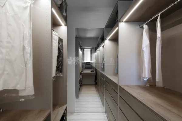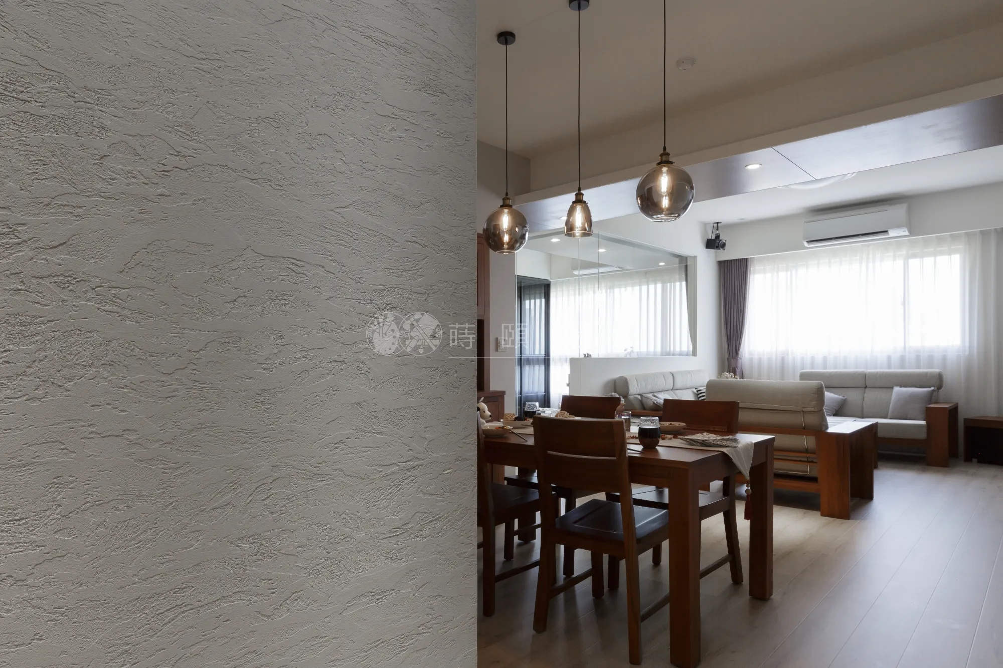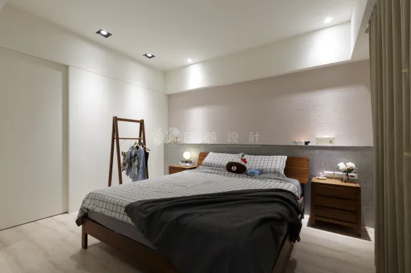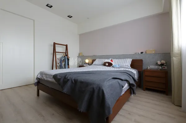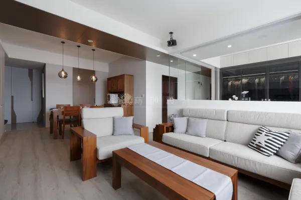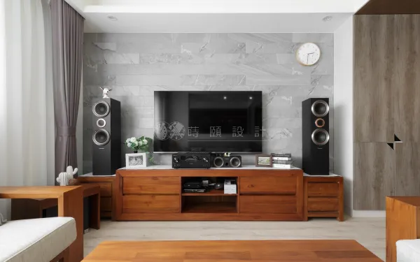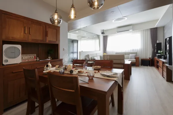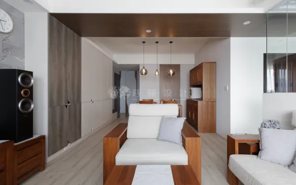 以北歐風設計融入屋主柚木傢俱,空間增添溫潤質感。居住環境相對潮濕藉由壁面選用珪藻土材料,改善舒適度,並利用零碎空間打造儲藏室增添收納機能。