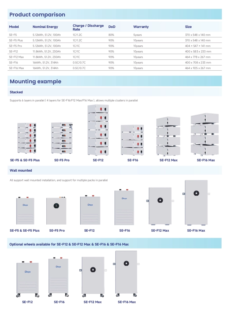 | SE-F16 / F16 Max | 16 kWh | 314 Ah | IP21 / IP65 | 10 年 |