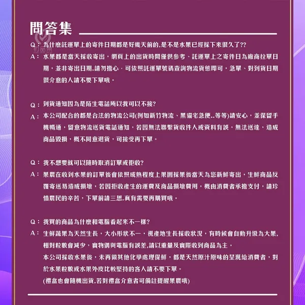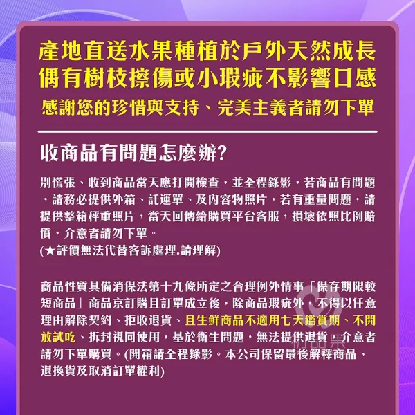 備註欄:1.商品性質具備消保法第十九條所定之合理例外情事「保存期限較短商品」, 商品經訂購且訂單成立後, 除商品瑕疵外,不得以任意理由解除契約、拒收退貨、且生鮮商品不適用七天鑑賞期,不開放試吃,拆封視同使用,基於衛生問題,無法提供退貨,介意者請勿下單購買。 2.生鮮水果反覆寄送易造成損壞.任意拒收所產生的運費及商品損壞費用.概由消費者承擔支付,下單前請三思.有需要再購買。 3.收到商品後應於當天打開檢查,並全程錄影拍照,若商品有問題,請務必提供商品外箱、託運單、及內容物照片,若有重量問題,請提供秤重照,當天回傳給購買平台客服,損壞依照比例賠償,介意者請勿下單。 4.農產品接到訂單後才會採果出貨,網頁出貨時間僅供參考.請以水果實際成熟採收日期為主.若對日期很在意的人.請不要下單。 5.商品出貨後會有1-2天配送時間,請保持手機暢通,留意物流司機大哥通知送貨電話若因電話無法聯繫上收貨人,或收件人配送地址填錯.造成商品毀損,概不同意退貨,可接受再下單。 6.生鮮蔬果為天然生長,大小形狀不一, 視產地狀況而定有時候會自動升級為大果.粒數會減少.實物與電腦偶有誤差,請以銷售頁面標示重量規格,及實際收到整箱商品之為主。 7.開箱請記得全程錄影。本公司保留最後解釋商品及商品退換貨及取消訂單權利。