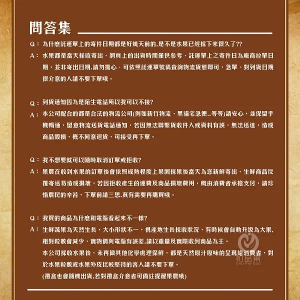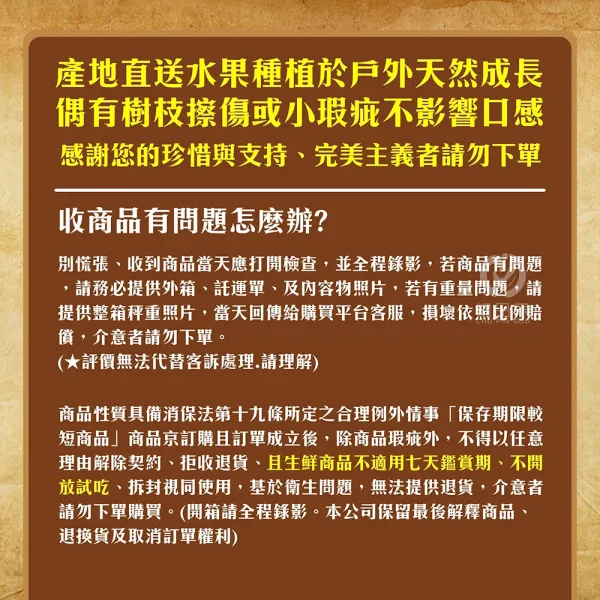 備註欄:網路購買生鮮農產品請注意以下事項: 1.商品性質具備消保法第十九條所定之合理例外情事「保存期限較短商品」, 商品經訂購且訂單成立後, 除商品瑕疵外,不得以任意理由解除契約、拒收退貨、且生鮮商品不適用七天鑑賞期,不開放試吃,拆封視同使用,基於衛生問題,無法提供退貨,介意者請勿下單購買。 2.生鮮水果反覆寄送易造成損壞.任意拒收所產生的運費及商品損壞費用.概由消費者承擔支付,下單前請三思.有需要再購買。 3.收到商品後應於當天打開檢查,並全程錄影拍照,若商品有問題,請務必提供商品外箱、託運單、及內容物照片,若有重量問題,請提供秤重照,當天回傳給購買平台客服,損壞依照比例賠償,介意者請勿下單。 4.農產品接到訂單後才會採果出貨,網頁出貨時間僅供參考.請以水果實際成熟採收日期為主.若對日期很在意的人.請不要下單。 5.商品出貨後會有1-2天配送時間,請保持手機暢通,留意物流司機大哥通知送貨電話若因電話無法聯繫上收貨人,或收件人配送地址填錯.造成商品毀損,概不同意退貨,可接受再下單。 6.生鮮蔬果為天然生長,大小形狀不一, 視產地狀況而定有時候會自動升級為大果.粒數會減少.實物與電腦偶有誤差,請以銷售頁面標示重量規格,及實際收到整箱商品之為主。 7.開箱請記得全程錄影。本公司保留最後解釋商品及商品退換貨及取消訂單權利。