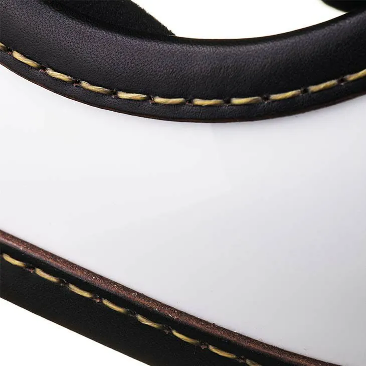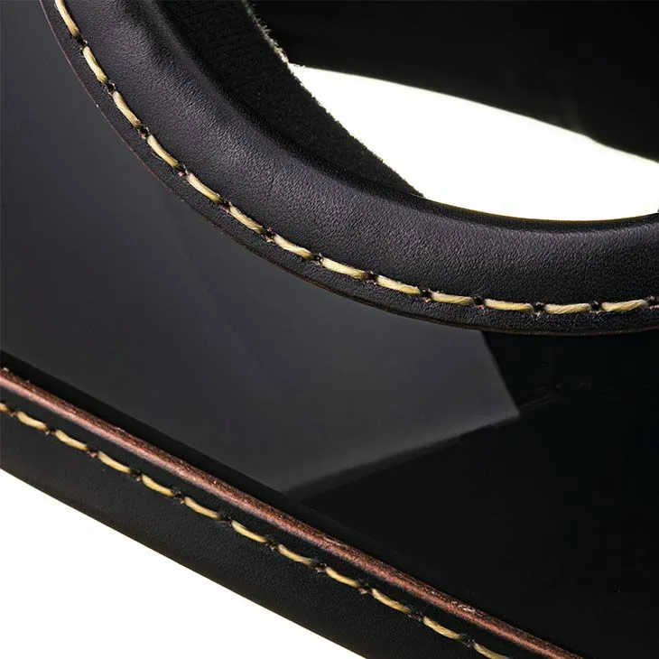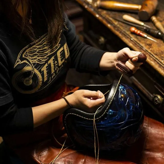 使用極厚的真皮,搭配極粗的筋腱線,直接穿透縫製於帽殼上。