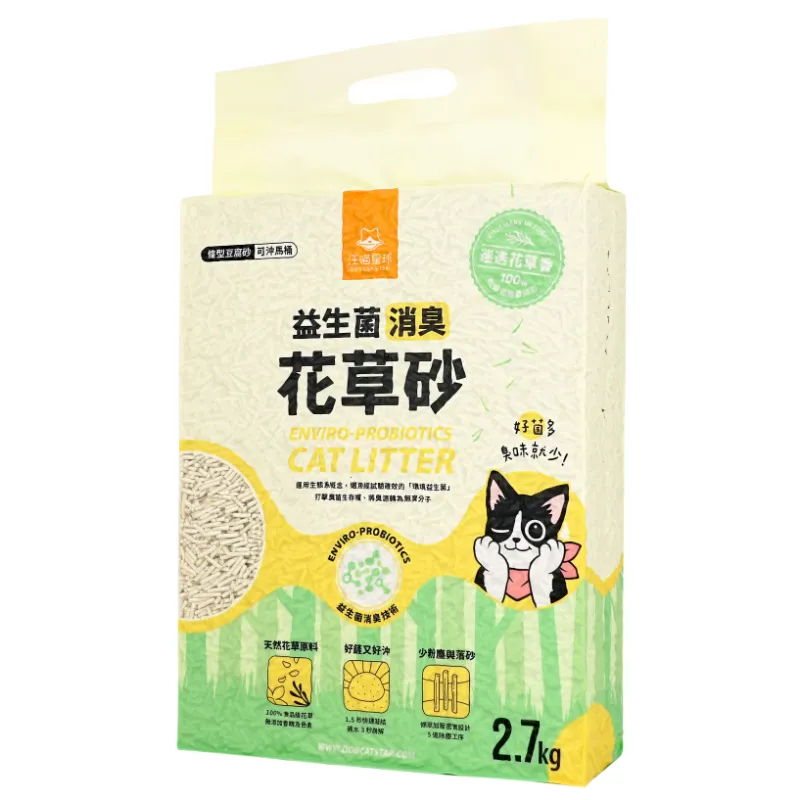 花草貓砂中添加「環境益生菌」,能把臭味轉換為無臭分子,有效根除臭源。而活性碳不只會吸附臭味、也會過濾掉空氣中的香味,因此汪喵花草貓砂沒有添加活性碳,希望讓貓砂更長久的散發花草香。