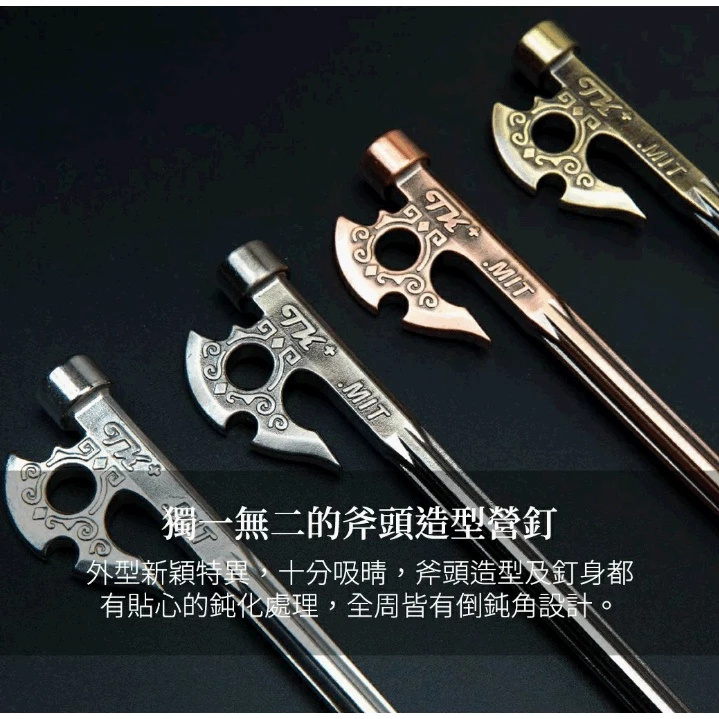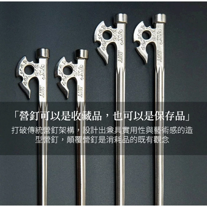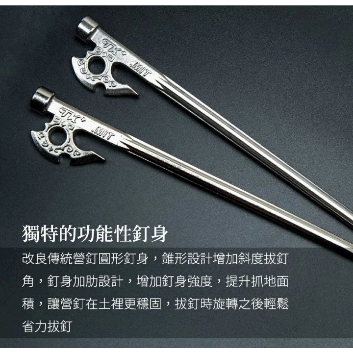 猶如古代青銅斧頭獨特造型驚豔全場,SUS630不鏽鋼材質,高溫熱處理後硬度遠高於304不鏽鋼,表面經過電鍍處理,提高耐磨與抗腐蝕性,釘身加肋和特殊錐形設計,有效提升強度及抓地面積,拔釘下釘超輕鬆,拔釘圓孔直徑1公分適合各式拔釘錘,弧面拉直設計能防止營繩脫落