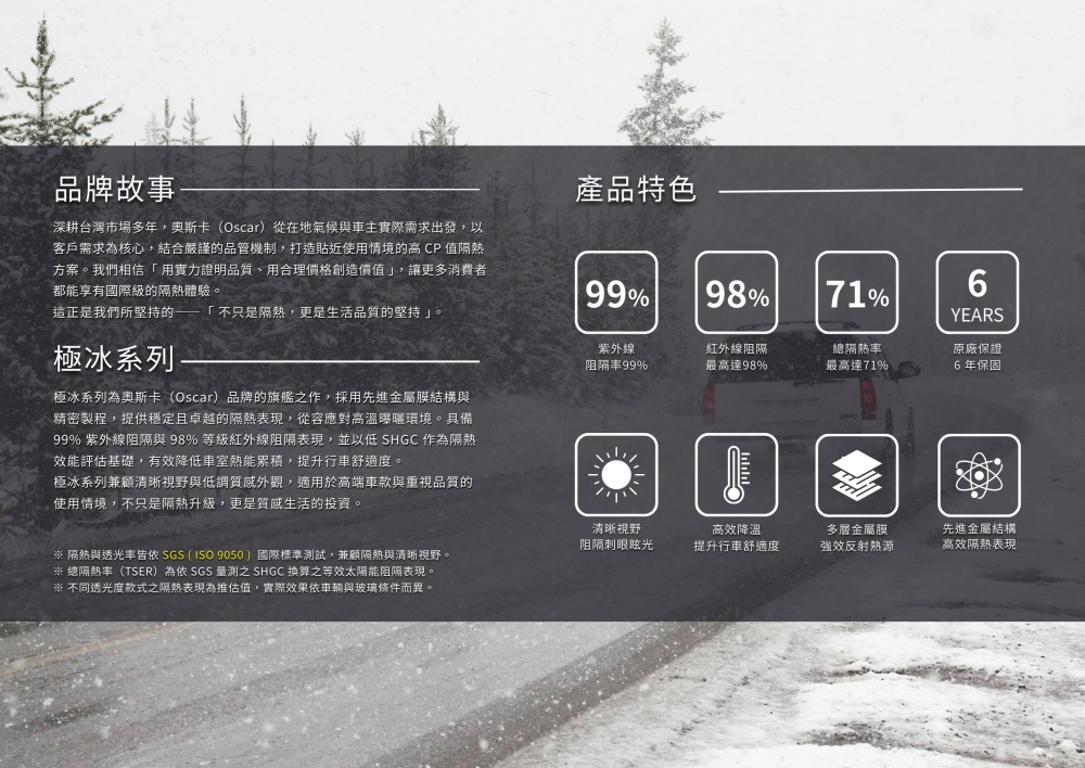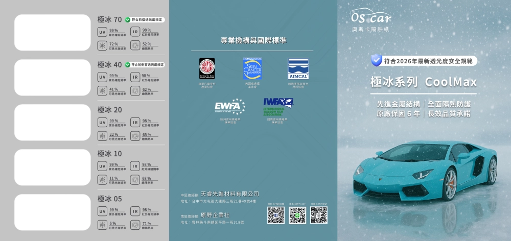 3. 目前僅「極冰 05」具 SGS 實際量測之 SHGC 數據,其餘透光度款式之 TSER 為依同系列膜層結構與光學特性推算之參考值。