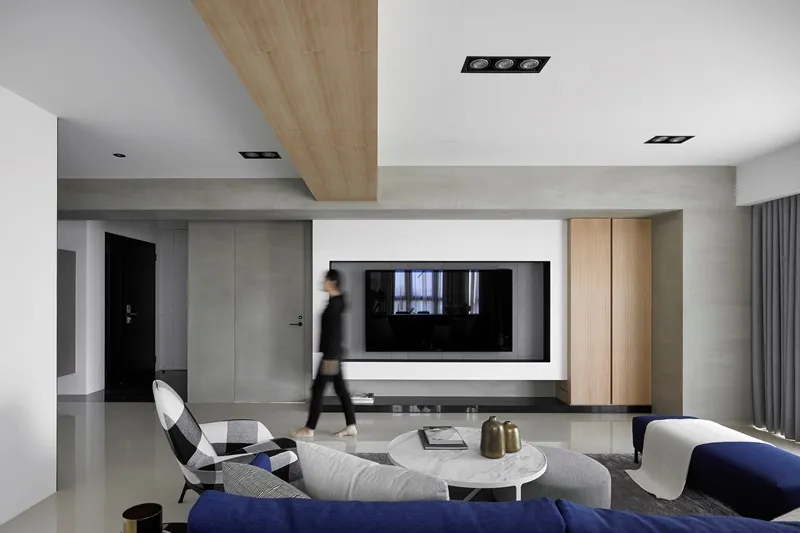 The interior palette of this apartment prominently features shades of grey, seen in elements such as the TV accent wall, the headboard wall, and the fabric of the curtains. This grey tone is further extended to a green eco-friendly textured coating applied to the walls—a sustainable material innovatively made from reused silt collected from Taiwan’s reservoirs. The greys are complemented by black wood veneers, iron elements, and stone materials, which collectively highlight the texture of each material, enhancing and echoing one another.