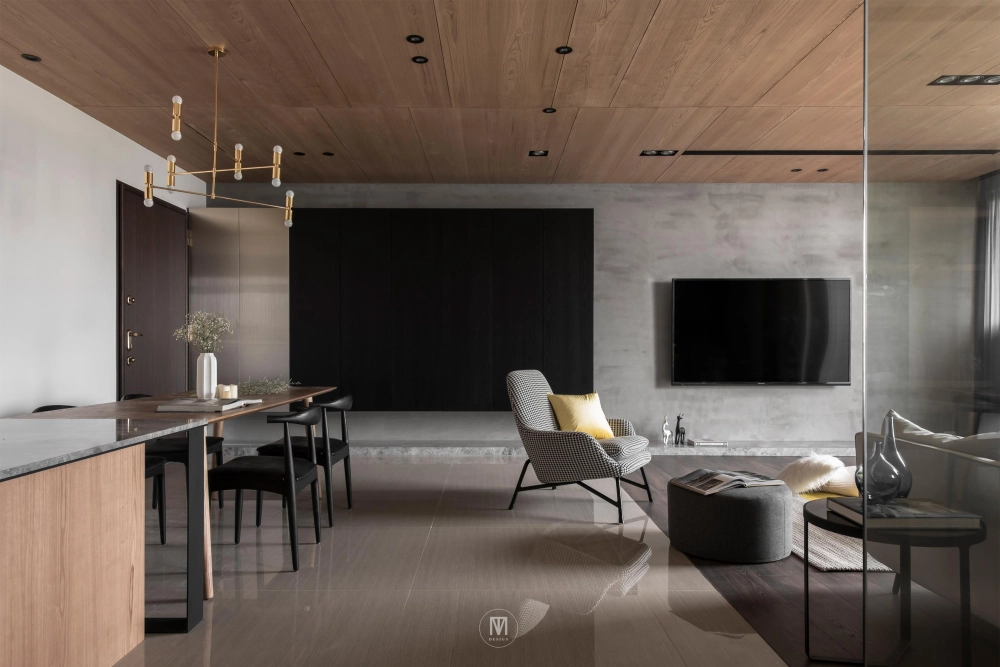 公領域使用大面積的木質天花板,溫和的木材不同於牆面仿清水模塗料的粗曠,調和灰色空間的冷冽,多面開窗引入日光延綿灑落於室內空間每一個角落,玻璃隔間折射光線,於寬闊的室內空間自由的穿梭,弱化客廳深沉的色調,加深視野的穿透性,增廣視覺效果延伸空間感。透過家飾擺設的點綴,多種色彩的變化層次上更顯豐富,為空間注入活力,打破沉穩空間的幽靜,使空間內的人事物皆能相輔相成相互襯托對方。線條的分割、材質的變化,為雜亂的空間分化不同機能使用的場域,地坪材質的分割、壁面材質的轉換,彷彿訴說各個區域不同人文的空間語彙。