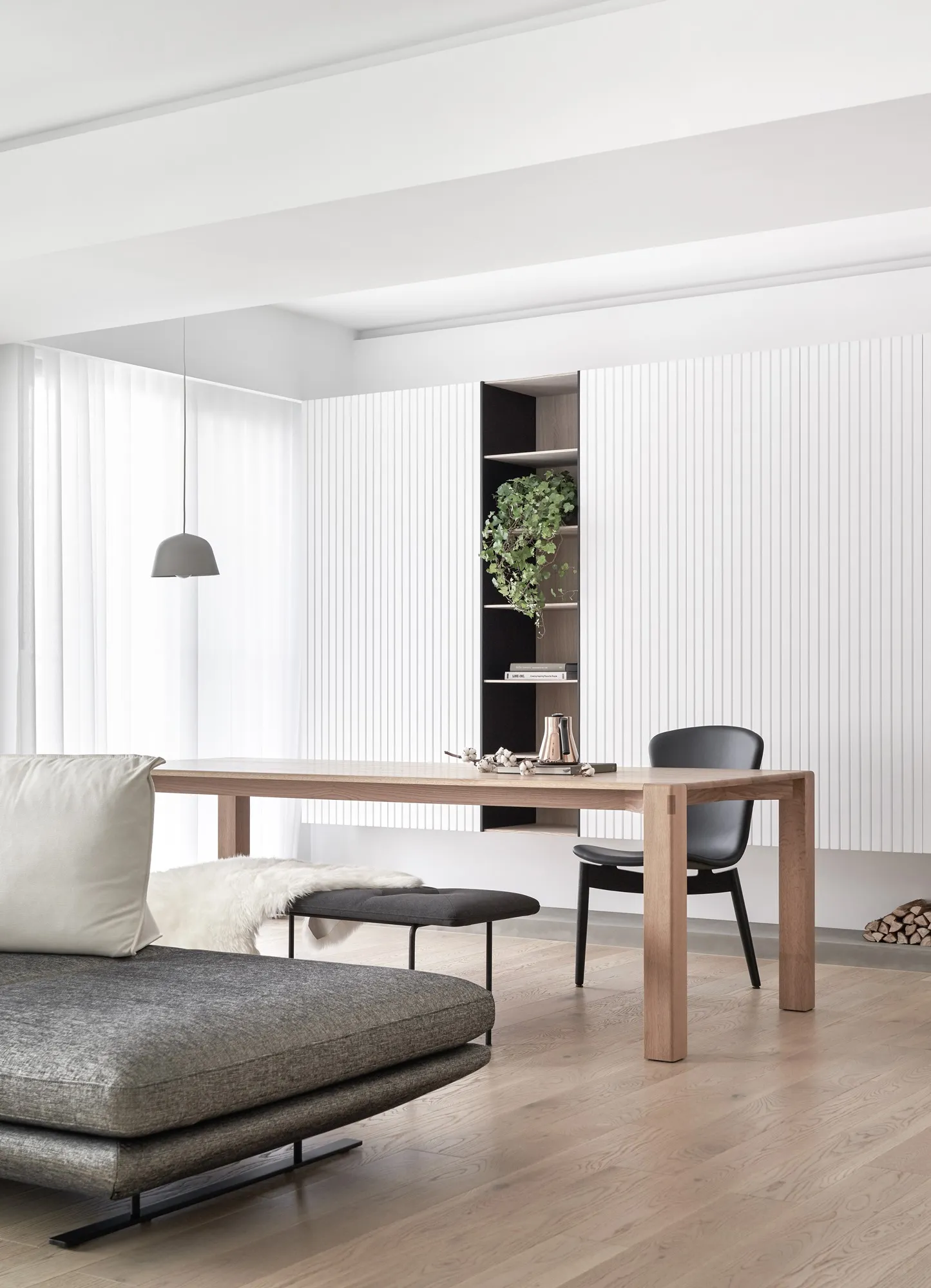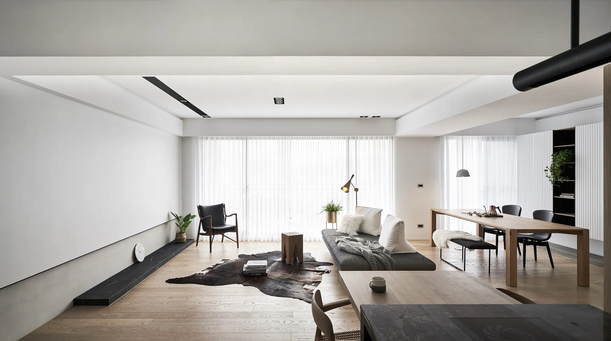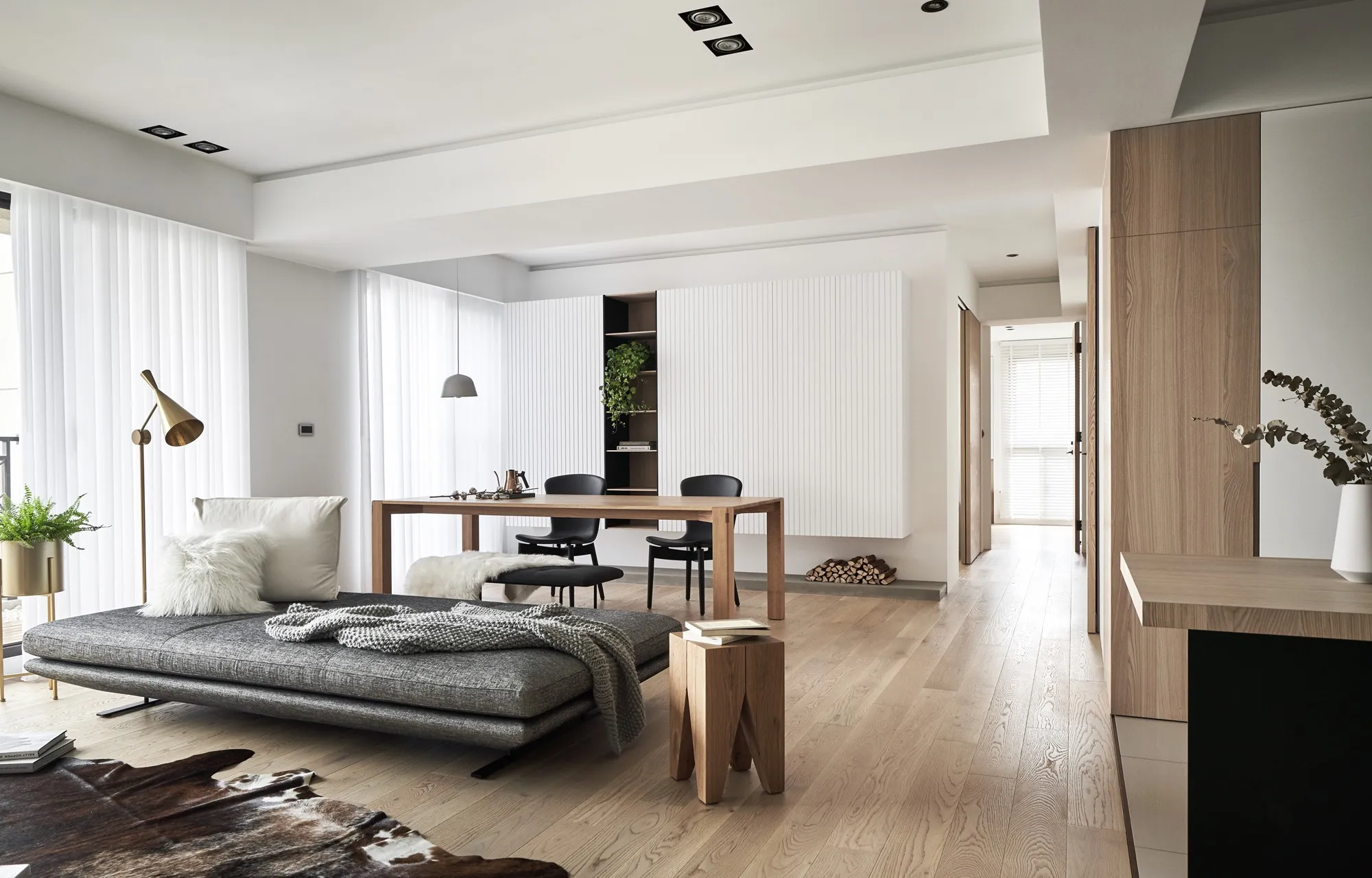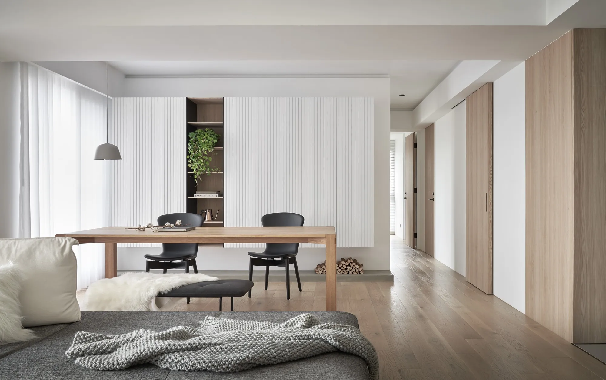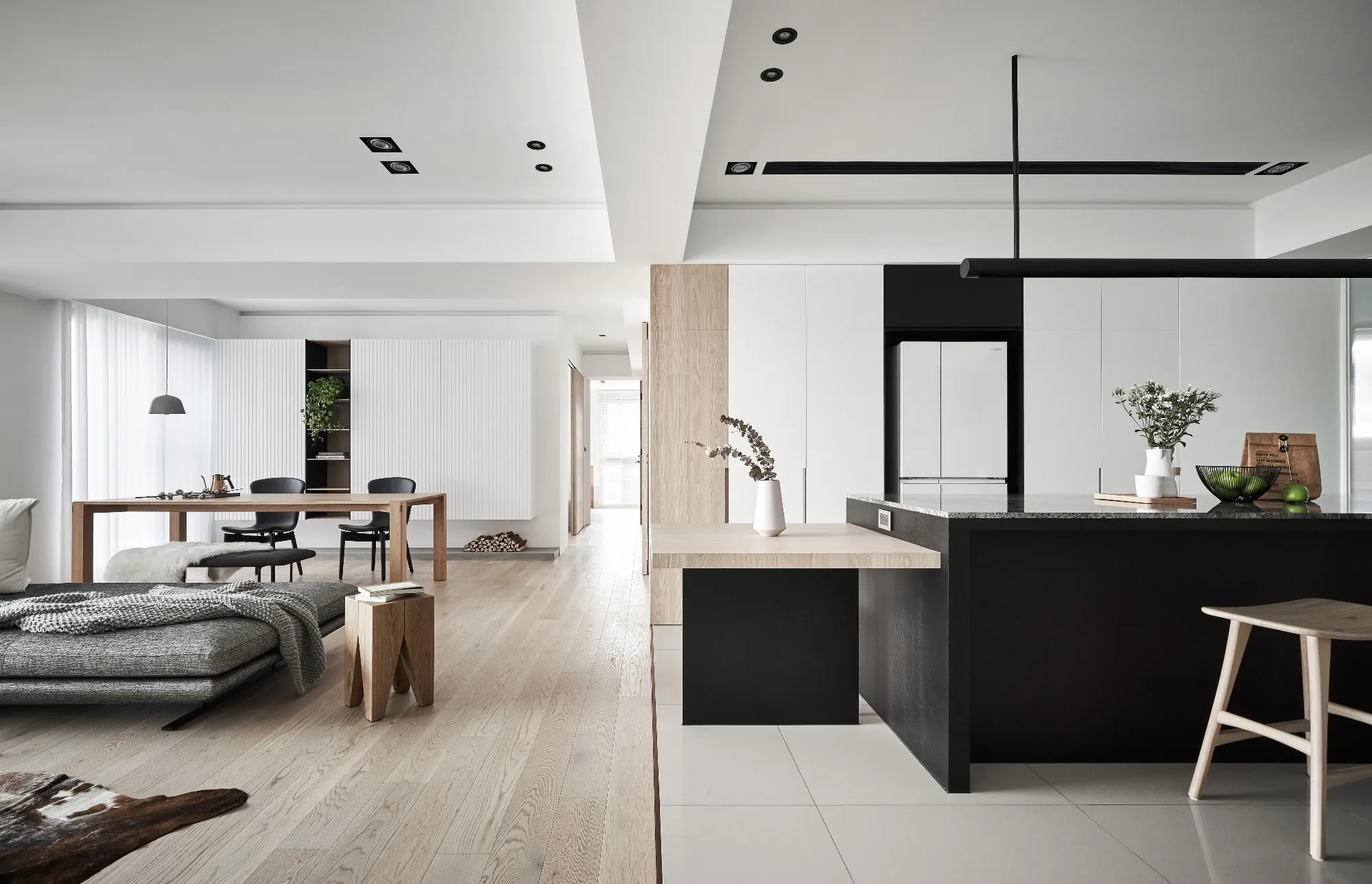 This project is a three-bedroom, three-bathroom apartment with a spacious dual-living area. Its original layout benefits from excellent natural lighting. The public zone adopts an open and transparent spatial arrangement, aligned along a single axis to visually connect the living, dining, and reading areas. This linear layout opens up diverse possibilities for spatial interaction—extending beyond aesthetics into thoughtful spatial planning—allowing natural light to flow seamlessly between public and private zones. The play of light and shadow brings nuanced expression to the interior. At its core, the design aims to a refined and versatile lifestyle, fostering dynamic interaction between visual and spatial elements from the inside out.Upon entering, the designer carefully interprets the client's vision of spatial freedom. The entryway, living room, study, and dining area are free from physical partitions, and decorative elements are intentionally minimized. This allows the eye to be drawn immediately to the expansive and uncluttered public area, highlighted by large floor-to-ceiling windows that flood the space with natural light, creating a bright and airy atmosphere. In response to the homeowner’s desire for a simple, decoration-free environment, the design was consistently simplified throughout the process—highlighting the purity of form through the use of understated materials. The result is a serene and relaxing home, with a natural, unadorned atmosphere that reflects the owner’s ideal of an honest, grounded space.Different zones are subtly defined by changes in flooring materials. The wood flooring in the living room extends into the private areas to unify the space, while pale wood tones, crisp white walls, dark metal accents, and subdued concrete textures an elegant yet understated palette. The absence of overly ornate detailing lends the space a modern, composed character. In the dining area, a monochromatic black-and-white scheme is established. A bold, dark-toned island contrasts against a lighter, warm wood dining table—this contrast emphasizes balance and tension. A linear pendant light above the island enhances spatial layering and visual depth. The kitchen is enclosed with sliding glass doors, providing transparency while also serving to contain cooking fumes. The vertical pattern on the glass adds a subtle sense of privacy without compromising openness.There is no obvious division between the reading nook and the living room; instead, a ceiling beam naturally defines the boundary between the two. The storage wall in the reading area is designed in white to minimize its visual weight. A recessed base allows the unit to appear as if floating, maintaining lightness while providing generous storage. Vertical grooves on the cabinet doors add refined detail, introducing a playful element into the reading space.The guest room serves as both accommodation for visiting friends and storage for personal belongings. To meet the client's storage needs while preserving a clean aesthetic, full-height cabinetry is integrated into the walls, with portions softened by concrete-effect paint for a more subdued tone. In the parents’ room, the wood flooring extends up the wall and across the ceiling, wrapping the space in warm tones. The headboard wall features a rhythmic pattern of linear solids and voids, while the TV wall juxtaposes raw wood textures with rugged stone-like finishes, creating a rustic, natural atmosphere with contrasting tactile and visual sensations.The master bedroom is anchored in white, with dividing lines on the main wall adding a sense of refinement while cleverly mitigating the pressure of overhead beams. This also provides additional storage while maintaining layout integrity. Light wood tones are echoed across the headboard wall, closet doors, and wardrobe surfaces—introducing warmth and focal points into the otherwise white space.Statement furniture pieces were carefully selected for their sculptural qualities. Brass-toned accents reflect off wood textures, bringing a hint of raw elegance to the otherwise serene space—creating harmony without pretense.The open layout of the public area extends seamlessly toward the balcony, creating a fluid indoor-outdoor transitional space. Sunlight becomes a key element that defines the public realm, imbuing the interior with natural warmth and vibrancy. The abundant daylight is balanced with interior lighting to enhance spatial ambiance. Thoughtful lighting arrangements ensure light softly spills into every corner, uniting the entire apartment.The interior color scheme is grounded in white, accented by light wood textures and subtle concrete finishes. The wood grain introduces a natural sensibility, while the gentle neutral palette enhances the space’s overall tranquility. Furniture selections in black, white, and grey echo the minimalist tone, emphasizing purity and clarity. The space expresses a philosophy of organic minimalism.Overall, the design embraces a reductive approach—eschewing excess in favor of material honesty. White is the dominant base, allowing the beauty of each material to shine through and shaping a space that feels pure and serene. Select black iron elements introduce spatial contrast and dimension. The open-plan public zone enhances circulation, while the singular axis extends the visual field. A reading nook nestled along this line offers the homeowner a calm and restorative corner. Crisp, clean lines divide the white cabinetry wall, bringing a fresh and delicate atmosphere to the reading area. Within this unconstrained space, the white palette amplifies brightness and spaciousness, giving residents the freedom to imagine their own “fantasy world” of daily life.