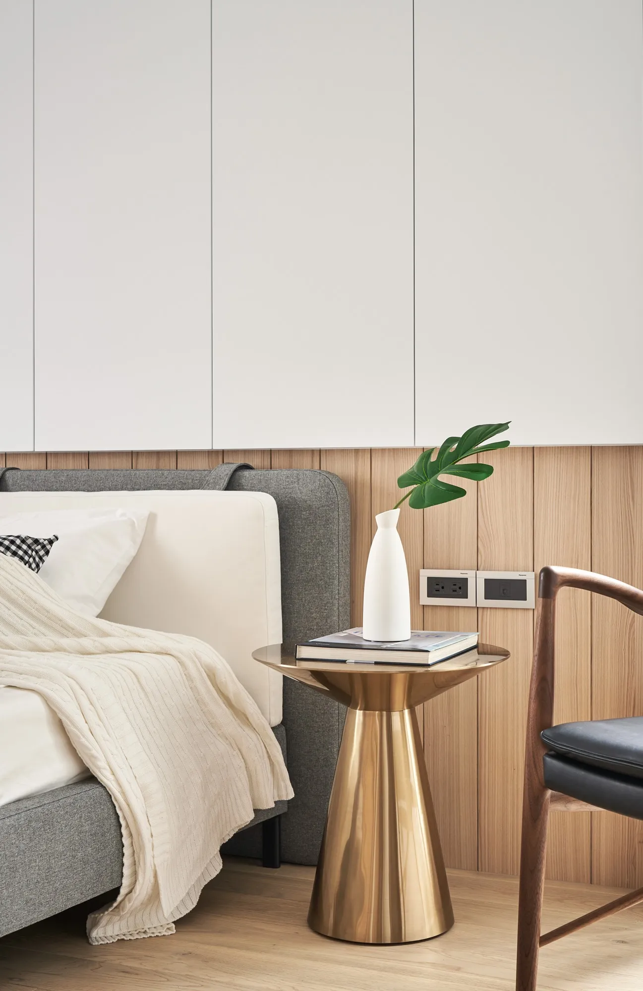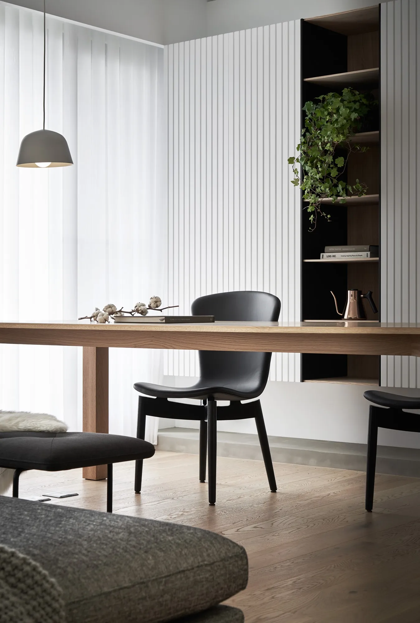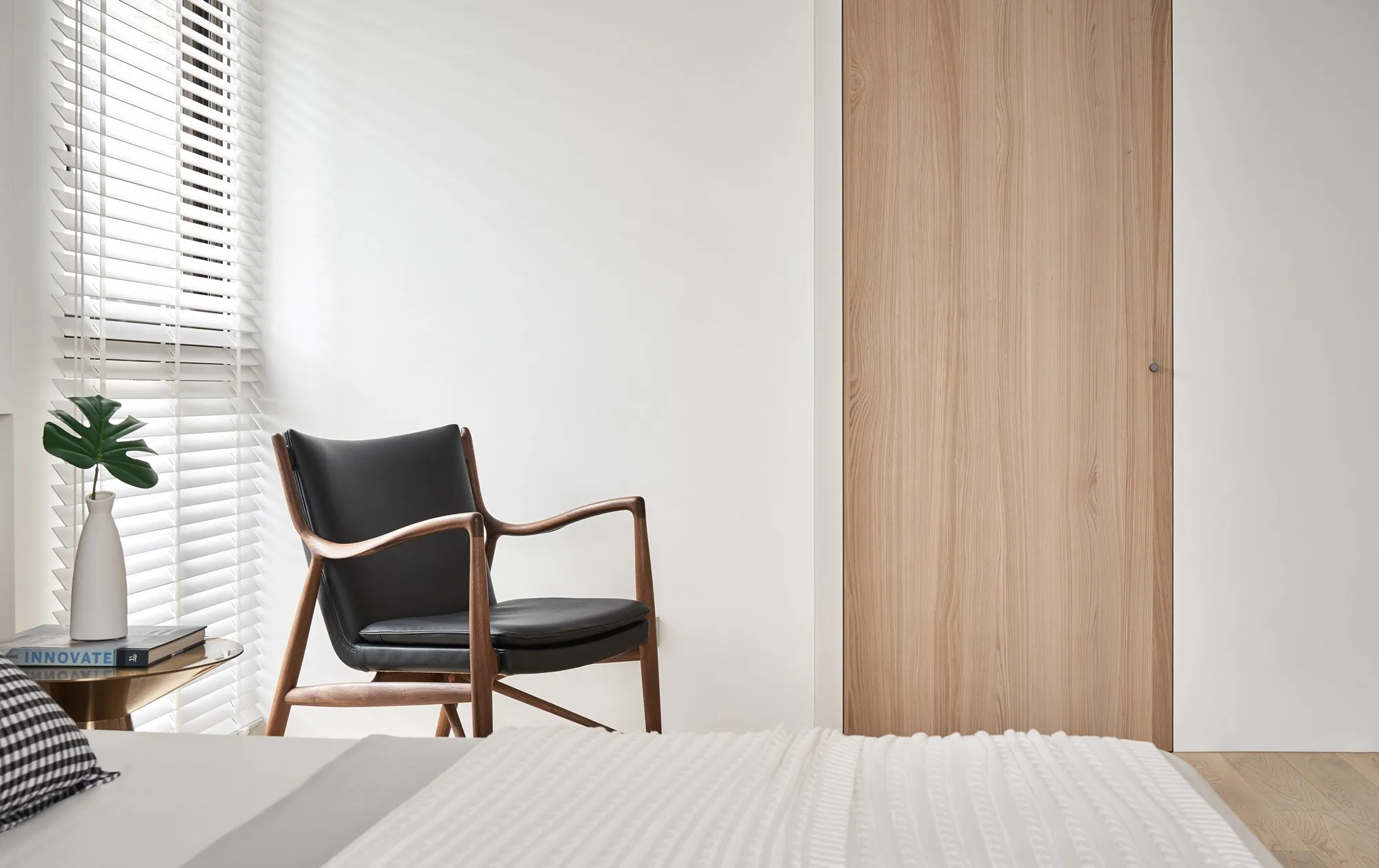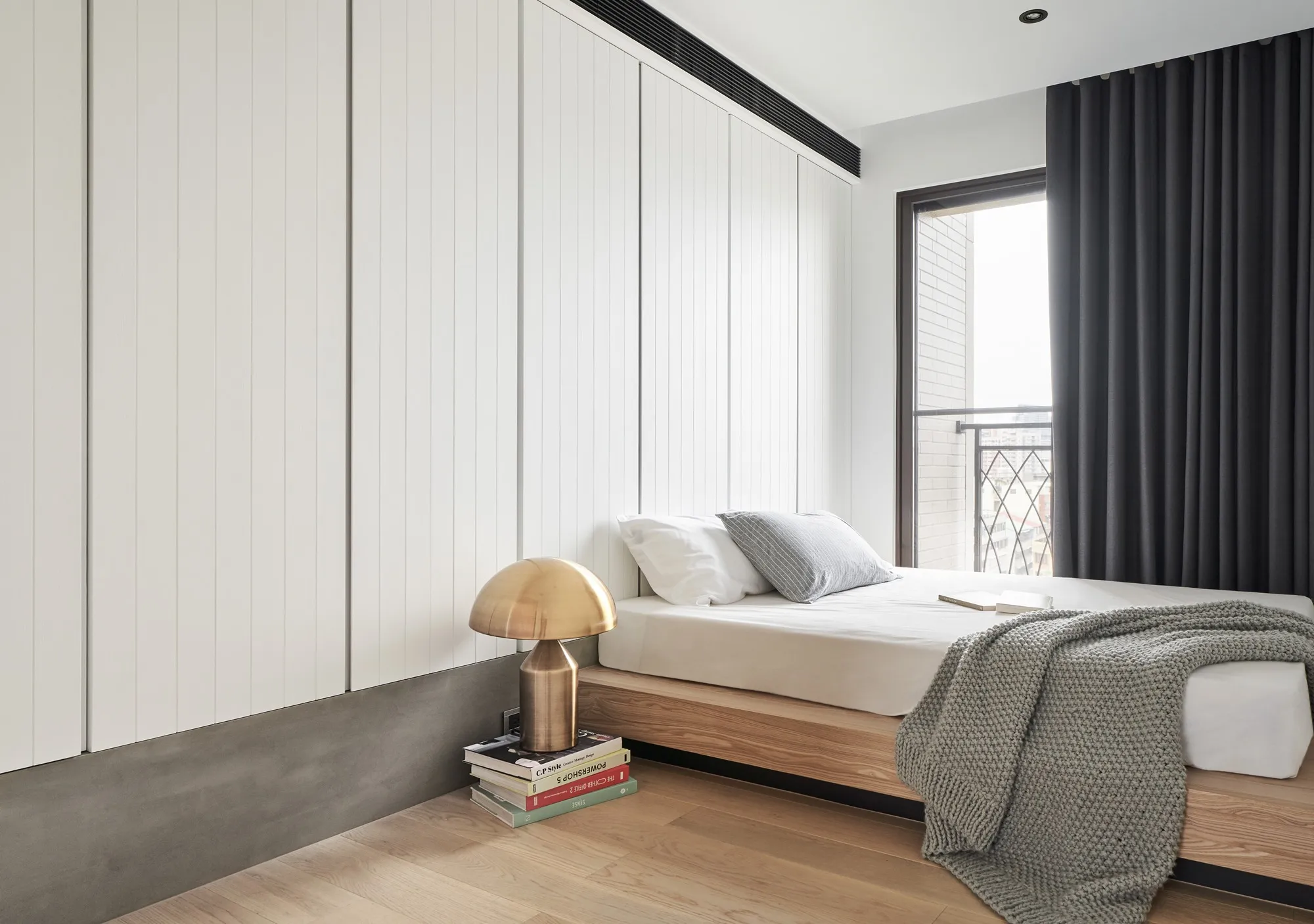 This project is a three-bedroom, three-bathroom apartment with a spacious dual-living area. Its original layout benefits from excellent natural lighting. The public zone adopts an open and transparent spatial arrangement, aligned along a single axis to visually connect the living, dining, and reading areas. This linear layout opens up diverse possibilities for spatial interaction—extending beyond aesthetics into thoughtful spatial planning—allowing natural light to flow seamlessly between public and private zones. The play of light and shadow brings nuanced expression to the interior. At its core, the design aims to a refined and versatile lifestyle, fostering dynamic interaction between visual and spatial elements from the inside out.Upon entering, the designer carefully interprets the client's vision of spatial freedom. The entryway, living room, study, and dining area are free from physical partitions, and decorative elements are intentionally minimized. This allows the eye to be drawn immediately to the expansive and uncluttered public area, highlighted by large floor-to-ceiling windows that flood the space with natural light, creating a bright and airy atmosphere. In response to the homeowner’s desire for a simple, decoration-free environment, the design was consistently simplified throughout the process—highlighting the purity of form through the use of understated materials. The result is a serene and relaxing home, with a natural, unadorned atmosphere that reflects the owner’s ideal of an honest, grounded space.Different zones are subtly defined by changes in flooring materials. The wood flooring in the living room extends into the private areas to unify the space, while pale wood tones, crisp white walls, dark metal accents, and subdued concrete textures an elegant yet understated palette. The absence of overly ornate detailing lends the space a modern, composed character. In the dining area, a monochromatic black-and-white scheme is established. A bold, dark-toned island contrasts against a lighter, warm wood dining table—this contrast emphasizes balance and tension. A linear pendant light above the island enhances spatial layering and visual depth. The kitchen is enclosed with sliding glass doors, providing transparency while also serving to contain cooking fumes. The vertical pattern on the glass adds a subtle sense of privacy without compromising openness.There is no obvious division between the reading nook and the living room; instead, a ceiling beam naturally defines the boundary between the two. The storage wall in the reading area is designed in white to minimize its visual weight. A recessed base allows the unit to appear as if floating, maintaining lightness while providing generous storage. Vertical grooves on the cabinet doors add refined detail, introducing a playful element into the reading space.The guest room serves as both accommodation for visiting friends and storage for personal belongings. To meet the client's storage needs while preserving a clean aesthetic, full-height cabinetry is integrated into the walls, with portions softened by concrete-effect paint for a more subdued tone. In the parents’ room, the wood flooring extends up the wall and across the ceiling, wrapping the space in warm tones. The headboard wall features a rhythmic pattern of linear solids and voids, while the TV wall juxtaposes raw wood textures with rugged stone-like finishes, creating a rustic, natural atmosphere with contrasting tactile and visual sensations.The master bedroom is anchored in white, with dividing lines on the main wall adding a sense of refinement while cleverly mitigating the pressure of overhead beams. This also provides additional storage while maintaining layout integrity. Light wood tones are echoed across the headboard wall, closet doors, and wardrobe surfaces—introducing warmth and focal points into the otherwise white space.Statement furniture pieces were carefully selected for their sculptural qualities. Brass-toned accents reflect off wood textures, bringing a hint of raw elegance to the otherwise serene space—creating harmony without pretense.The open layout of the public area extends seamlessly toward the balcony, creating a fluid indoor-outdoor transitional space. Sunlight becomes a key element that defines the public realm, imbuing the interior with natural warmth and vibrancy. The abundant daylight is balanced with interior lighting to enhance spatial ambiance. Thoughtful lighting arrangements ensure light softly spills into every corner, uniting the entire apartment.The interior color scheme is grounded in white, accented by light wood textures and subtle concrete finishes. The wood grain introduces a natural sensibility, while the gentle neutral palette enhances the space’s overall tranquility. Furniture selections in black, white, and grey echo the minimalist tone, emphasizing purity and clarity. The space expresses a philosophy of organic minimalism.Overall, the design embraces a reductive approach—eschewing excess in favor of material honesty. White is the dominant base, allowing the beauty of each material to shine through and shaping a space that feels pure and serene. Select black iron elements introduce spatial contrast and dimension. The open-plan public zone enhances circulation, while the singular axis extends the visual field. A reading nook nestled along this line offers the homeowner a calm and restorative corner. Crisp, clean lines divide the white cabinetry wall, bringing a fresh and delicate atmosphere to the reading area. Within this unconstrained space, the white palette amplifies brightness and spaciousness, giving residents the freedom to imagine their own “fantasy world” of daily life.