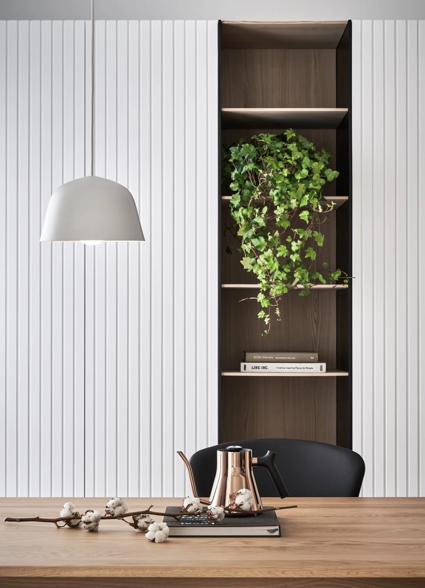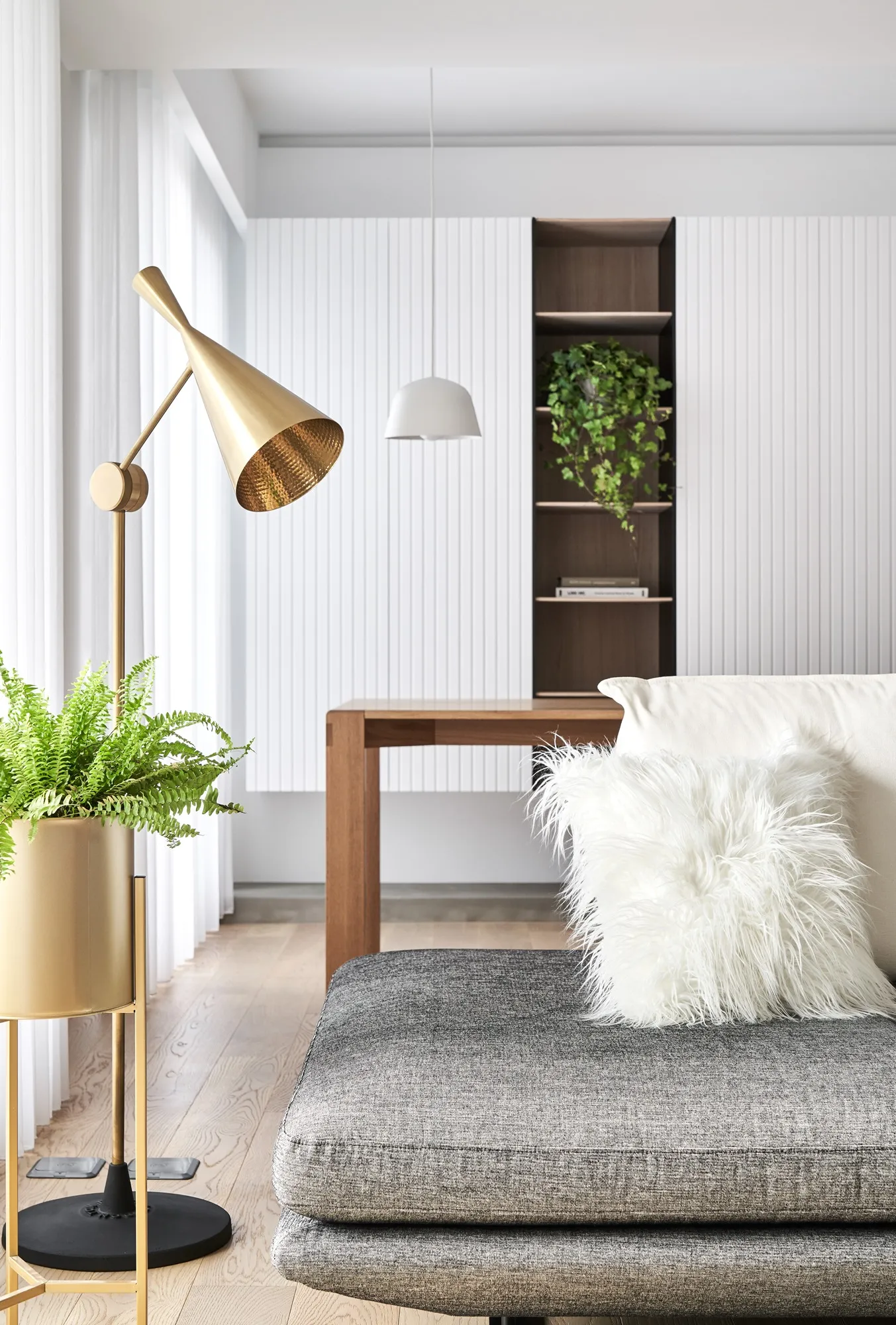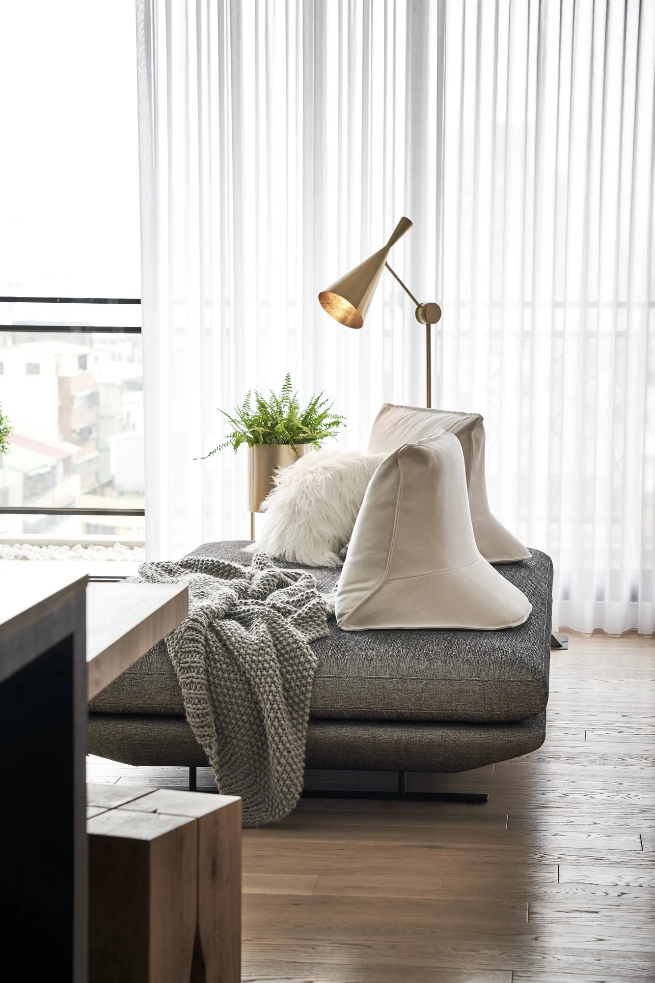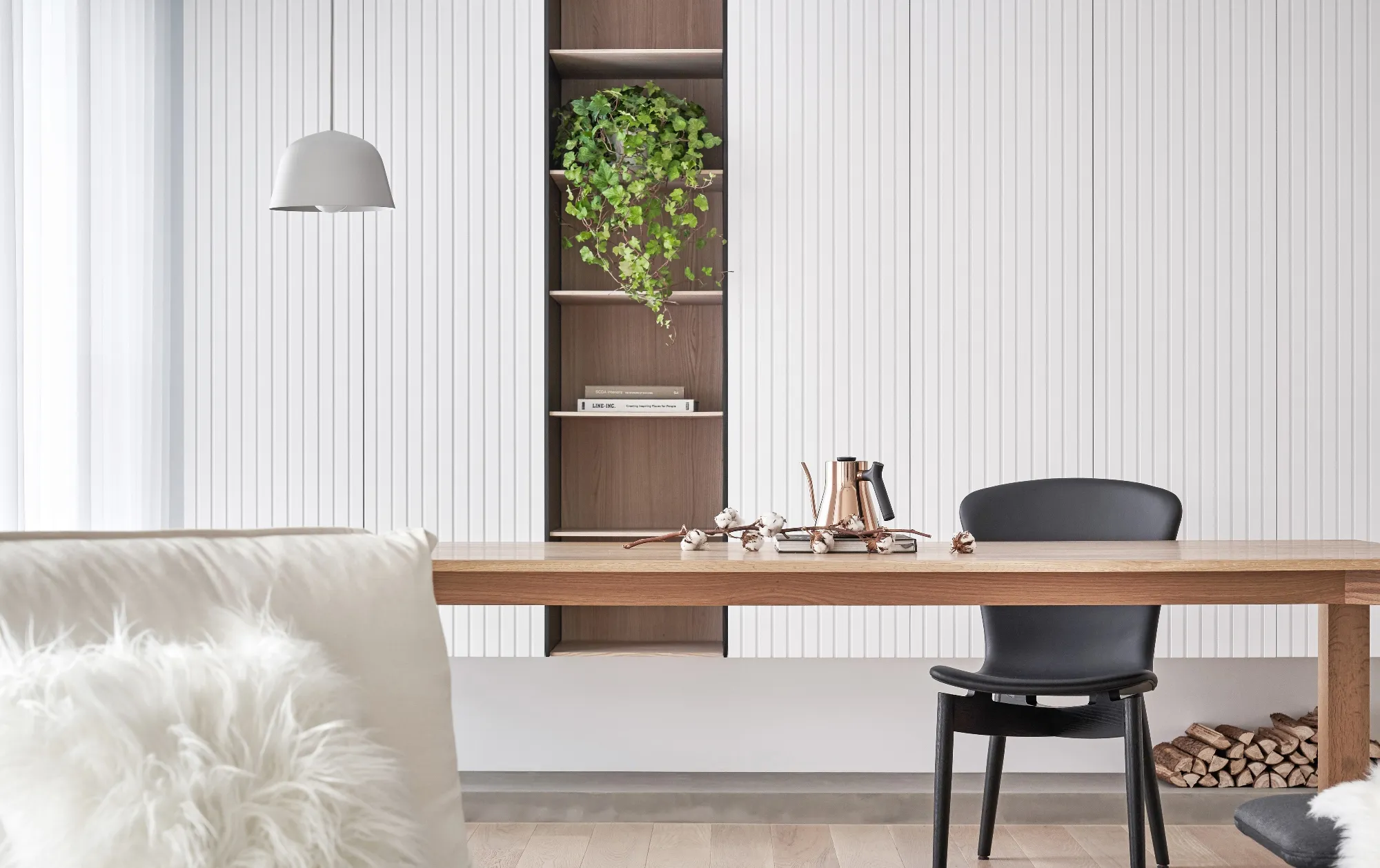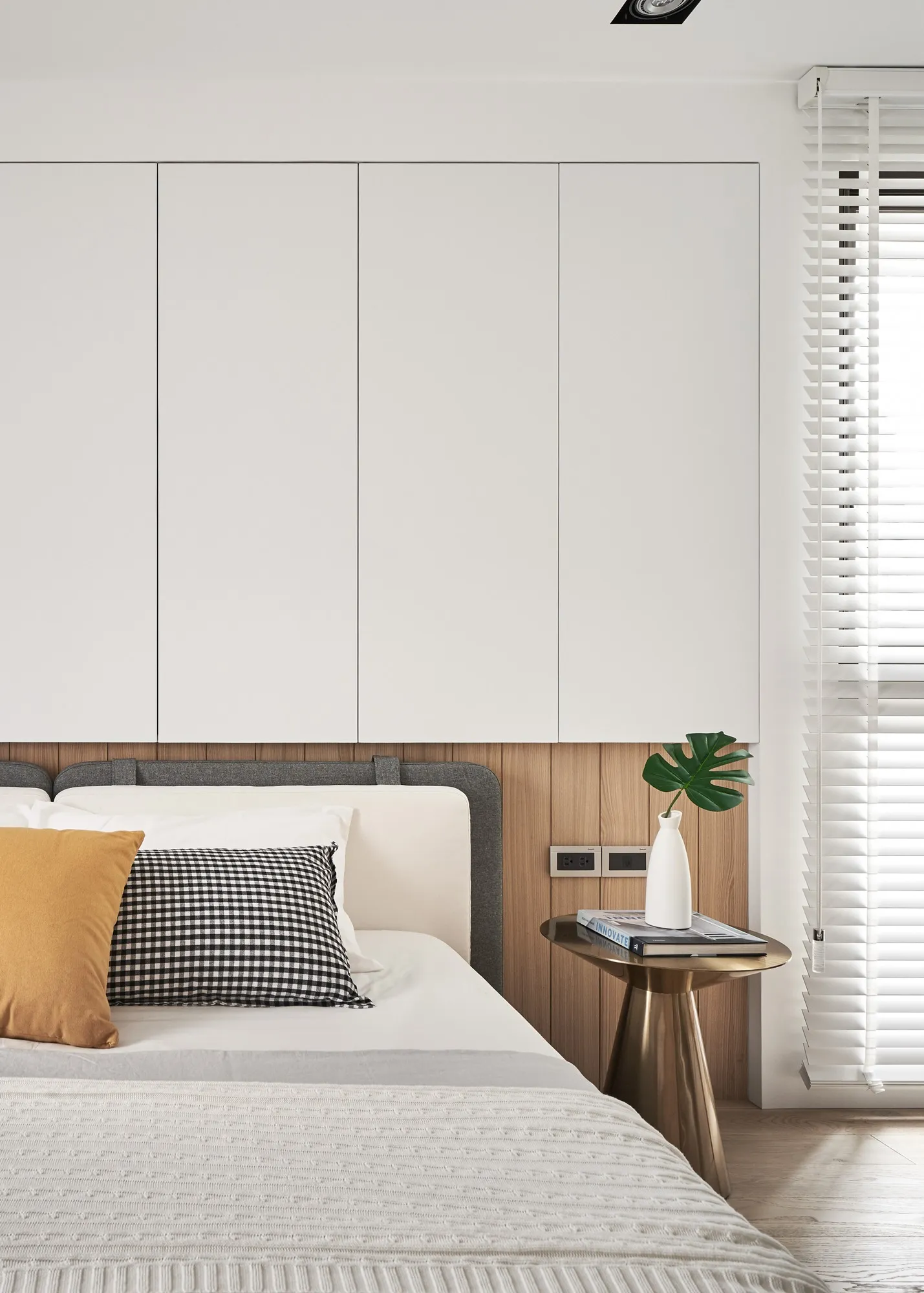 This project is a three-bedroom, three-bathroom apartment with a spacious dual-living area. Its original layout benefits from excellent natural lighting. The public zone adopts an open and transparent spatial arrangement, aligned along a single axis to visually connect the living, dining, and reading areas. This linear layout opens up diverse possibilities for spatial interaction—extending beyond aesthetics into thoughtful spatial planning—allowing natural light to flow seamlessly between public and private zones. The play of light and shadow brings nuanced expression to the interior. At its core, the design aims to a refined and versatile lifestyle, fostering dynamic interaction between visual and spatial elements from the inside out.Upon entering, the designer carefully interprets the client's vision of spatial freedom. The entryway, living room, study, and dining area are free from physical partitions, and decorative elements are intentionally minimized. This allows the eye to be drawn immediately to the expansive and uncluttered public area, highlighted by large floor-to-ceiling windows that flood the space with natural light, creating a bright and airy atmosphere. In response to the homeowner’s desire for a simple, decoration-free environment, the design was consistently simplified throughout the process—highlighting the purity of form through the use of understated materials. The result is a serene and relaxing home, with a natural, unadorned atmosphere that reflects the owner’s ideal of an honest, grounded space.Different zones are subtly defined by changes in flooring materials. The wood flooring in the living room extends into the private areas to unify the space, while pale wood tones, crisp white walls, dark metal accents, and subdued concrete textures an elegant yet understated palette. The absence of overly ornate detailing lends the space a modern, composed character. In the dining area, a monochromatic black-and-white scheme is established. A bold, dark-toned island contrasts against a lighter, warm wood dining table—this contrast emphasizes balance and tension. A linear pendant light above the island enhances spatial layering and visual depth. The kitchen is enclosed with sliding glass doors, providing transparency while also serving to contain cooking fumes. The vertical pattern on the glass adds a subtle sense of privacy without compromising openness.There is no obvious division between the reading nook and the living room; instead, a ceiling beam naturally defines the boundary between the two. The storage wall in the reading area is designed in white to minimize its visual weight. A recessed base allows the unit to appear as if floating, maintaining lightness while providing generous storage. Vertical grooves on the cabinet doors add refined detail, introducing a playful element into the reading space.The guest room serves as both accommodation for visiting friends and storage for personal belongings. To meet the client's storage needs while preserving a clean aesthetic, full-height cabinetry is integrated into the walls, with portions softened by concrete-effect paint for a more subdued tone. In the parents’ room, the wood flooring extends up the wall and across the ceiling, wrapping the space in warm tones. The headboard wall features a rhythmic pattern of linear solids and voids, while the TV wall juxtaposes raw wood textures with rugged stone-like finishes, creating a rustic, natural atmosphere with contrasting tactile and visual sensations.The master bedroom is anchored in white, with dividing lines on the main wall adding a sense of refinement while cleverly mitigating the pressure of overhead beams. This also provides additional storage while maintaining layout integrity. Light wood tones are echoed across the headboard wall, closet doors, and wardrobe surfaces—introducing warmth and focal points into the otherwise white space.Statement furniture pieces were carefully selected for their sculptural qualities. Brass-toned accents reflect off wood textures, bringing a hint of raw elegance to the otherwise serene space—creating harmony without pretense.The open layout of the public area extends seamlessly toward the balcony, creating a fluid indoor-outdoor transitional space. Sunlight becomes a key element that defines the public realm, imbuing the interior with natural warmth and vibrancy. The abundant daylight is balanced with interior lighting to enhance spatial ambiance. Thoughtful lighting arrangements ensure light softly spills into every corner, uniting the entire apartment.The interior color scheme is grounded in white, accented by light wood textures and subtle concrete finishes. The wood grain introduces a natural sensibility, while the gentle neutral palette enhances the space’s overall tranquility. Furniture selections in black, white, and grey echo the minimalist tone, emphasizing purity and clarity. The space expresses a philosophy of organic minimalism.Overall, the design embraces a reductive approach—eschewing excess in favor of material honesty. White is the dominant base, allowing the beauty of each material to shine through and shaping a space that feels pure and serene. Select black iron elements introduce spatial contrast and dimension. The open-plan public zone enhances circulation, while the singular axis extends the visual field. A reading nook nestled along this line offers the homeowner a calm and restorative corner. Crisp, clean lines divide the white cabinetry wall, bringing a fresh and delicate atmosphere to the reading area. Within this unconstrained space, the white palette amplifies brightness and spaciousness, giving residents the freedom to imagine their own “fantasy world” of daily life.