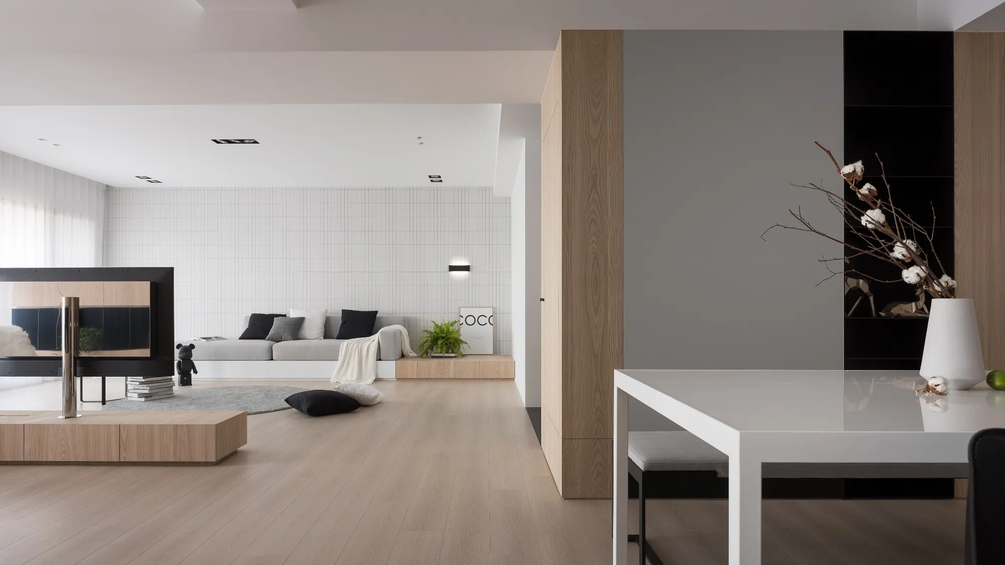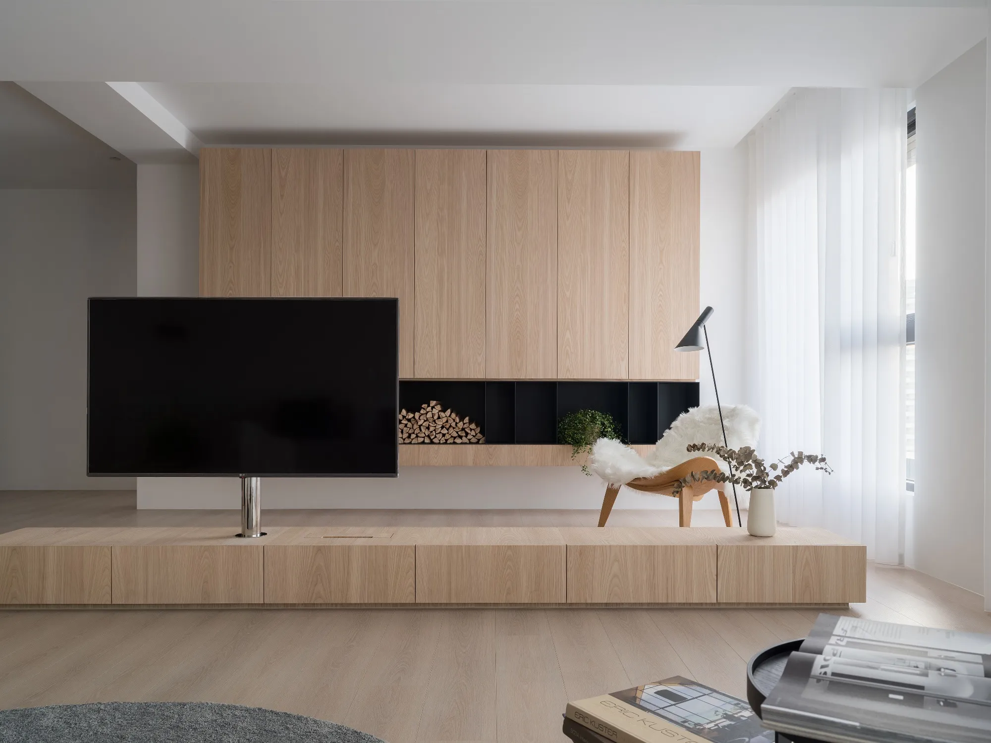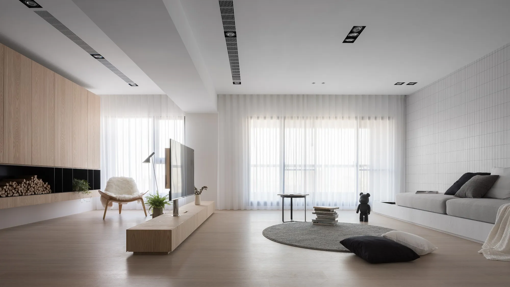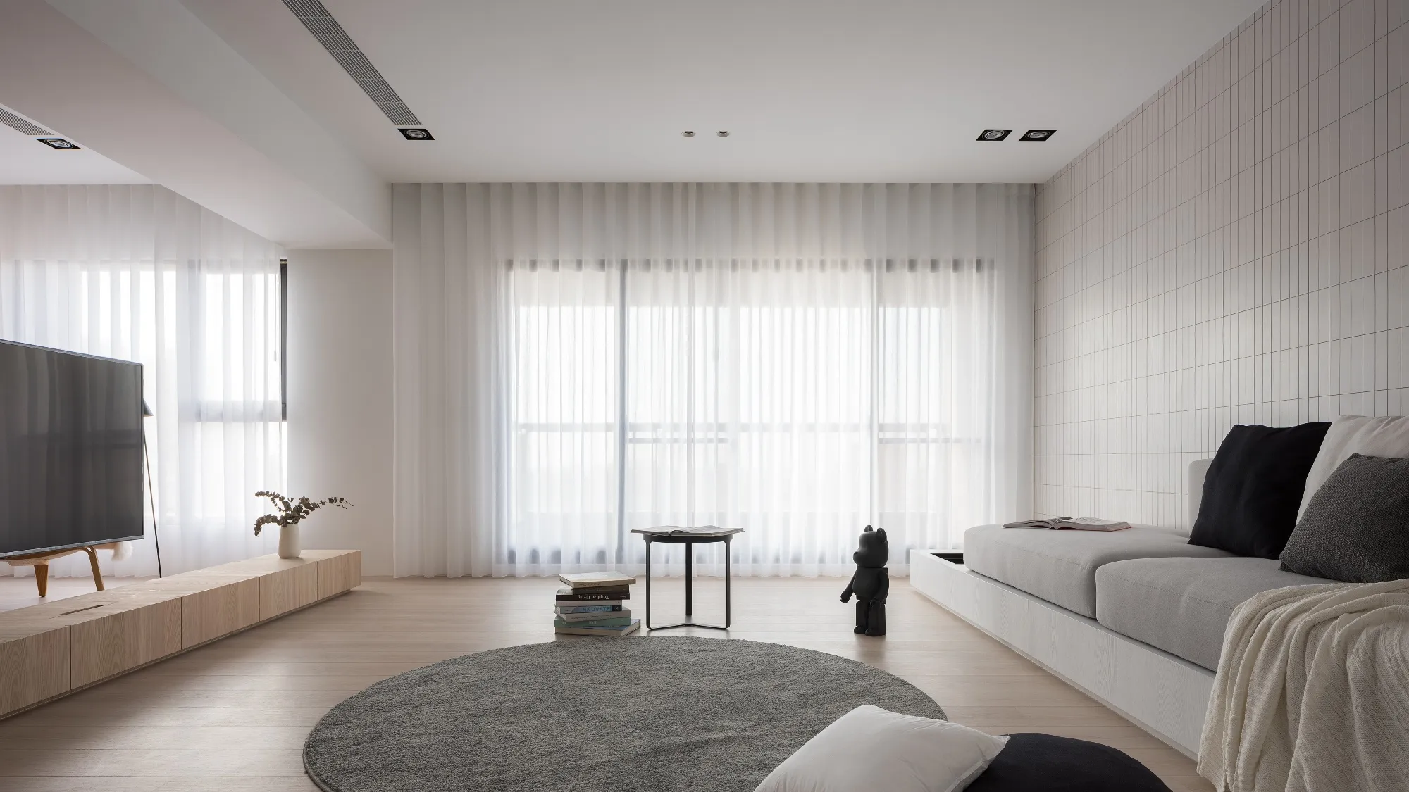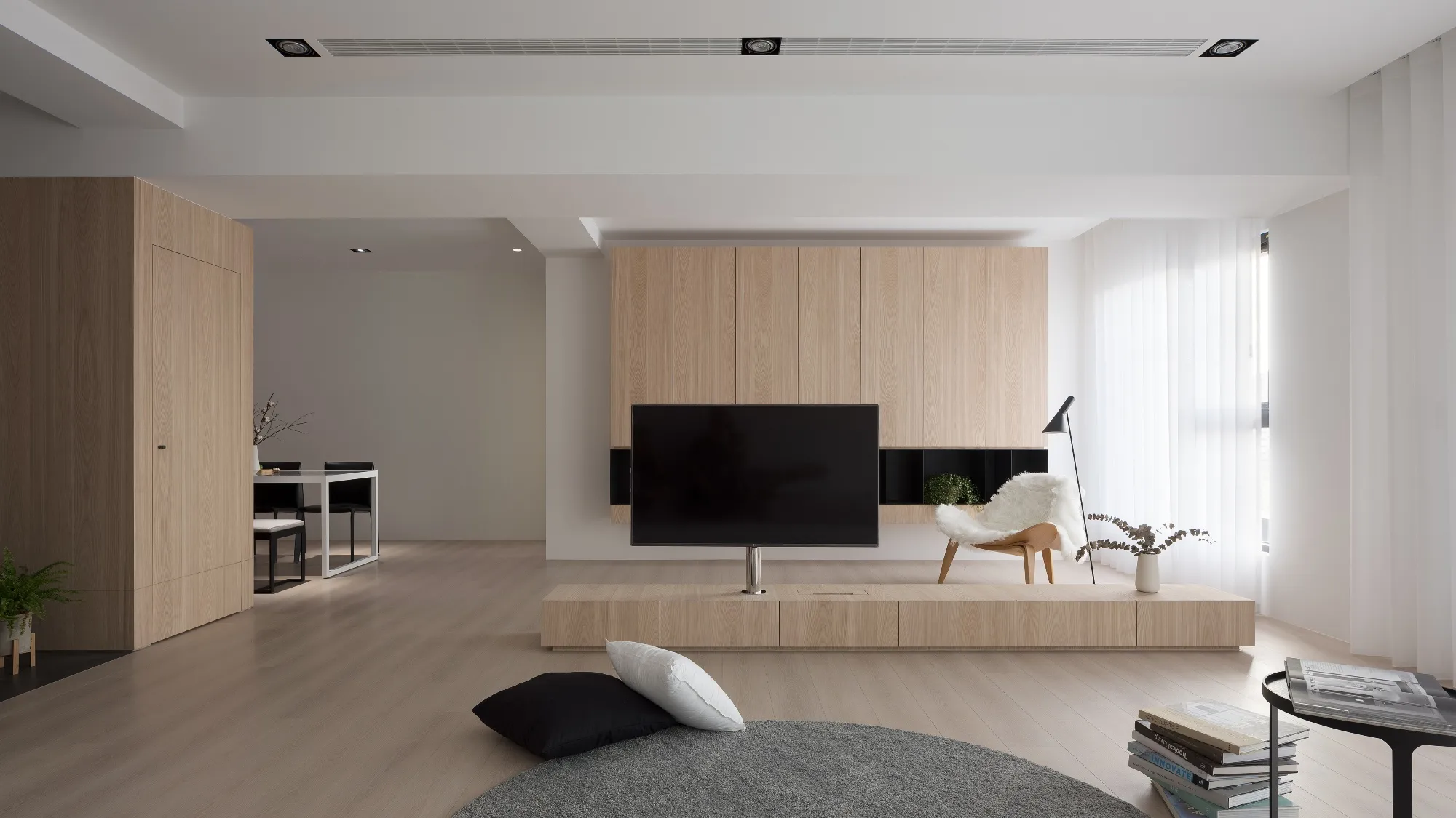 Benefiting from an abundance of natural light, this project emphasizes a design language built on warm wood veneer paired with pure white tiled walls. The natural warmth of wood replaces the coldness of stone, bringing out the material’s textures and grain, allowing the space to return to its essence. This thoughtful material selection reshapes the spatial atmosphere, allowing sunlight to softly cling to surfaces and infuse the home with a gentle and welcoming warmth. The result is a pressure-free, relaxed living environment that integrates design seamlessly into everyday life.In terms of color palette, the homeowners preferred a warm and soft visual tone, while also prioritizing home safety and open sightlines. The design avoids sharp corners and vivid colors to a safer living room environment for their child, further enhancing the spacious and comfortable quality of the shared living space.The designer focused on spatial functionality by employing a subtractive design approach—reducing mass and visual weight—tailoring the space to the clients’ lifestyle while creating fluid circulation. The warmth of the wood veneer, combined with clean white tiled walls, fosters a sense of ease and effortlessness—this design has been shaped to become their future daily reality.Stylistically, the materials and colors are soft and understated. The clean white interior pairs naturally with wood tones, creating a bright, simple, and unembellished living environment. Functional elements are blended into the overall space, while preserving its minimalist and essential character.The bedroom continues the visual and emotional tone set by the living room. Rounded furniture edges replace harsh angles to a more peaceful and balanced environment. Pale natural wood tones are highlighted throughout, evoking an unrefined, organic warmth. The tranquil atmosphere merges with sunlight and soft neutral tones, creating a space that is harmonious and serene.Spatial zoning is subtly delineated through changes in flooring material: the entrance and private zones are finished with stone tiles, while the living room, study, and dining area feature continuous solid wood flooring. To integrate the public areas into a unified whole, the designer implemented a rotating TV wall—a non-traditional yet highly functional solution. This not only emphasizes clean lines but also allows for effortless movement throughout the space, visually expanding the public area. The large floor-to-ceiling windows in the living room channel sunlight deep into the interior, bringing natural light even into the kitchen, which lacks direct exposure. This allows light and views to flow seamlessly, creating an infinite and immersive sense of openness.Situated in the heart of the city near a metro station, the residence offers both urban convenience and a peaceful retreat. The apartment’s spacious layout and exceptional natural lighting imbue the space with a relaxed and leisurely ambiance, allowing its occupants to enjoy a slower, more intentional pace of life.Furniture is curated with a neutral color scheme, complemented by light wood finishes. Built-in cabinetry is finished in white lacquer, with soft wood textures adding a sense of warmth. Linear divisions outline the architectural massing and enhance the three-dimensional feel of the space, resulting in a minimal yet impactful spatial presence.In the guest room, a curved ceiling was designed to soften the visual impact of structural beams, creating a sculptural and flowing form. This feature also extends the visual lines of the space. A single wall finished with concrete-effect plaster serves as a muted backdrop, echoing the natural tones of the wood and further enhanced by streaming sunlight. The effect is one of understated tranquility and ease.Taking advantage of the expansive natural lighting, warm off-white floor-to-ceiling sheers diffuse the sunlight, while accent lighting is strategically placed throughout the home. The designer also uses point lighting to reveal the subtle textures and expressions of various materials, adding layers of visual depth to the living room. With the interplay between natural daylight and multiple points of illumination, the visual rhythm of the space becomes rich and varied.Furniture pieces are selected for both simplicity and character, standing out as distinctive elements that enrich the overall composition. This creates a cohesive and harmonious visual narrative—one that is clean, elegant, and effortless.