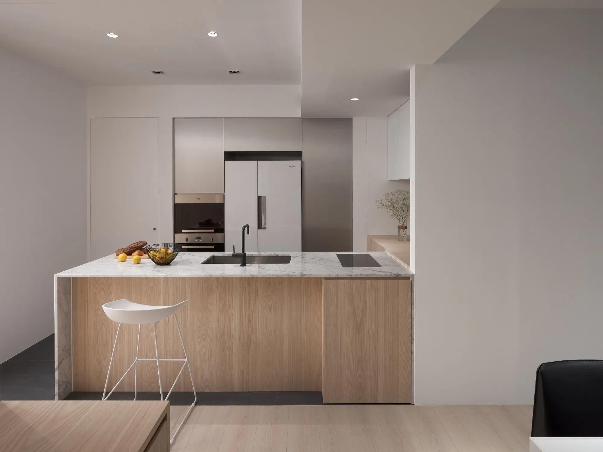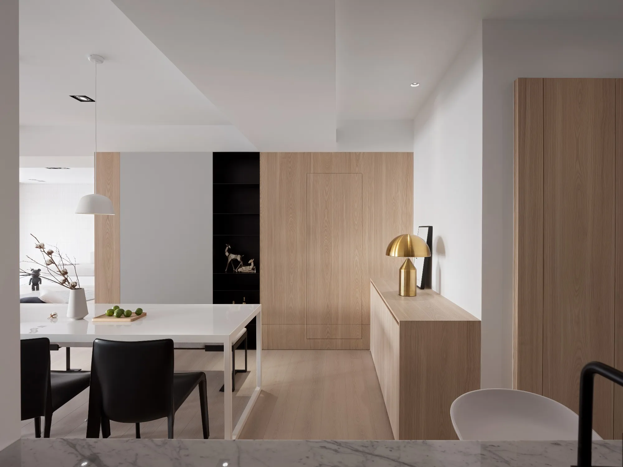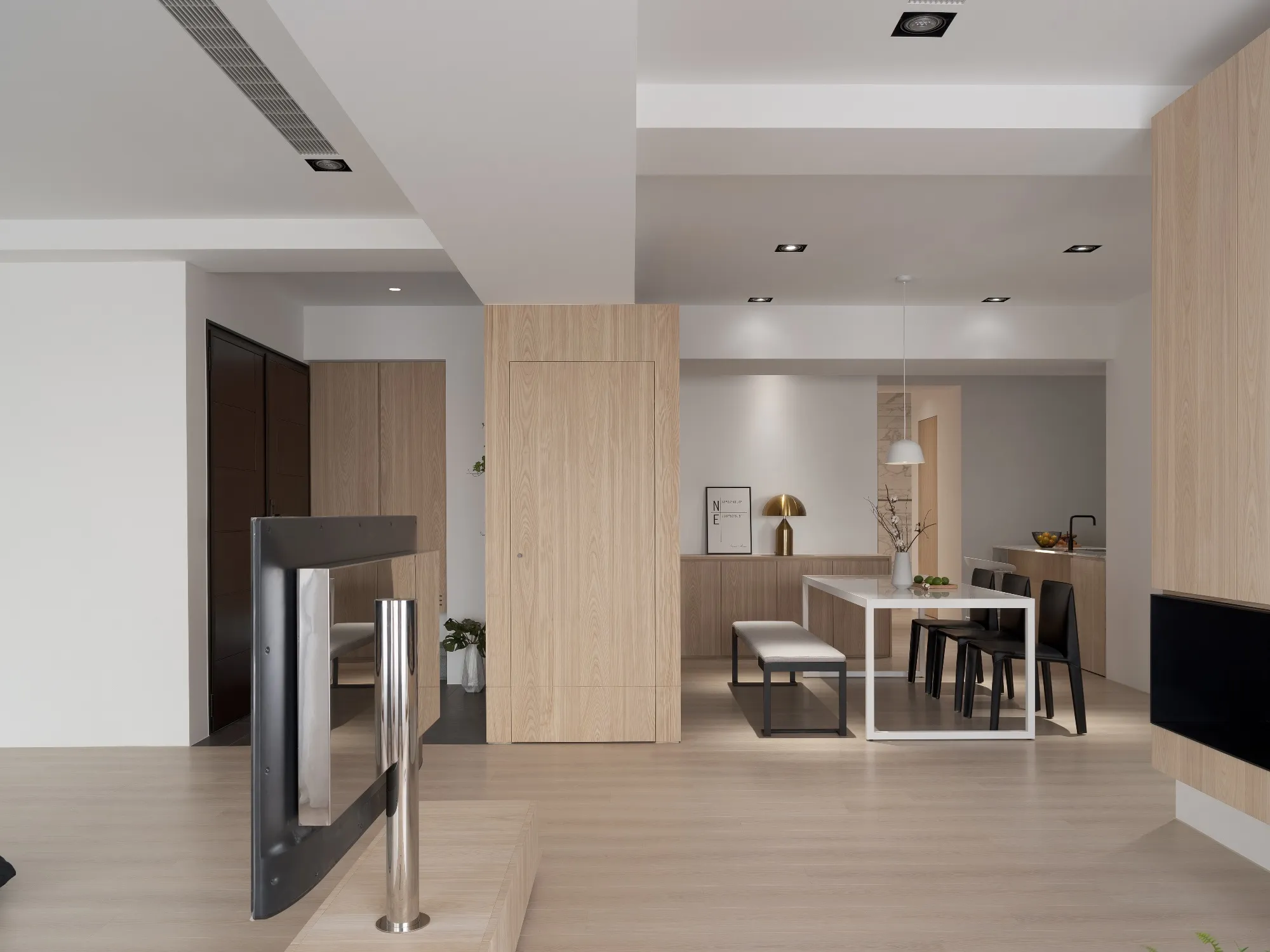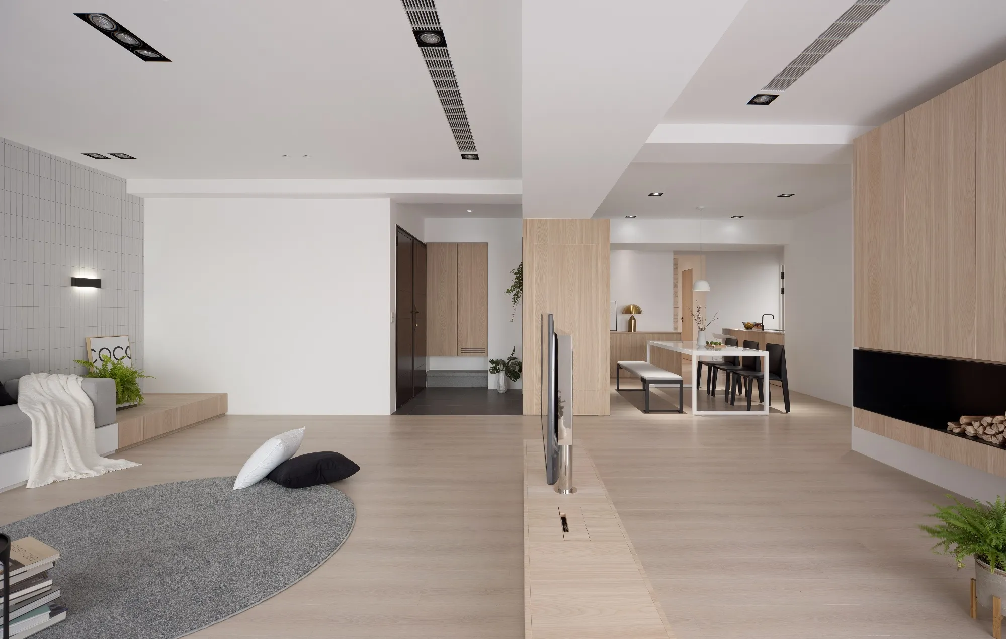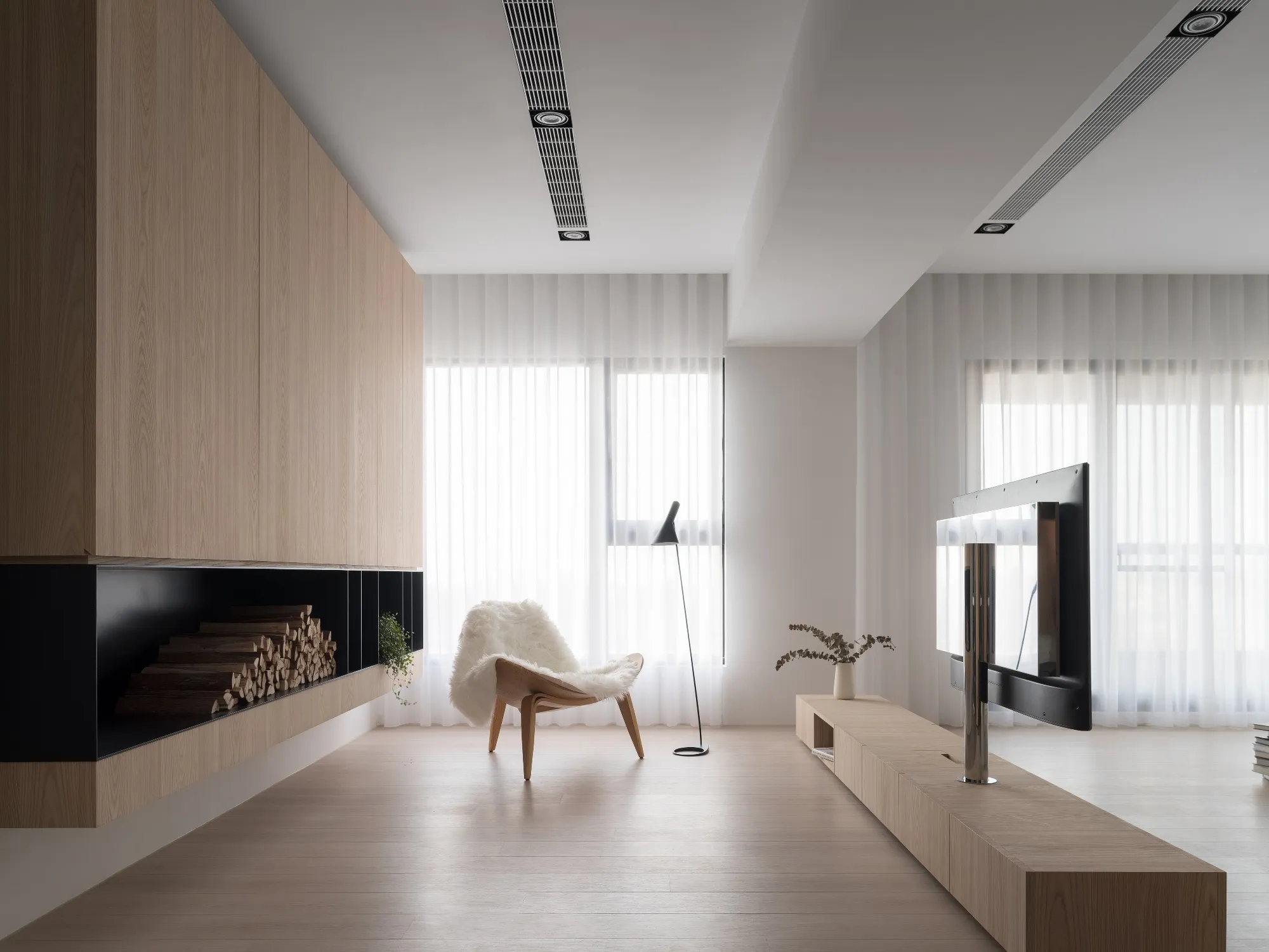 Benefiting from an abundance of natural light, this project emphasizes a design language built on warm wood veneer paired with pure white tiled walls. The natural warmth of wood replaces the coldness of stone, bringing out the material’s textures and grain, allowing the space to return to its essence. This thoughtful material selection reshapes the spatial atmosphere, allowing sunlight to softly cling to surfaces and infuse the home with a gentle and welcoming warmth. The result is a pressure-free, relaxed living environment that integrates design seamlessly into everyday life.In terms of color palette, the homeowners preferred a warm and soft visual tone, while also prioritizing home safety and open sightlines. The design avoids sharp corners and vivid colors to a safer living room environment for their child, further enhancing the spacious and comfortable quality of the shared living space.The designer focused on spatial functionality by employing a subtractive design approach—reducing mass and visual weight—tailoring the space to the clients’ lifestyle while creating fluid circulation. The warmth of the wood veneer, combined with clean white tiled walls, fosters a sense of ease and effortlessness—this design has been shaped to become their future daily reality.Stylistically, the materials and colors are soft and understated. The clean white interior pairs naturally with wood tones, creating a bright, simple, and unembellished living environment. Functional elements are blended into the overall space, while preserving its minimalist and essential character.The bedroom continues the visual and emotional tone set by the living room. Rounded furniture edges replace harsh angles to a more peaceful and balanced environment. Pale natural wood tones are highlighted throughout, evoking an unrefined, organic warmth. The tranquil atmosphere merges with sunlight and soft neutral tones, creating a space that is harmonious and serene.Spatial zoning is subtly delineated through changes in flooring material: the entrance and private zones are finished with stone tiles, while the living room, study, and dining area feature continuous solid wood flooring. To integrate the public areas into a unified whole, the designer implemented a rotating TV wall—a non-traditional yet highly functional solution. This not only emphasizes clean lines but also allows for effortless movement throughout the space, visually expanding the public area. The large floor-to-ceiling windows in the living room channel sunlight deep into the interior, bringing natural light even into the kitchen, which lacks direct exposure. This allows light and views to flow seamlessly, creating an infinite and immersive sense of openness.Situated in the heart of the city near a metro station, the residence offers both urban convenience and a peaceful retreat. The apartment’s spacious layout and exceptional natural lighting imbue the space with a relaxed and leisurely ambiance, allowing its occupants to enjoy a slower, more intentional pace of life.Furniture is curated with a neutral color scheme, complemented by light wood finishes. Built-in cabinetry is finished in white lacquer, with soft wood textures adding a sense of warmth. Linear divisions outline the architectural massing and enhance the three-dimensional feel of the space, resulting in a minimal yet impactful spatial presence.In the guest room, a curved ceiling was designed to soften the visual impact of structural beams, creating a sculptural and flowing form. This feature also extends the visual lines of the space. A single wall finished with concrete-effect plaster serves as a muted backdrop, echoing the natural tones of the wood and further enhanced by streaming sunlight. The effect is one of understated tranquility and ease.Taking advantage of the expansive natural lighting, warm off-white floor-to-ceiling sheers diffuse the sunlight, while accent lighting is strategically placed throughout the home. The designer also uses point lighting to reveal the subtle textures and expressions of various materials, adding layers of visual depth to the living room. With the interplay between natural daylight and multiple points of illumination, the visual rhythm of the space becomes rich and varied.Furniture pieces are selected for both simplicity and character, standing out as distinctive elements that enrich the overall composition. This creates a cohesive and harmonious visual narrative—one that is clean, elegant, and effortless.