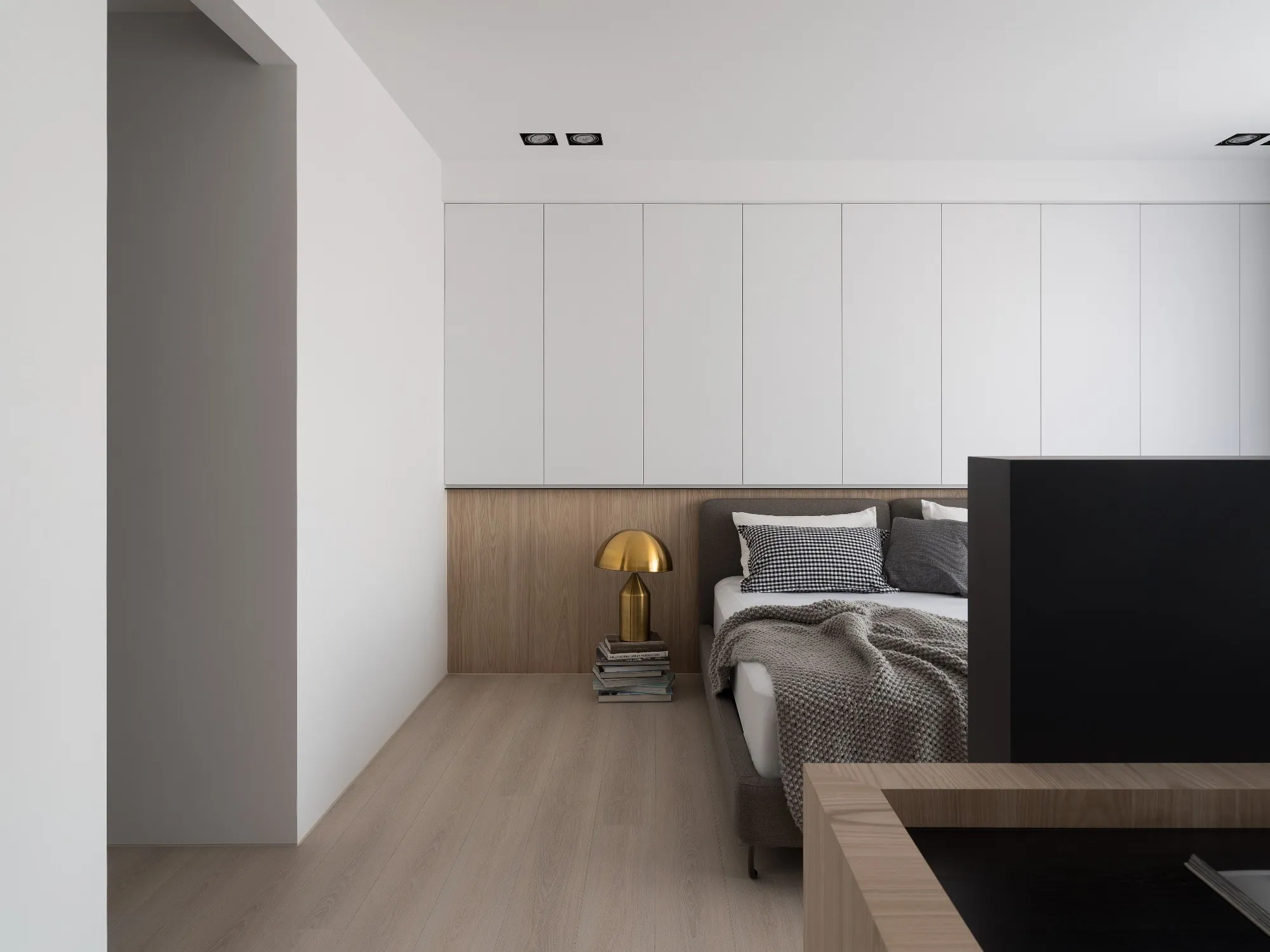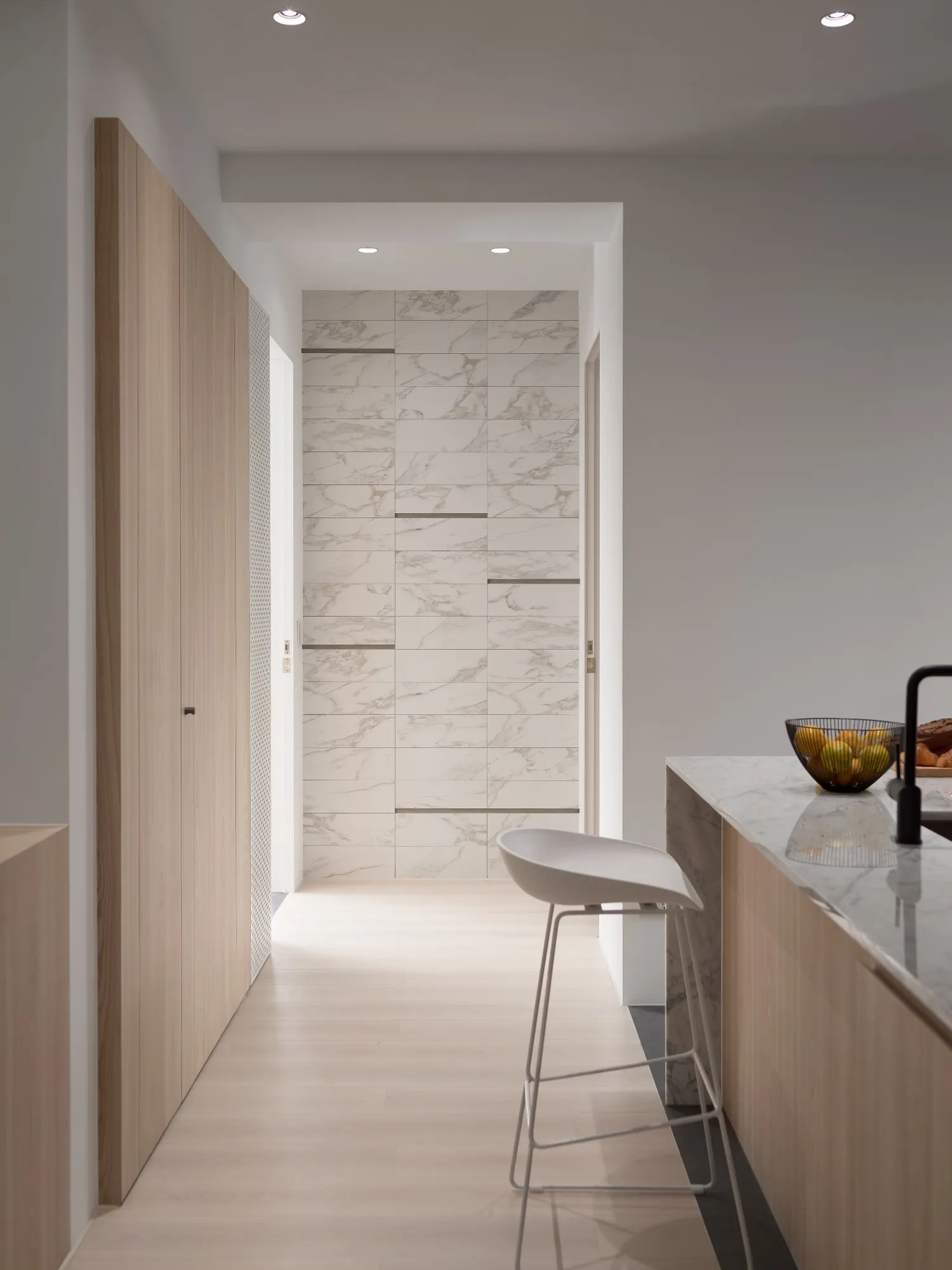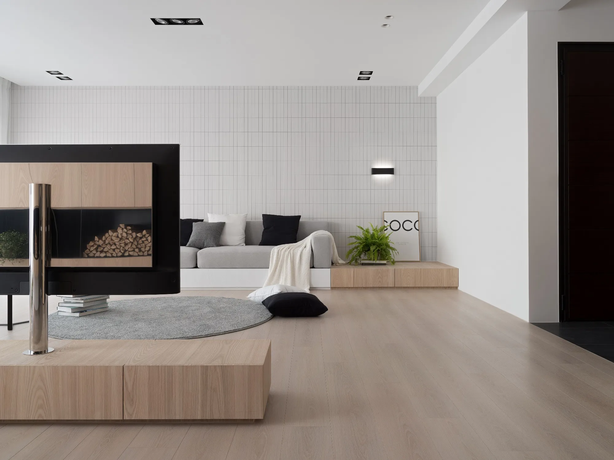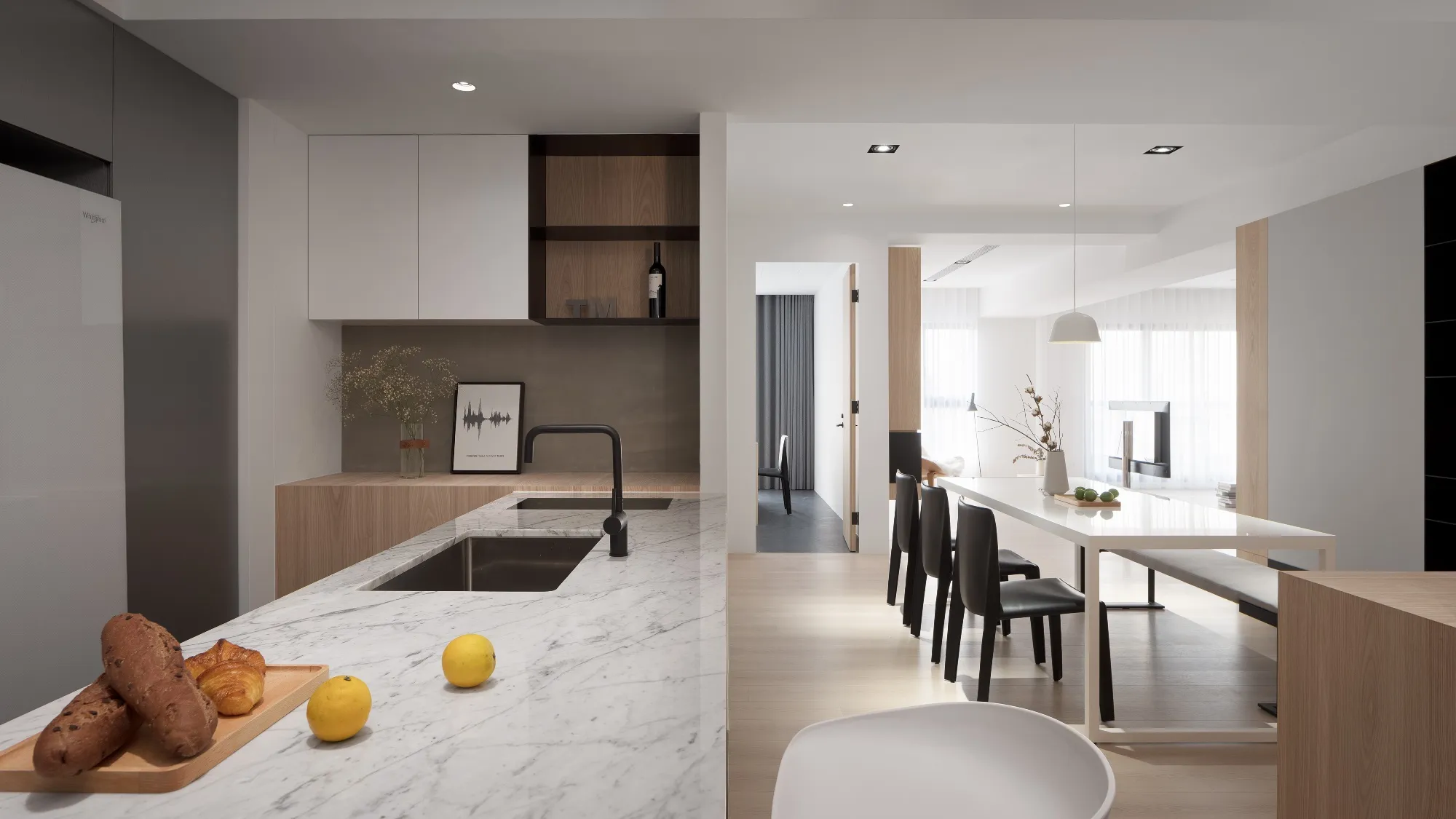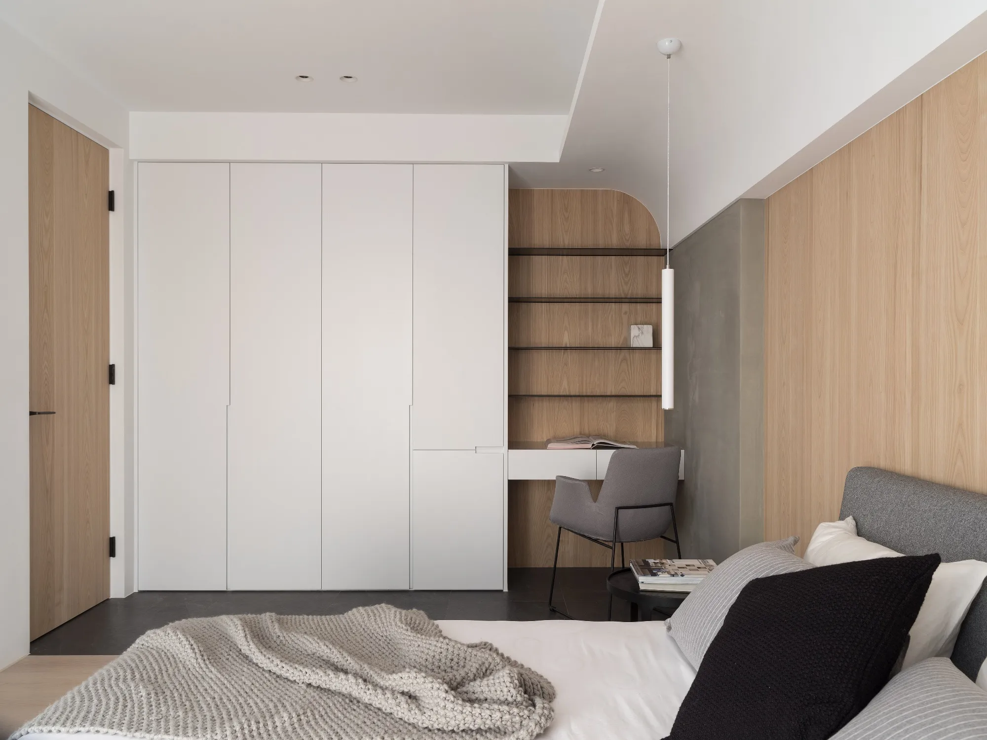 Benefiting from an abundance of natural light, this project emphasizes a design language built on warm wood veneer paired with pure white tiled walls. The natural warmth of wood replaces the coldness of stone, bringing out the material’s textures and grain, allowing the space to return to its essence. This thoughtful material selection reshapes the spatial atmosphere, allowing sunlight to softly cling to surfaces and infuse the home with a gentle and welcoming warmth. The result is a pressure-free, relaxed living environment that integrates design seamlessly into everyday life.In terms of color palette, the homeowners preferred a warm and soft visual tone, while also prioritizing home safety and open sightlines. The design avoids sharp corners and vivid colors to a safer living room environment for their child, further enhancing the spacious and comfortable quality of the shared living space.The designer focused on spatial functionality by employing a subtractive design approach—reducing mass and visual weight—tailoring the space to the clients’ lifestyle while creating fluid circulation. The warmth of the wood veneer, combined with clean white tiled walls, fosters a sense of ease and effortlessness—this design has been shaped to become their future daily reality.Stylistically, the materials and colors are soft and understated. The clean white interior pairs naturally with wood tones, creating a bright, simple, and unembellished living environment. Functional elements are blended into the overall space, while preserving its minimalist and essential character.The bedroom continues the visual and emotional tone set by the living room. Rounded furniture edges replace harsh angles to a more peaceful and balanced environment. Pale natural wood tones are highlighted throughout, evoking an unrefined, organic warmth. The tranquil atmosphere merges with sunlight and soft neutral tones, creating a space that is harmonious and serene.Spatial zoning is subtly delineated through changes in flooring material: the entrance and private zones are finished with stone tiles, while the living room, study, and dining area feature continuous solid wood flooring. To integrate the public areas into a unified whole, the designer implemented a rotating TV wall—a non-traditional yet highly functional solution. This not only emphasizes clean lines but also allows for effortless movement throughout the space, visually expanding the public area. The large floor-to-ceiling windows in the living room channel sunlight deep into the interior, bringing natural light even into the kitchen, which lacks direct exposure. This allows light and views to flow seamlessly, creating an infinite and immersive sense of openness.Situated in the heart of the city near a metro station, the residence offers both urban convenience and a peaceful retreat. The apartment’s spacious layout and exceptional natural lighting imbue the space with a relaxed and leisurely ambiance, allowing its occupants to enjoy a slower, more intentional pace of life.Furniture is curated with a neutral color scheme, complemented by light wood finishes. Built-in cabinetry is finished in white lacquer, with soft wood textures adding a sense of warmth. Linear divisions outline the architectural massing and enhance the three-dimensional feel of the space, resulting in a minimal yet impactful spatial presence.In the guest room, a curved ceiling was designed to soften the visual impact of structural beams, creating a sculptural and flowing form. This feature also extends the visual lines of the space. A single wall finished with concrete-effect plaster serves as a muted backdrop, echoing the natural tones of the wood and further enhanced by streaming sunlight. The effect is one of understated tranquility and ease.Taking advantage of the expansive natural lighting, warm off-white floor-to-ceiling sheers diffuse the sunlight, while accent lighting is strategically placed throughout the home. The designer also uses point lighting to reveal the subtle textures and expressions of various materials, adding layers of visual depth to the living room. With the interplay between natural daylight and multiple points of illumination, the visual rhythm of the space becomes rich and varied.Furniture pieces are selected for both simplicity and character, standing out as distinctive elements that enrich the overall composition. This creates a cohesive and harmonious visual narrative—one that is clean, elegant, and effortless.