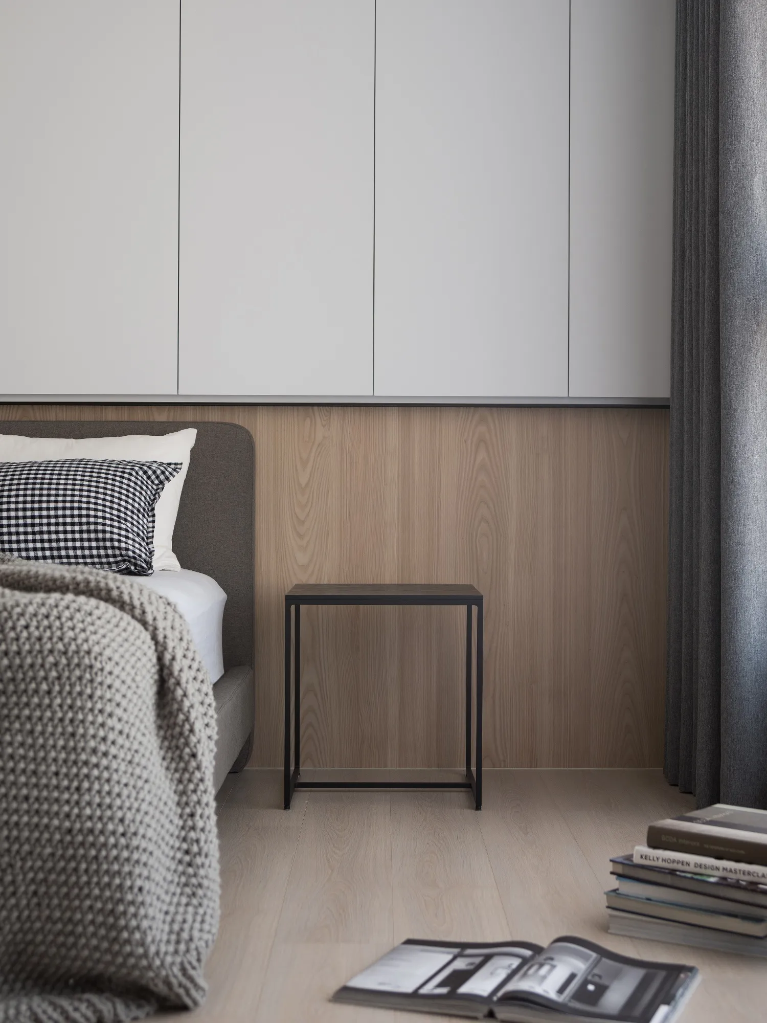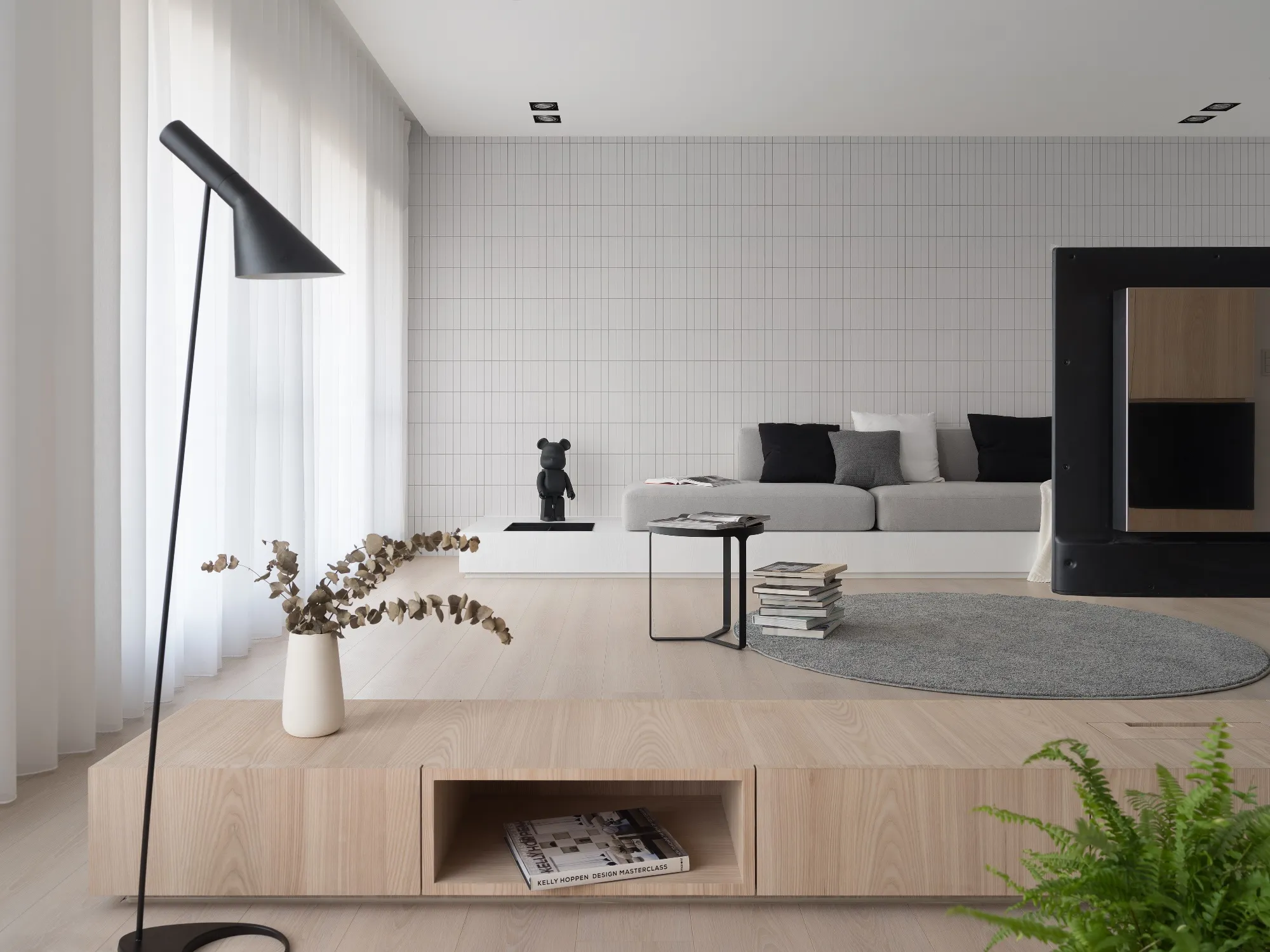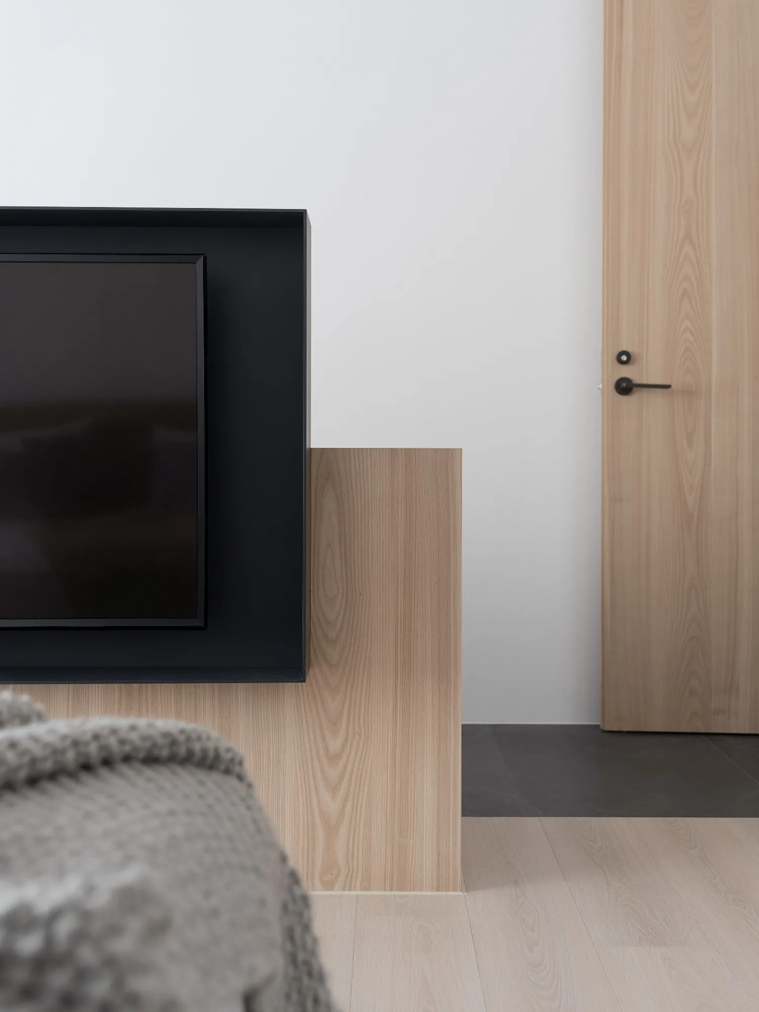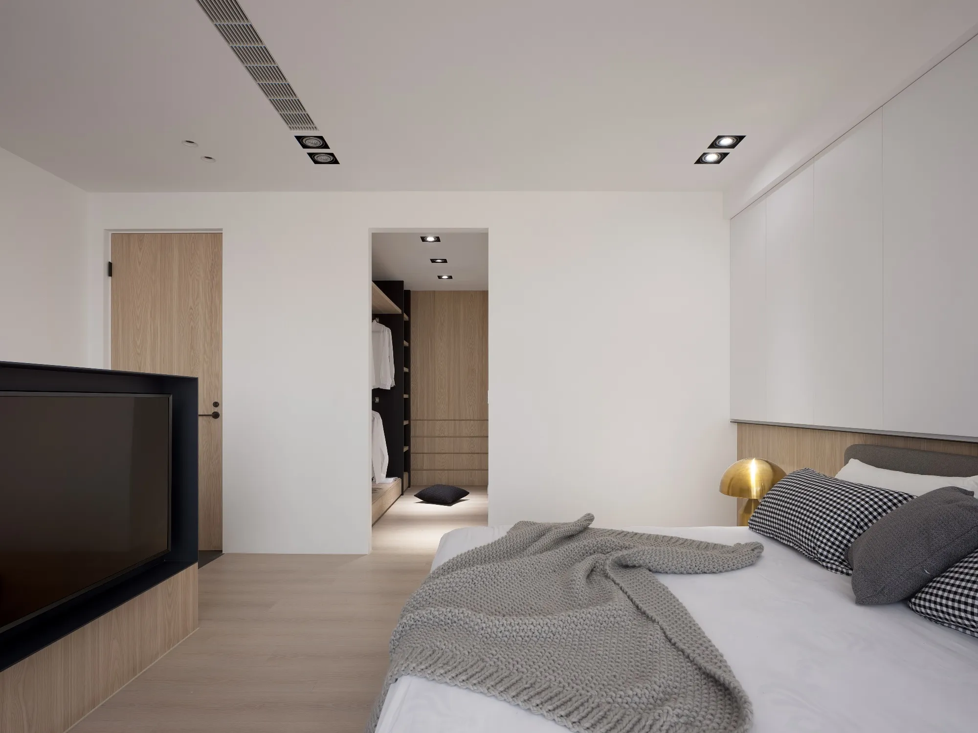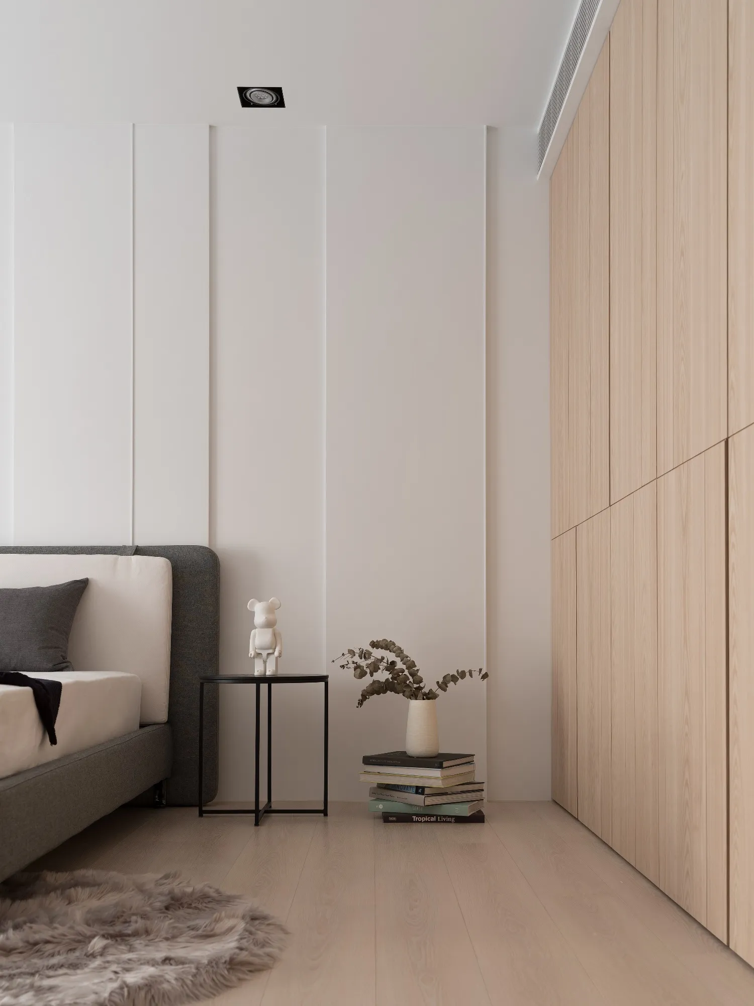 Benefiting from an abundance of natural light, this project emphasizes a design language built on warm wood veneer paired with pure white tiled walls. The natural warmth of wood replaces the coldness of stone, bringing out the material’s textures and grain, allowing the space to return to its essence. This thoughtful material selection reshapes the spatial atmosphere, allowing sunlight to softly cling to surfaces and infuse the home with a gentle and welcoming warmth. The result is a pressure-free, relaxed living environment that integrates design seamlessly into everyday life.In terms of color palette, the homeowners preferred a warm and soft visual tone, while also prioritizing home safety and open sightlines. The design avoids sharp corners and vivid colors to a safer living room environment for their child, further enhancing the spacious and comfortable quality of the shared living space.The designer focused on spatial functionality by employing a subtractive design approach—reducing mass and visual weight—tailoring the space to the clients’ lifestyle while creating fluid circulation. The warmth of the wood veneer, combined with clean white tiled walls, fosters a sense of ease and effortlessness—this design has been shaped to become their future daily reality.Stylistically, the materials and colors are soft and understated. The clean white interior pairs naturally with wood tones, creating a bright, simple, and unembellished living environment. Functional elements are blended into the overall space, while preserving its minimalist and essential character.The bedroom continues the visual and emotional tone set by the living room. Rounded furniture edges replace harsh angles to a more peaceful and balanced environment. Pale natural wood tones are highlighted throughout, evoking an unrefined, organic warmth. The tranquil atmosphere merges with sunlight and soft neutral tones, creating a space that is harmonious and serene.Spatial zoning is subtly delineated through changes in flooring material: the entrance and private zones are finished with stone tiles, while the living room, study, and dining area feature continuous solid wood flooring. To integrate the public areas into a unified whole, the designer implemented a rotating TV wall—a non-traditional yet highly functional solution. This not only emphasizes clean lines but also allows for effortless movement throughout the space, visually expanding the public area. The large floor-to-ceiling windows in the living room channel sunlight deep into the interior, bringing natural light even into the kitchen, which lacks direct exposure. This allows light and views to flow seamlessly, creating an infinite and immersive sense of openness.Situated in the heart of the city near a metro station, the residence offers both urban convenience and a peaceful retreat. The apartment’s spacious layout and exceptional natural lighting imbue the space with a relaxed and leisurely ambiance, allowing its occupants to enjoy a slower, more intentional pace of life.Furniture is curated with a neutral color scheme, complemented by light wood finishes. Built-in cabinetry is finished in white lacquer, with soft wood textures adding a sense of warmth. Linear divisions outline the architectural massing and enhance the three-dimensional feel of the space, resulting in a minimal yet impactful spatial presence.In the guest room, a curved ceiling was designed to soften the visual impact of structural beams, creating a sculptural and flowing form. This feature also extends the visual lines of the space. A single wall finished with concrete-effect plaster serves as a muted backdrop, echoing the natural tones of the wood and further enhanced by streaming sunlight. The effect is one of understated tranquility and ease.Taking advantage of the expansive natural lighting, warm off-white floor-to-ceiling sheers diffuse the sunlight, while accent lighting is strategically placed throughout the home. The designer also uses point lighting to reveal the subtle textures and expressions of various materials, adding layers of visual depth to the living room. With the interplay between natural daylight and multiple points of illumination, the visual rhythm of the space becomes rich and varied.Furniture pieces are selected for both simplicity and character, standing out as distinctive elements that enrich the overall composition. This creates a cohesive and harmonious visual narrative—one that is clean, elegant, and effortless.